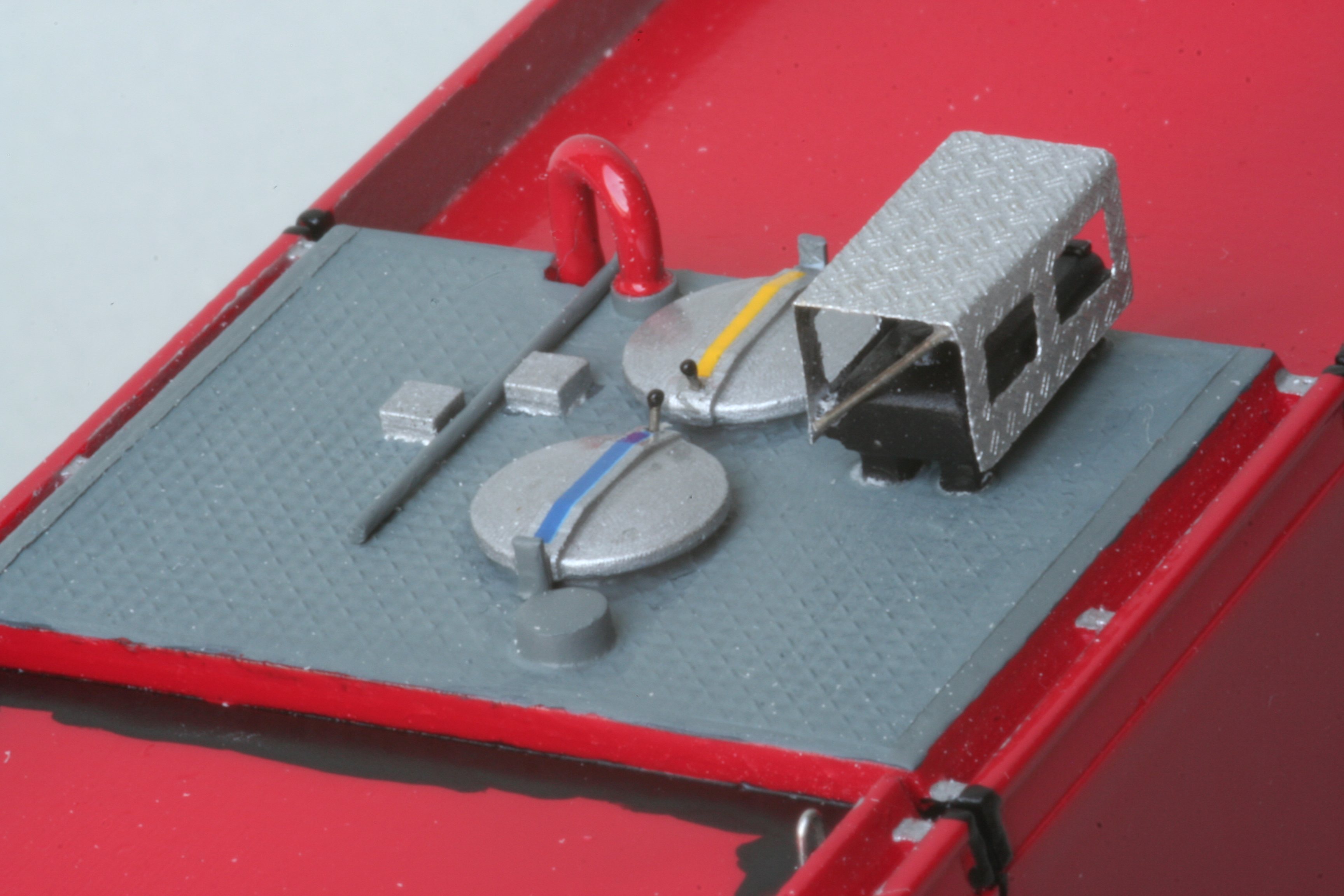 Das mittlere Bild zeigt dann das fast fertige Dach des Tankmoduls. Eine rot lackierte Umrahmung dieses Teils gibt es auch nicht. Der graue Bereich erstreckt sich über die gesamte Teilfläche. Die eigentliche Klimaanlage(das schwarze Teil) habe ich ganz neu erstellt.