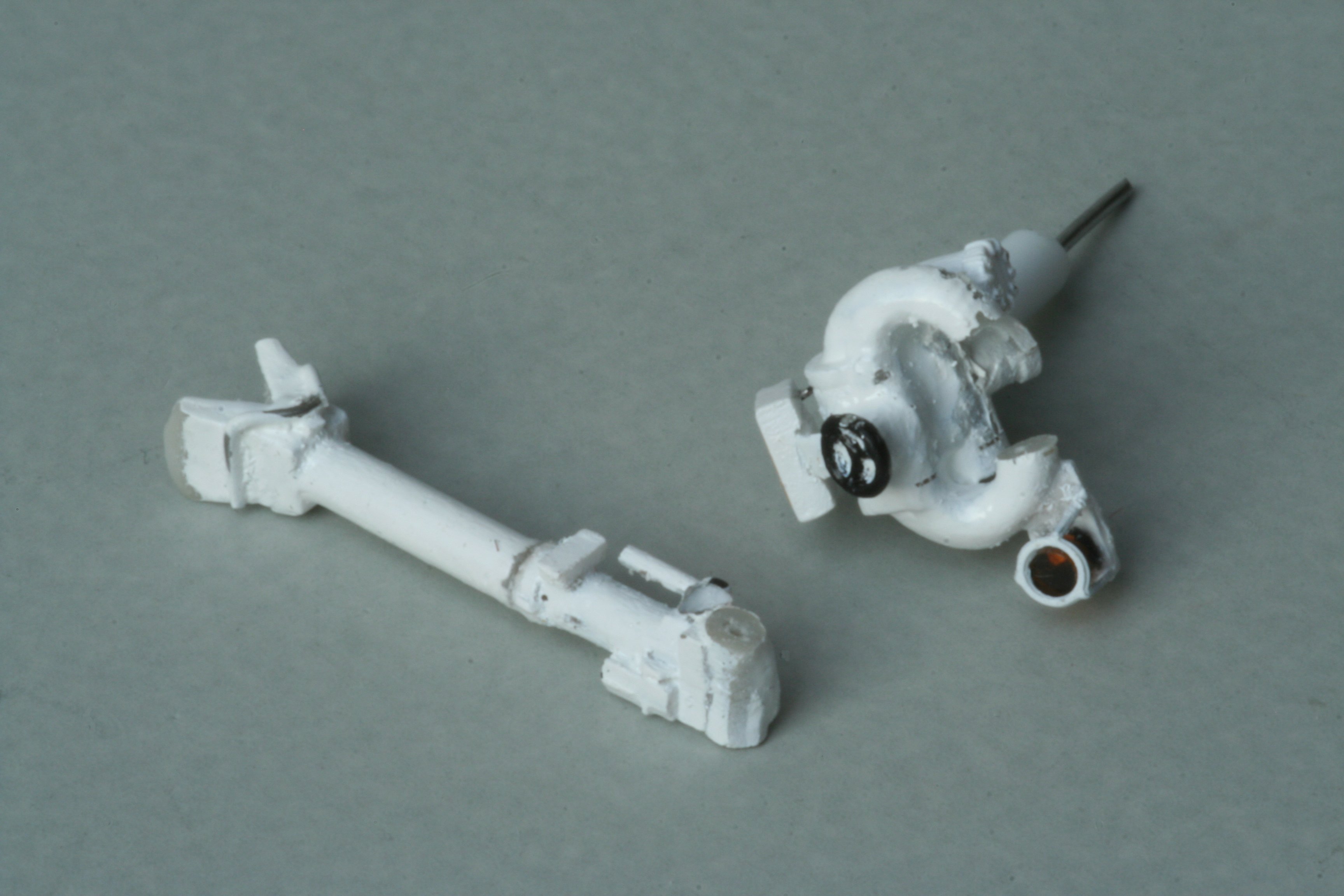 Als ich den fertigen Dachmonitor einbauen wollte, stellte ich fest, dass er zu lang war. Also noch einmal auseinander reißen und kürzen. Und weil ich sowieso dabei war, kam mir dann die Idee, ihn nicht nur drehbar, sondern auch aufrichtbar zu bauen. Also habe ich ihn an den Gelenken abgesägt und dort mittig Löcher gebohrt. Durch diese kam dann von außen durchgeschoben ein Draht. Nun alle bei der Sägeaktion kaputt gegangenen Teile wieder restauriert und angeklebt. Nach der Lackierung der Schadstellen war der Monitor wieder zum Einbau fertig. Das nächste Bild zeigt noch einmal den Längenvergleich mit dem Monitor, wie er im Bausatz beiliegt.