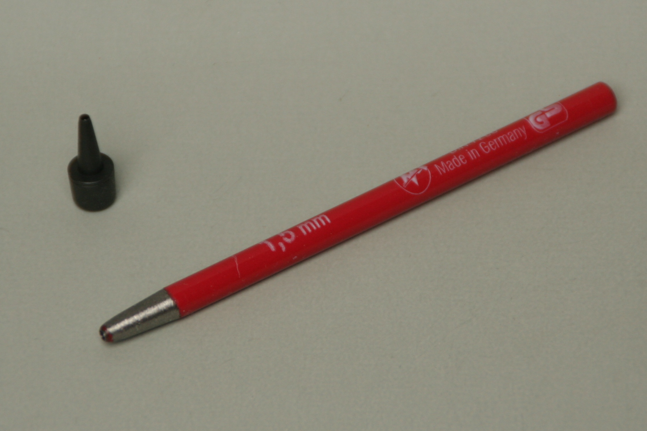 Die Lochzange sollte mir dann eigentlich noch weiter helfen. Die Rückleuchten am Heck sind bei dem Bausatz sehr plastisch ausgearbeitet, liegen aber mitten in den rot-weißen Heckwarnstreifen. Um nicht so viel Weichmacher aufzubringen, wollte ich in diesen Streifendecals an den passenden Stellen Löcher ausstanzen. Leider hatte meine Lochzange kein Werkzeug mit 1,5mm Durchmesser. Also ein Stanzeisen mit 1,5mm in der Bucht erstanden(rot im mittleren Bild). Leider war der Rand so dick, dass ich die Position beim Stanzen nicht genau genug bestimmen konnte. So musste ich mit Farbe etwas korrigieren, siehe rechtes Bild bei der einzelnen Rückleuchte. Für die Dreierkombination sollte das besser werden. Ich habe dann noch ein 1,5mm Werkzeug zum Auswechseln bei einer Revolverlochzange entdeckt. Dieses Werkzeug hatte einen scharf definierten Rand und so ließen sich die anderthalb Löcher im nächsten Decal(im rechten Bild noch nicht aufgebracht) gut platzieren.