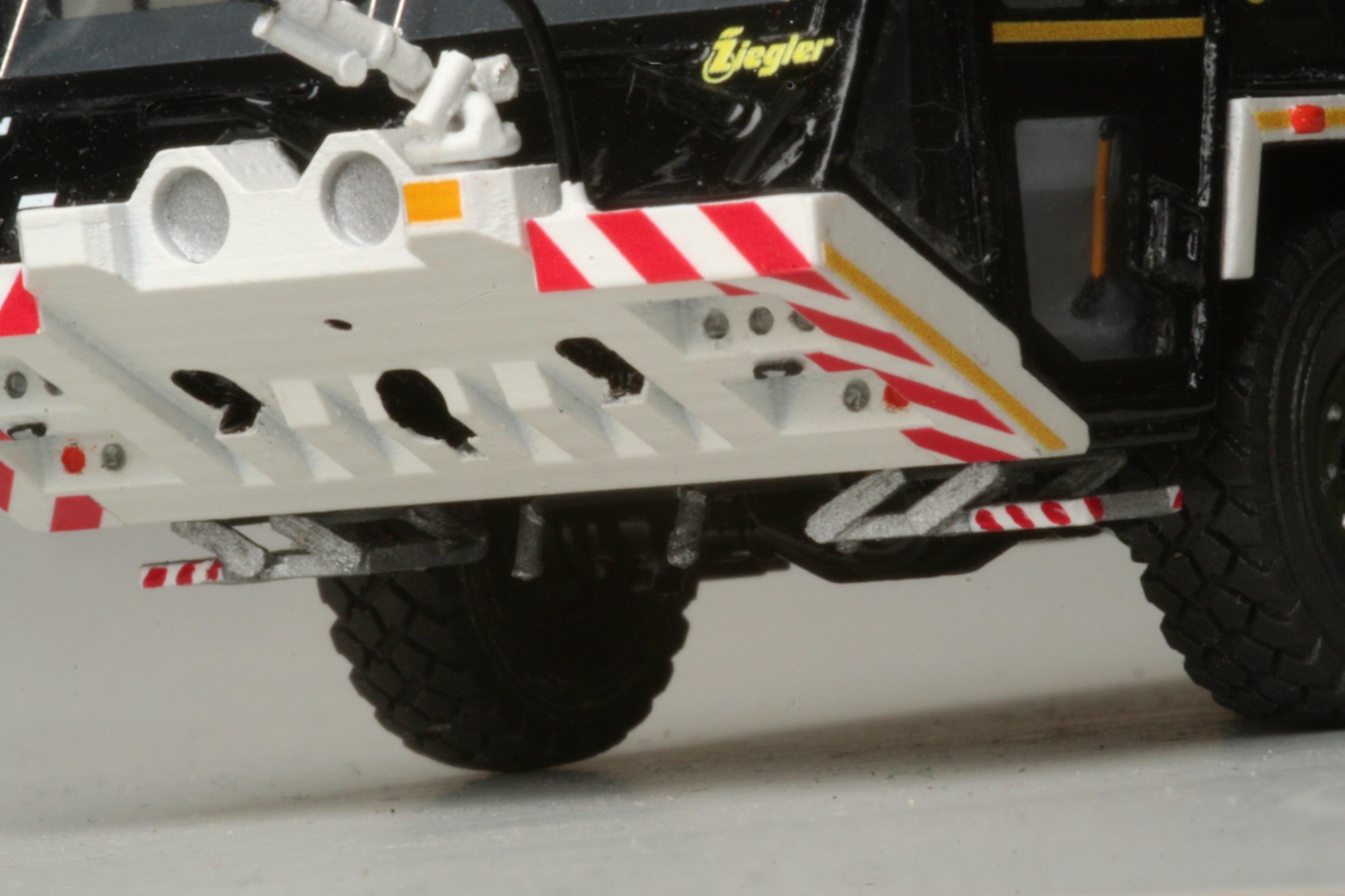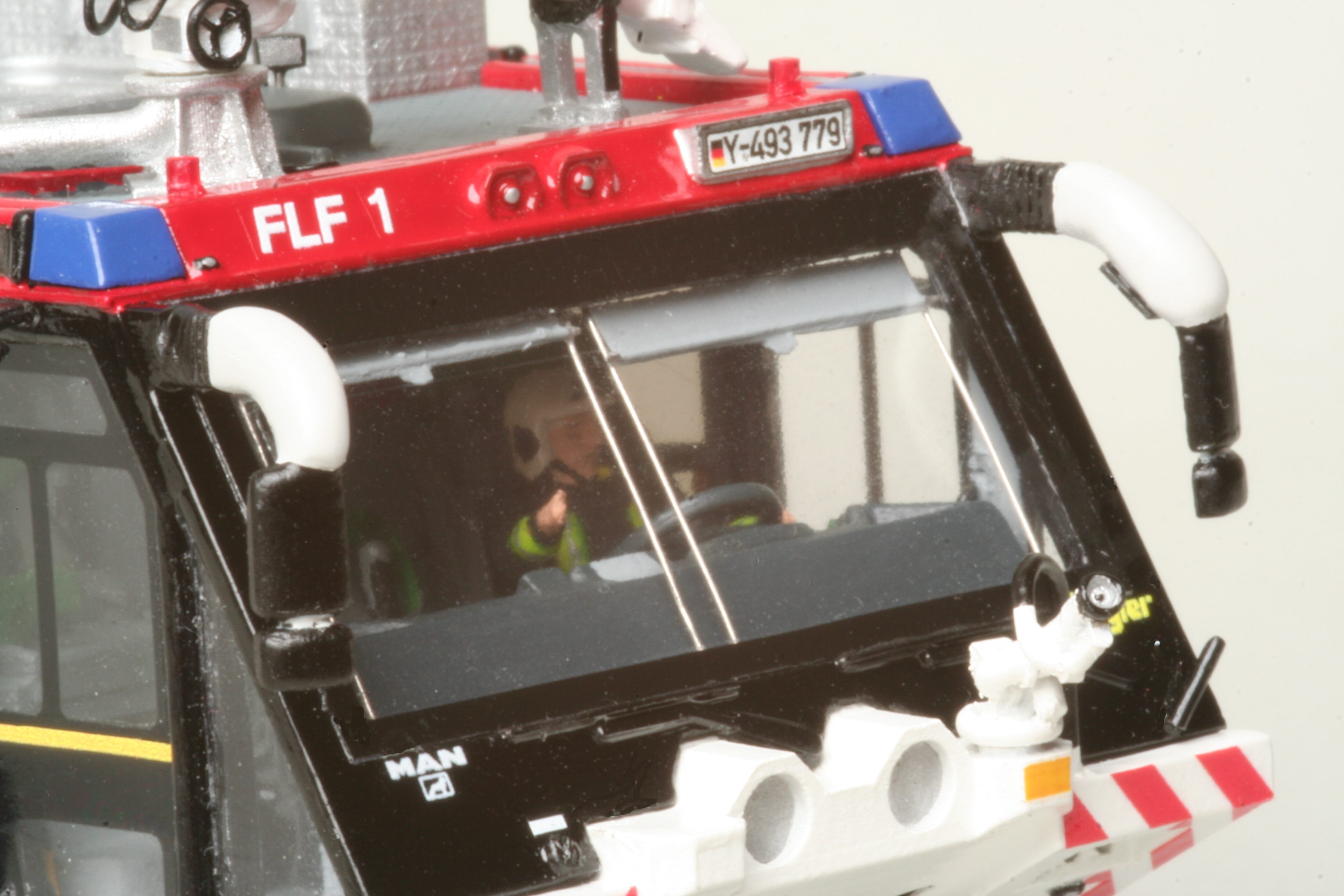 Das Modell hat vorbildgerecht Selbstschutzdüsen unter der Front sowie die klappbaren Einstiegstritte. Die Arme für die Außenspiegel habe ich verbreitert, um die verschiedenen Zusatzspiegel unterbringen zu können. Außerdem habe ich noch eine Fahrerfigur spendiert, damit sich der Dachmonitor nicht von alleine bewegen muss.