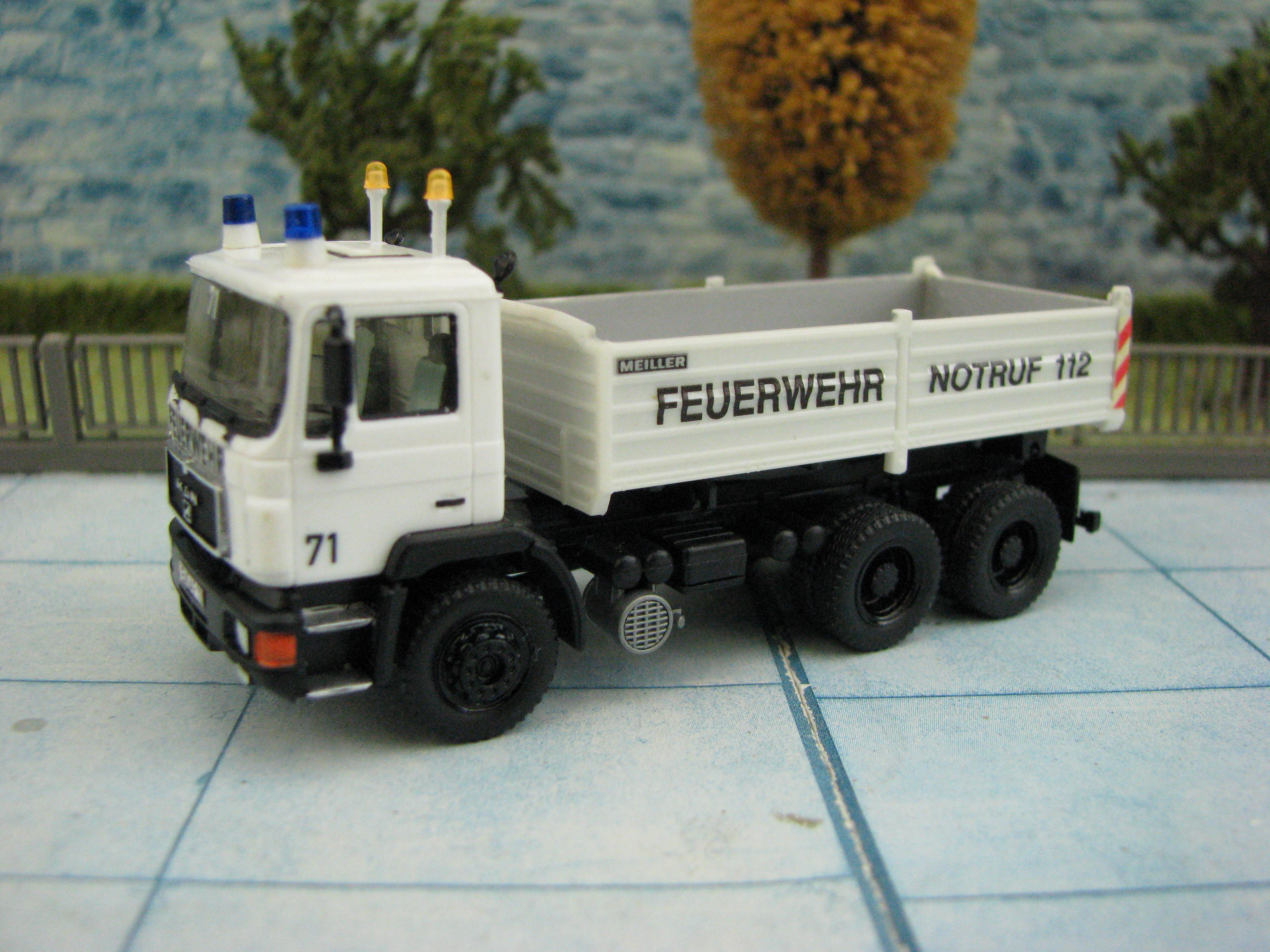 Den Anfang macht ein MAN 24.372 3-Achs Dreiseitenkipper, Aufbau Meiler. Das Fahrzeug dient zum Transport von verschiedenen Schüttgütern oder anderen schweren- und sperrigen Materialien. Meist wird der Kipper bei Unfällen gerufen um die Ladung zu transportieren.