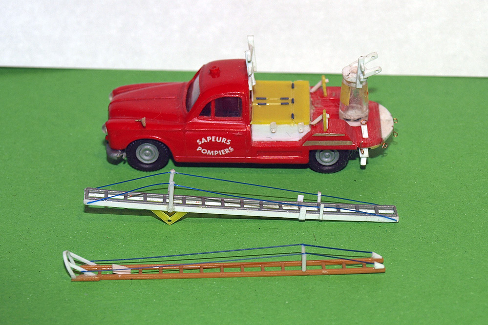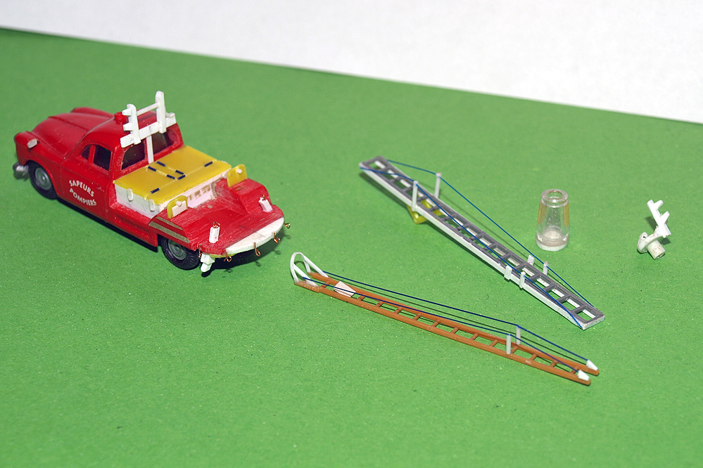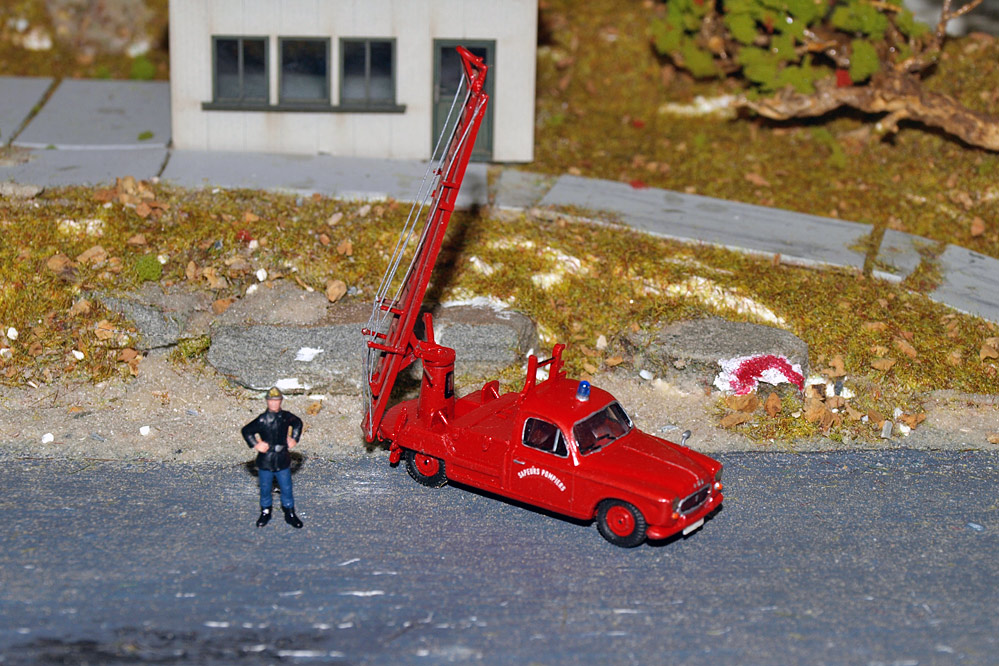 Im Original auf einem Peugeot 403 aufgebaut, hatte die Kleine hinten einen festen Turm, auf dem die Leiter drehbar montiert war.