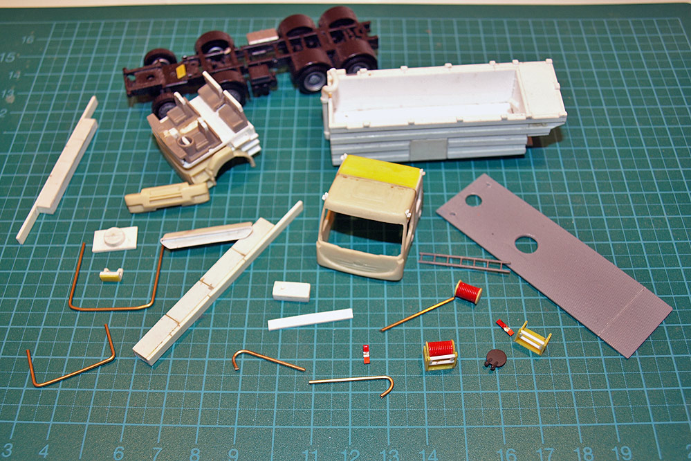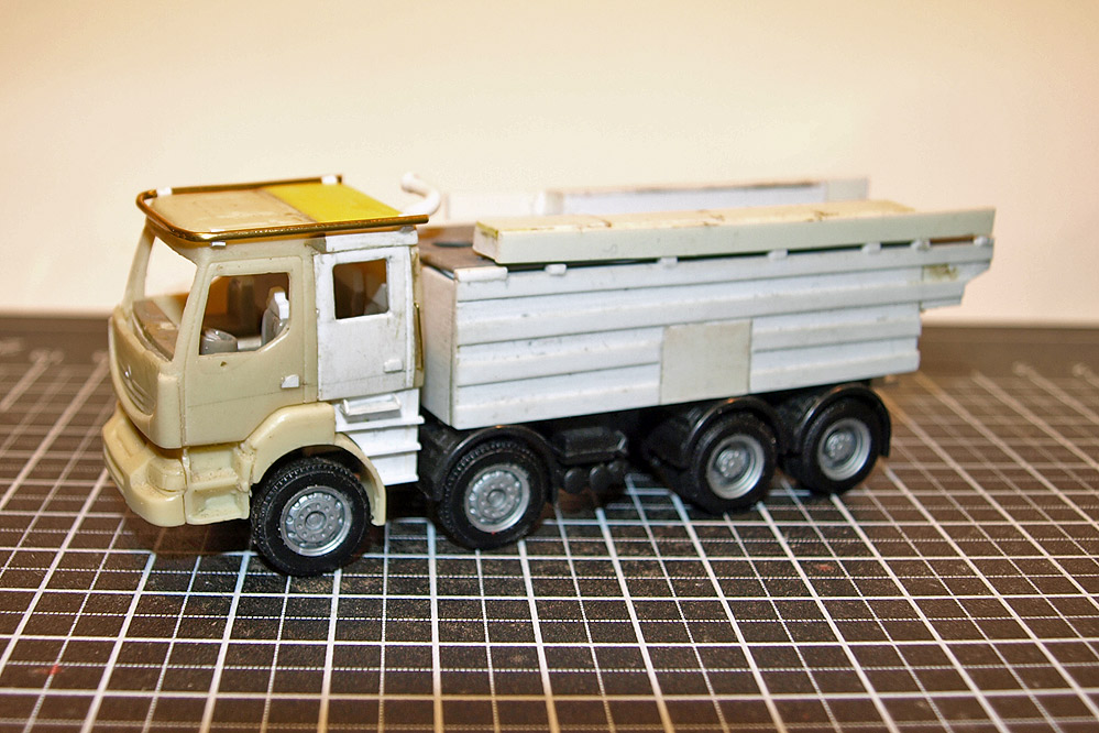 Entstanden ist das Fahrzeug aus einer verlängerten msm Resin Kabinemit Stossstange, einem Herpa Fahrgestell eines Mercedes Baustellenkippers, einer umgebauten Inneneinrichtung eines alten Wiking LF und aus jeder Menge Polysterol und Spachtel.