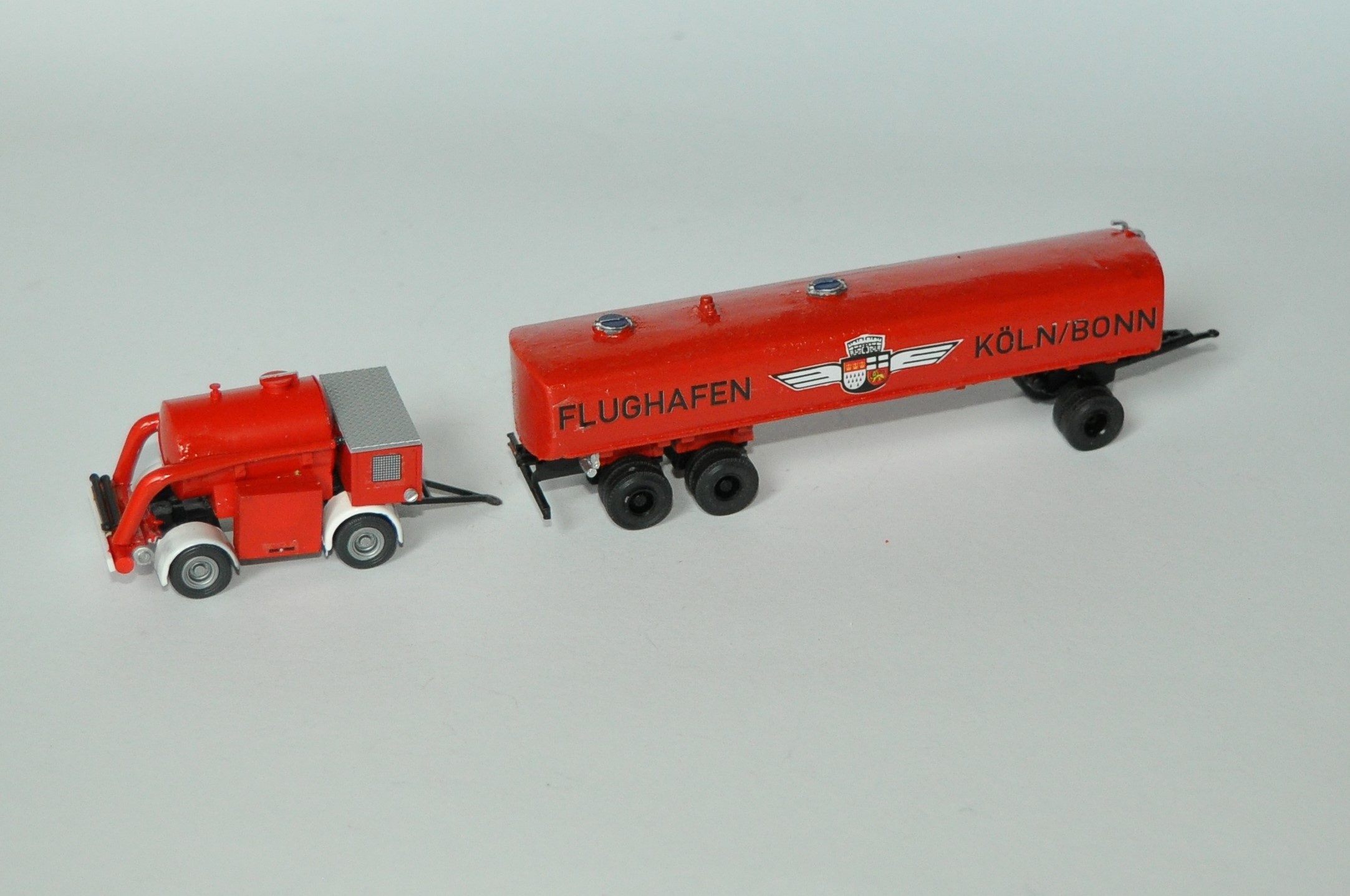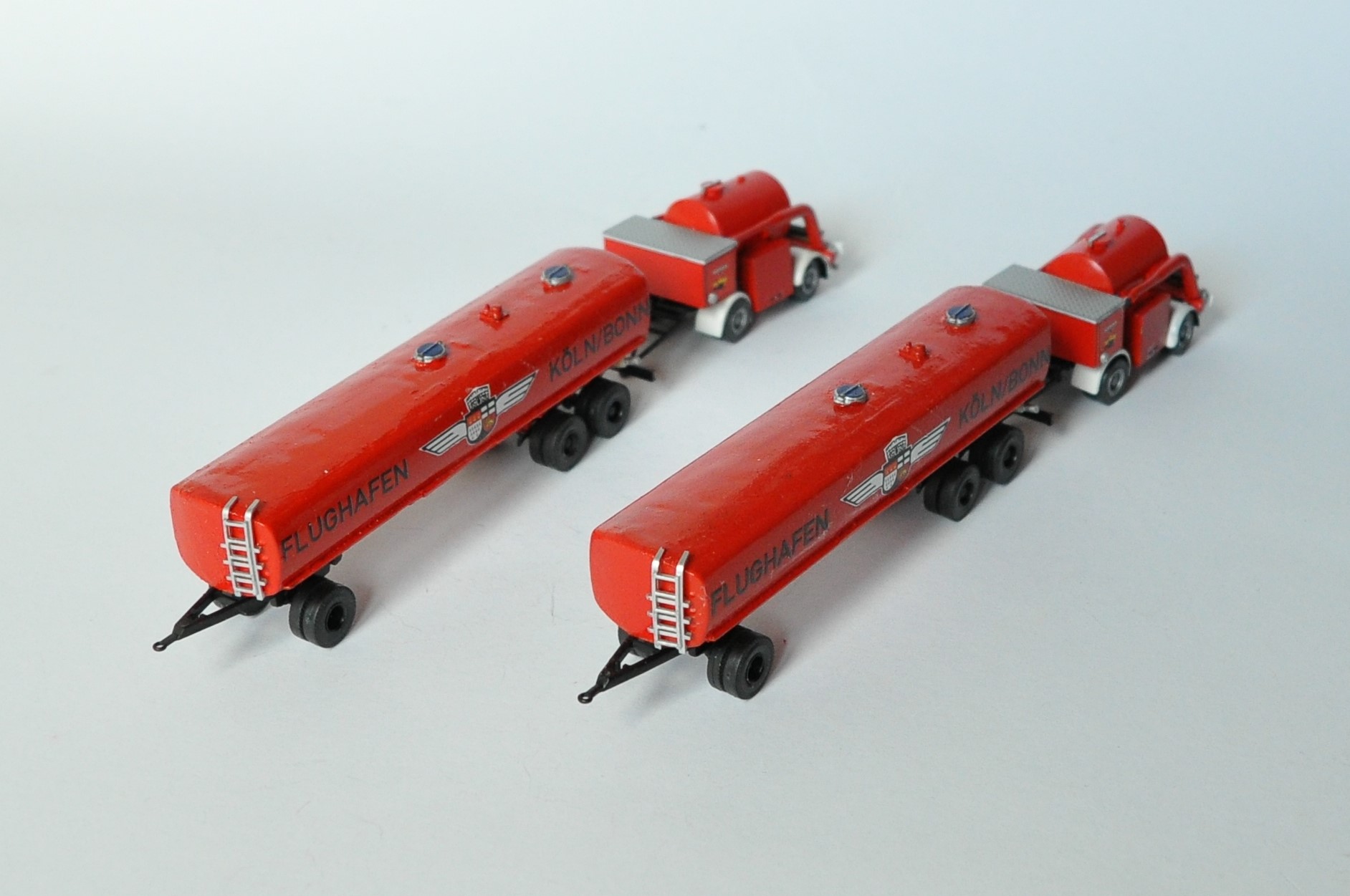Die Modelle basieren auf einer Idee von H.U. Feih aus einer alten BFM-Ausgabe. Die Wasseranhänger sind aus Kibri-Tanksattelzügen entstanden. Die Oberseite wurde abgeschliffen und mit neuen Tankdeckeln/Ventilen versehen. Der Boden wurde ebenfalls geändert und auf zwei weiter hinten gelegene Achsen umgebaut.