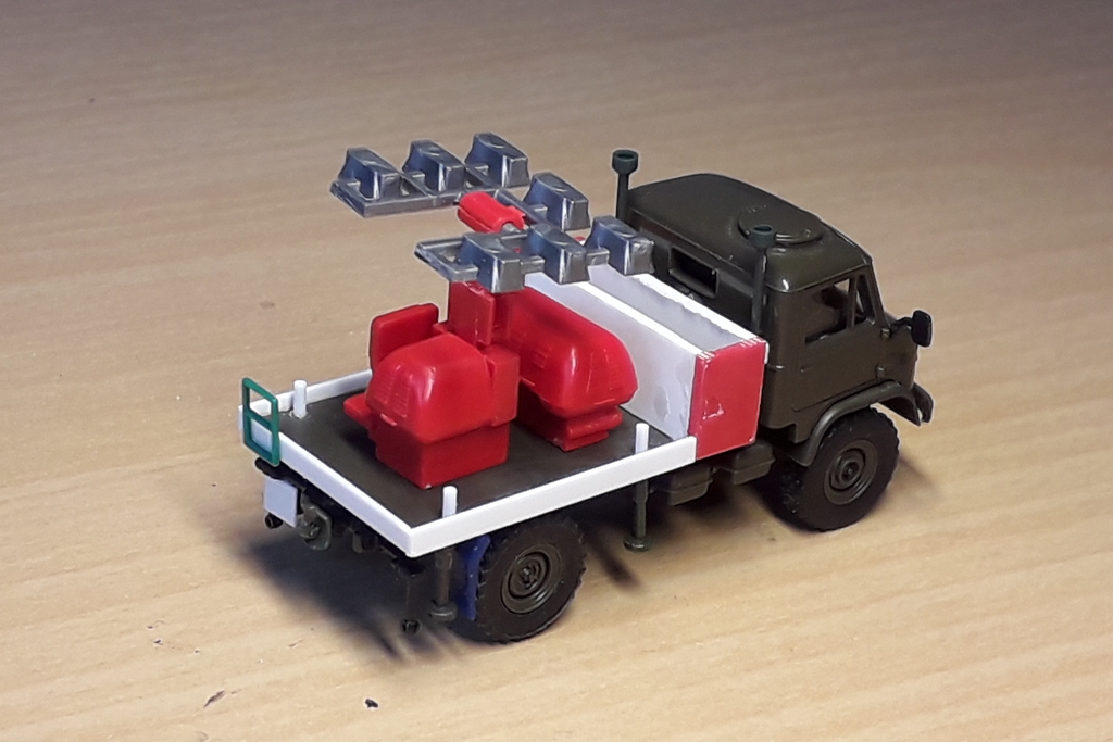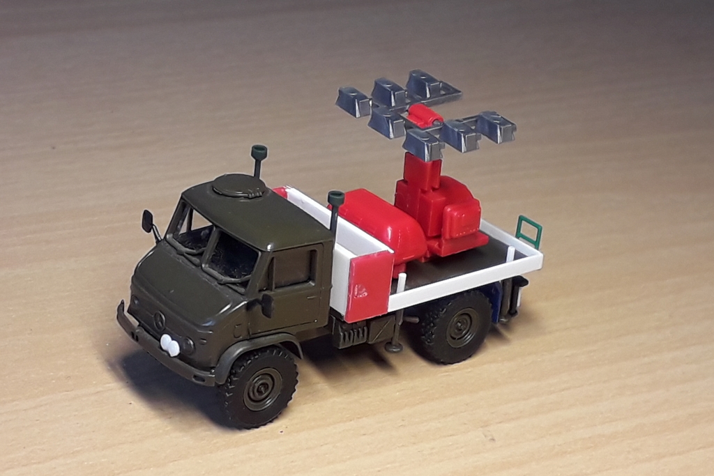 Das Modell entstand auf einem Roco Unimog S404 Fahrgestell incl. der Bodenplatte des Aufbaus und aus einem Lichtmast von Preiser.
