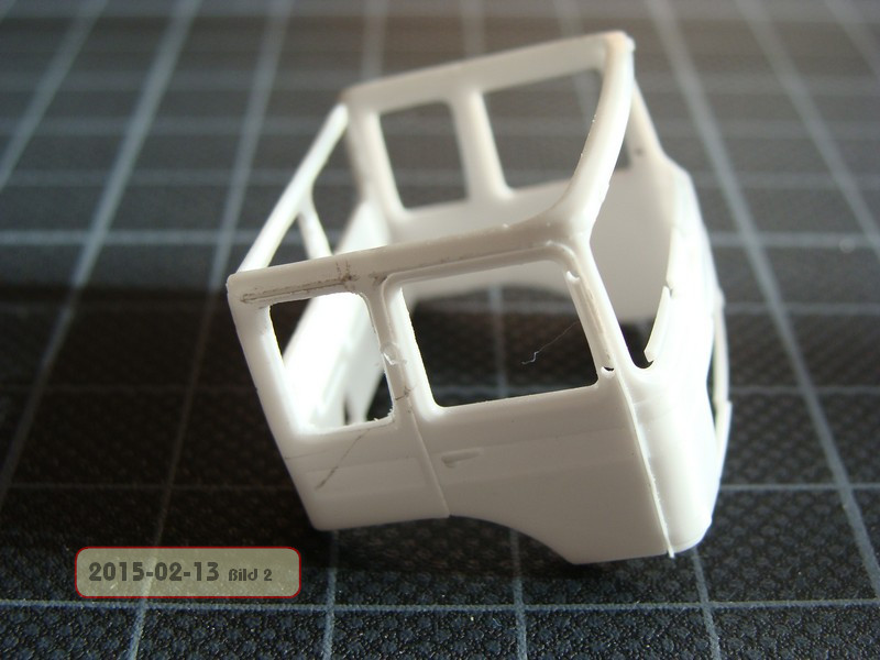 das sieht doch schon mal sehr gut aus. Eine wunderbare Teilekombination die du da baust. Auch das aufgebohrte Mittelfenster macht sich super so wirkt die Kabine ganz anders. Und auch das bullige kommt schon sehr gut rüber. Auch der Rollo kann sich sehen lassen. :D