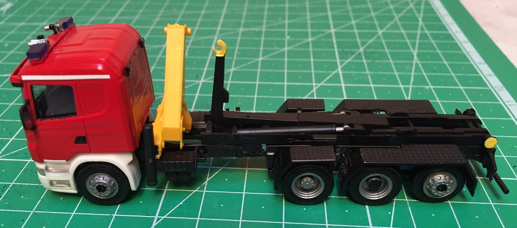 Das Modell entstand aus einer Herpa Scania M 04 Kabine und zwei Aufbauten des HLF 2000 von Herpa bei denen einmal der vordere und einmal der hintere Geräteraum abgetrennt wurde. Dann wurden die zwei Element zusammengefügt und mittels Evergreen verschlossen und dann verspachelt und lackiert. Die Leitern stammen wieder von Shapeways. Die Leiterhalterung ist ebenso ein Eigenbau aus Evergreen. Der Dachmonitor ist das bekannte Teil von Preiser. Abgerundet wurde das Modell mit Teilen aus der Bastelkiste.