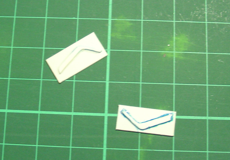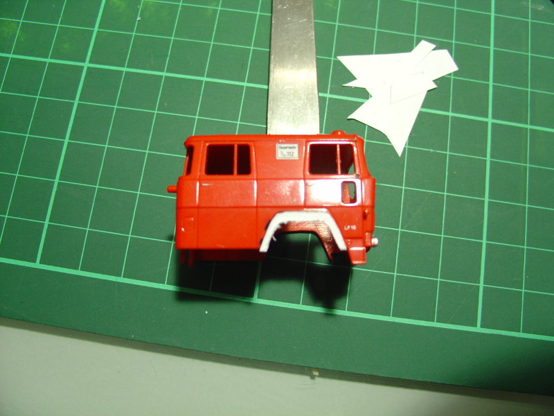 Bekanntermaßen unterscheidet sich die Allradkabine von der Straßenversion optisch durch das zusätzliche Blech zwischen Kabine und Kotflügel. Zum Bau habe ich eine Gruppenkabine von Roco als Stempelvorlage genommen und mir so eine Papierschablone hergestellt. Die Schablone habe ich dann auf eine 0,5 mm Plastikplatte geklebt und anschließend ausgeschnitten.
