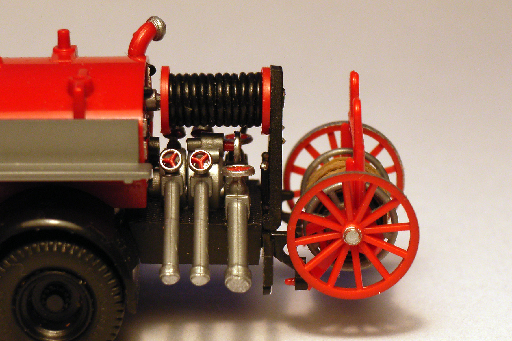 ) und auf dem Fahrgestell montiert; die Schnellangriffseinrichtung ist "behaspelt" und zwischen Tank und Pumpe eingebaut! Fehlen nur noch ein paar Farbtupfer und Kleinstteile, dann wäre das Heck schon mal komplett! Sieht dann so aus: