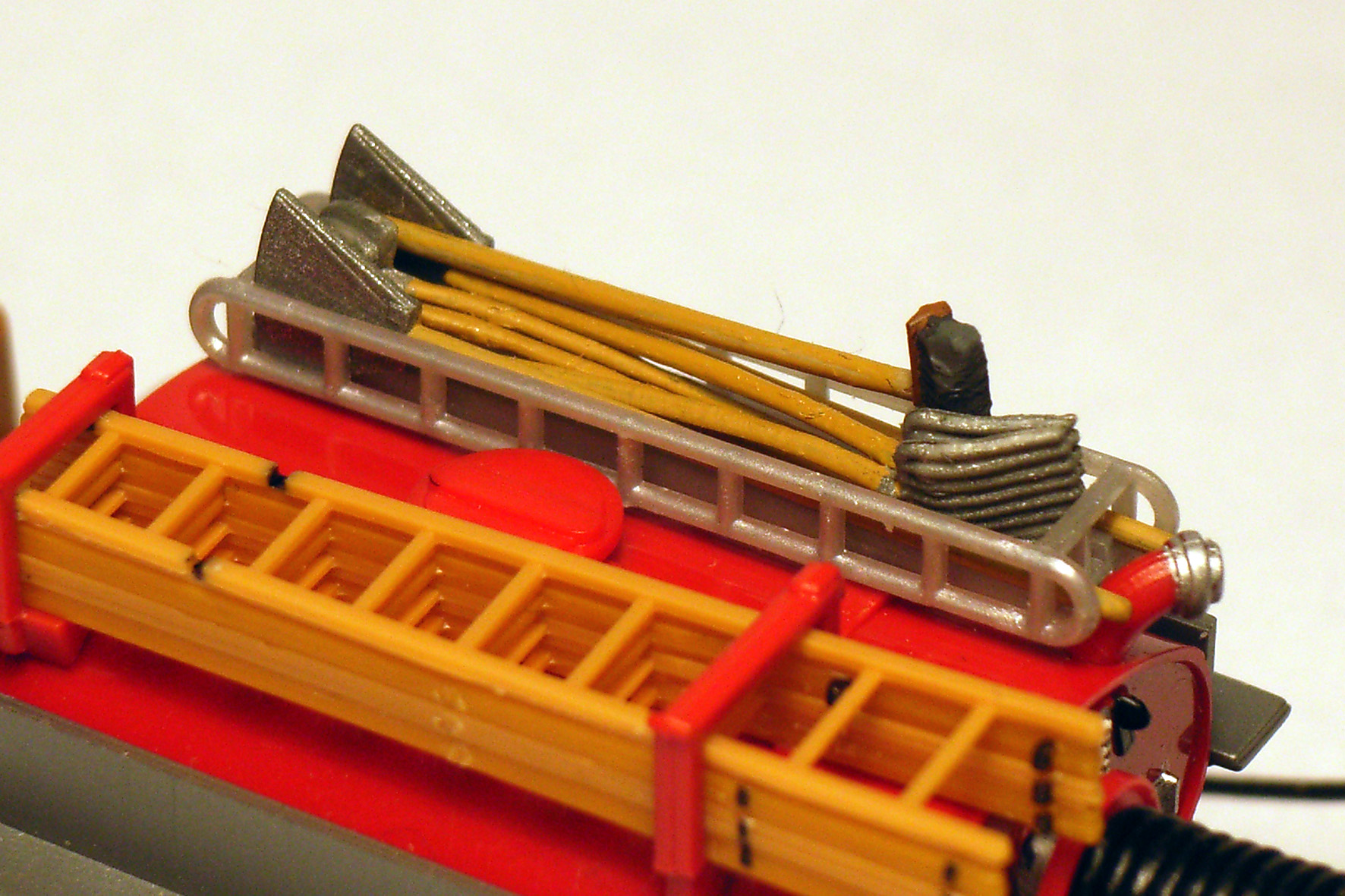 ...pfui!Und die zukünftigen Halterungen der Saugschläuche waren tatsächlich früher einmal Staukästen vom Roco-Magirus!