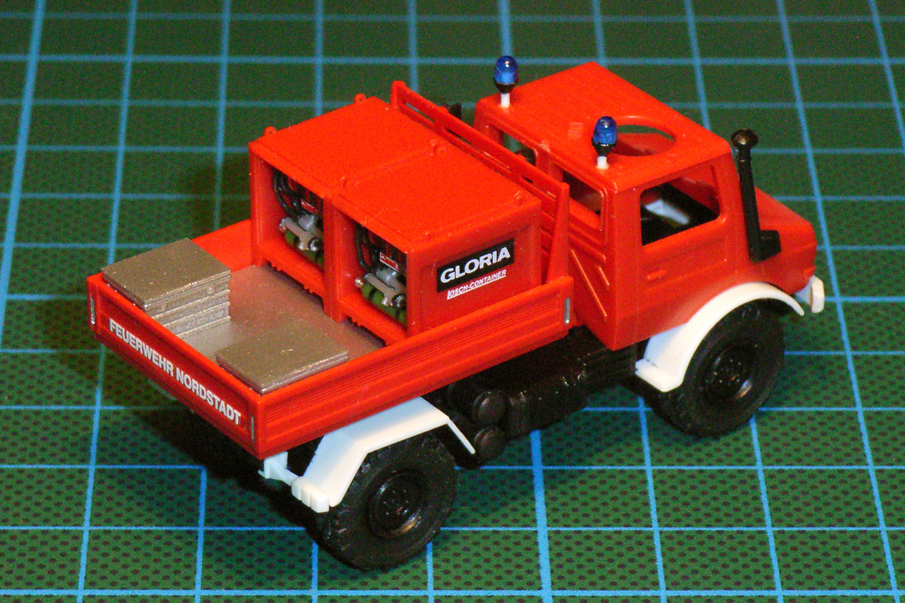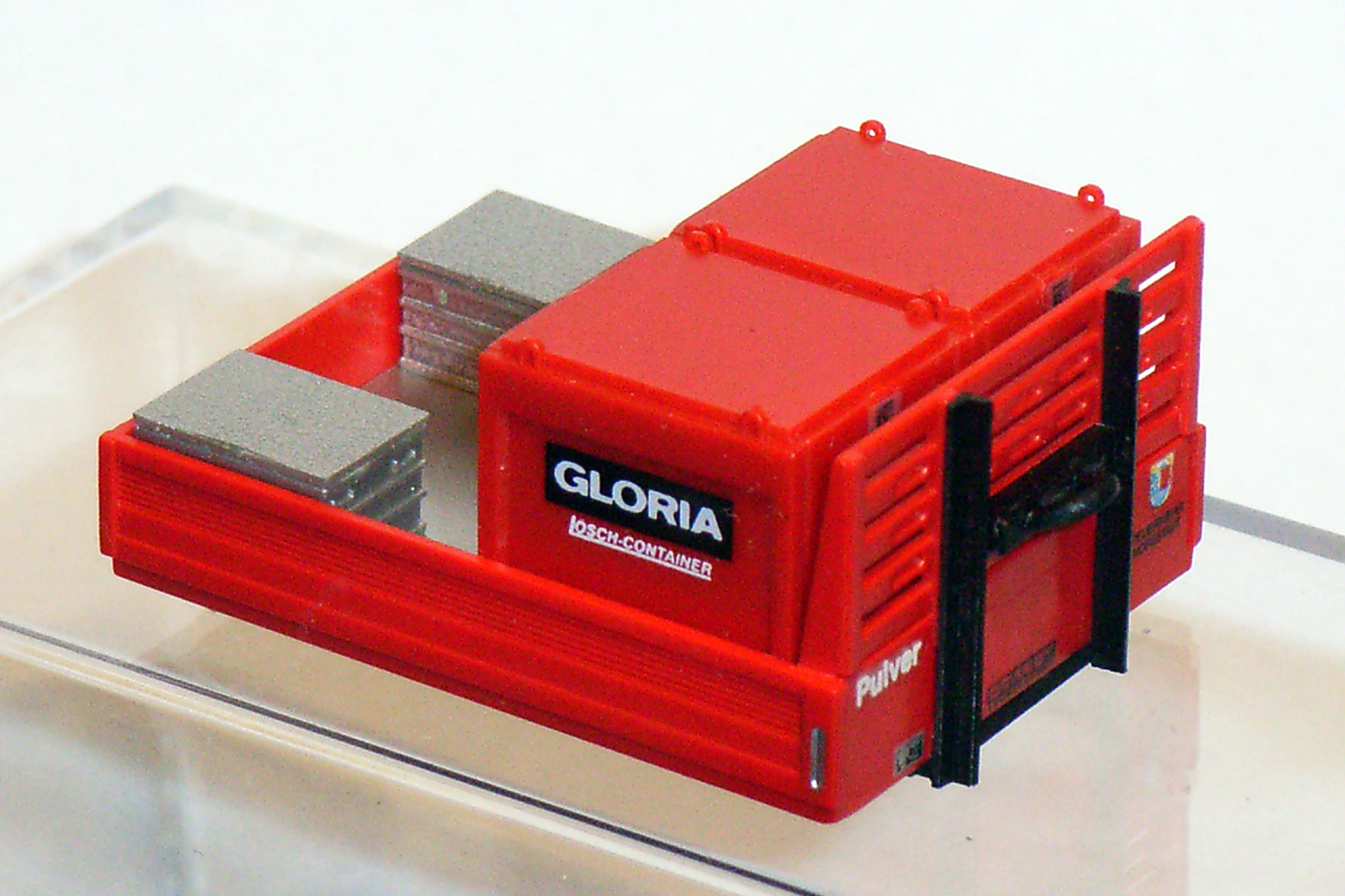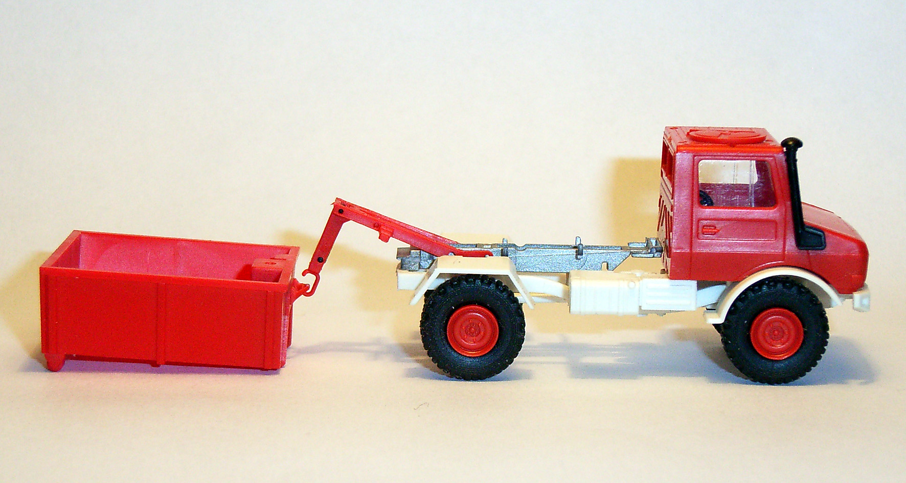 Einziges dafür geeignetes Fahrgestell ist m.E. ein Unimog! Nur der kann dem Hägglunds auch im etwas schwierigeren Gelände den benötigten Nachschub anliefern und passt von den Abmessungen her perfekt zu den relativ kleinen Behältern. Also wurden am Hinterwagen eines Hägglunds-WLF von Trident die überdimensionalen "Kotflügel" entfernt und die Atlas-Kinematik so weit an das Chassis eines Roco-Unimog U4000 angepasst, dass der AB einwandfrei abgesetzt werden kann.