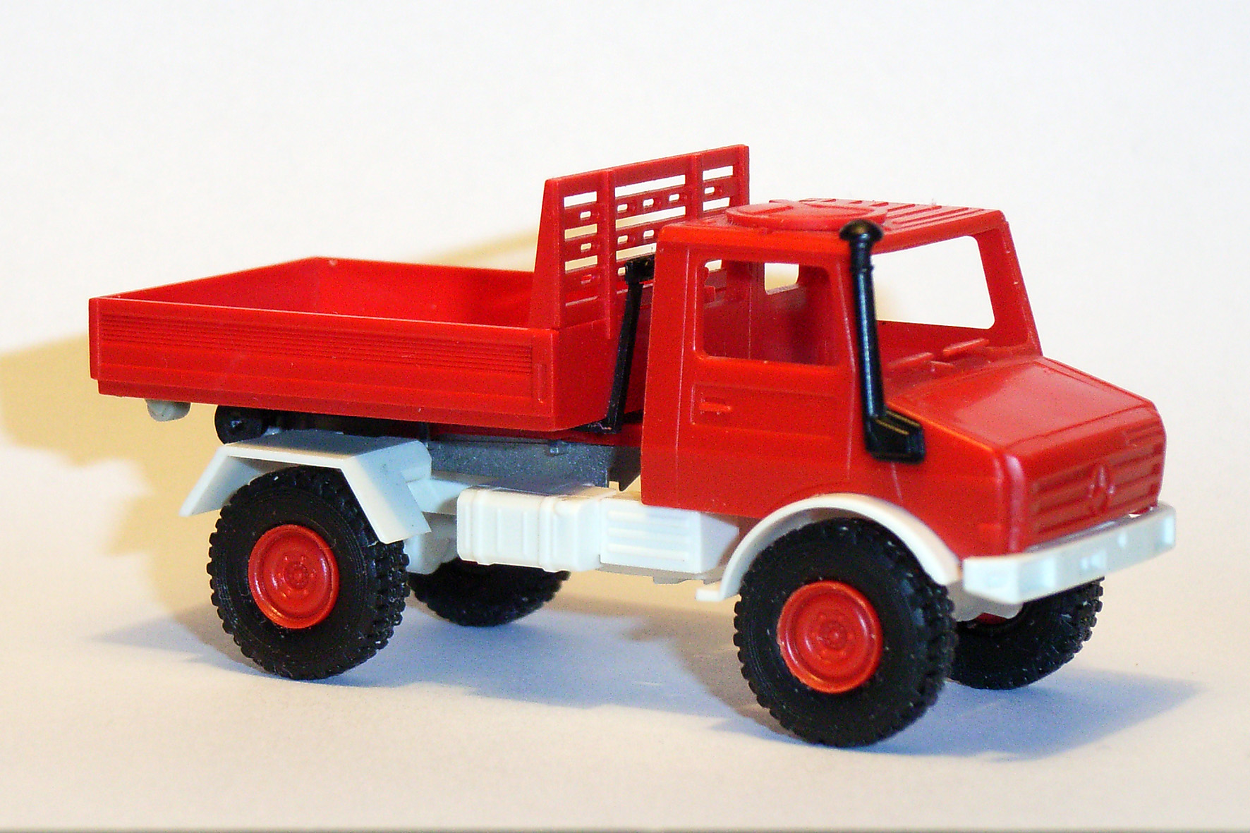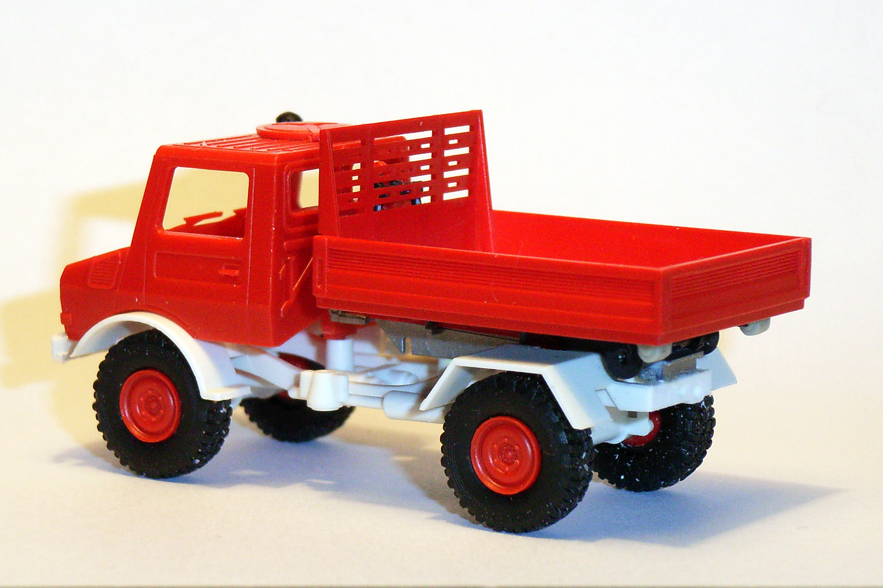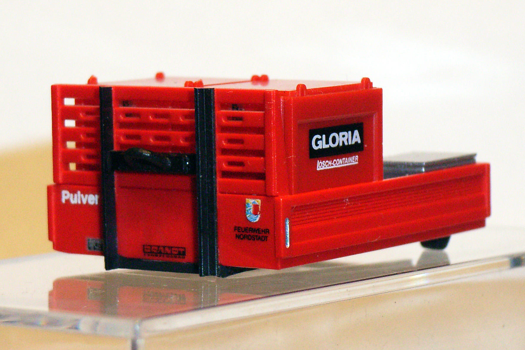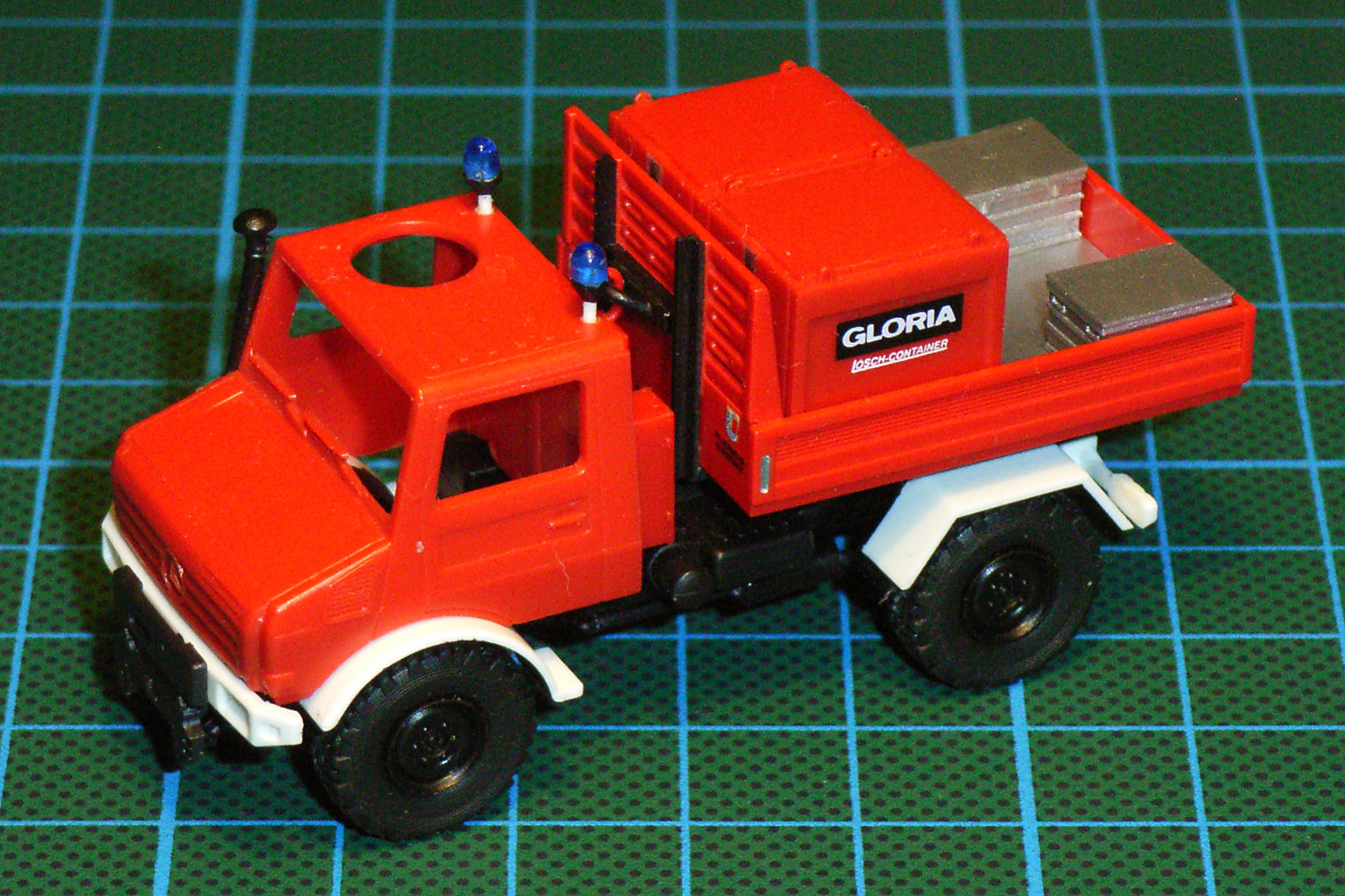 Einziges dafür geeignetes Fahrgestell ist m.E. ein Unimog! Nur der kann dem Hägglunds auch im etwas schwierigeren Gelände den benötigten Nachschub anliefern und passt von den Abmessungen her perfekt zu den relativ kleinen Behältern. Also wurden am Hinterwagen eines Hägglunds-WLF von Trident die überdimensionalen "Kotflügel" entfernt und die Atlas-Kinematik so weit an das Chassis eines Roco-Unimog U4000 angepasst, dass der AB einwandfrei abgesetzt werden kann.