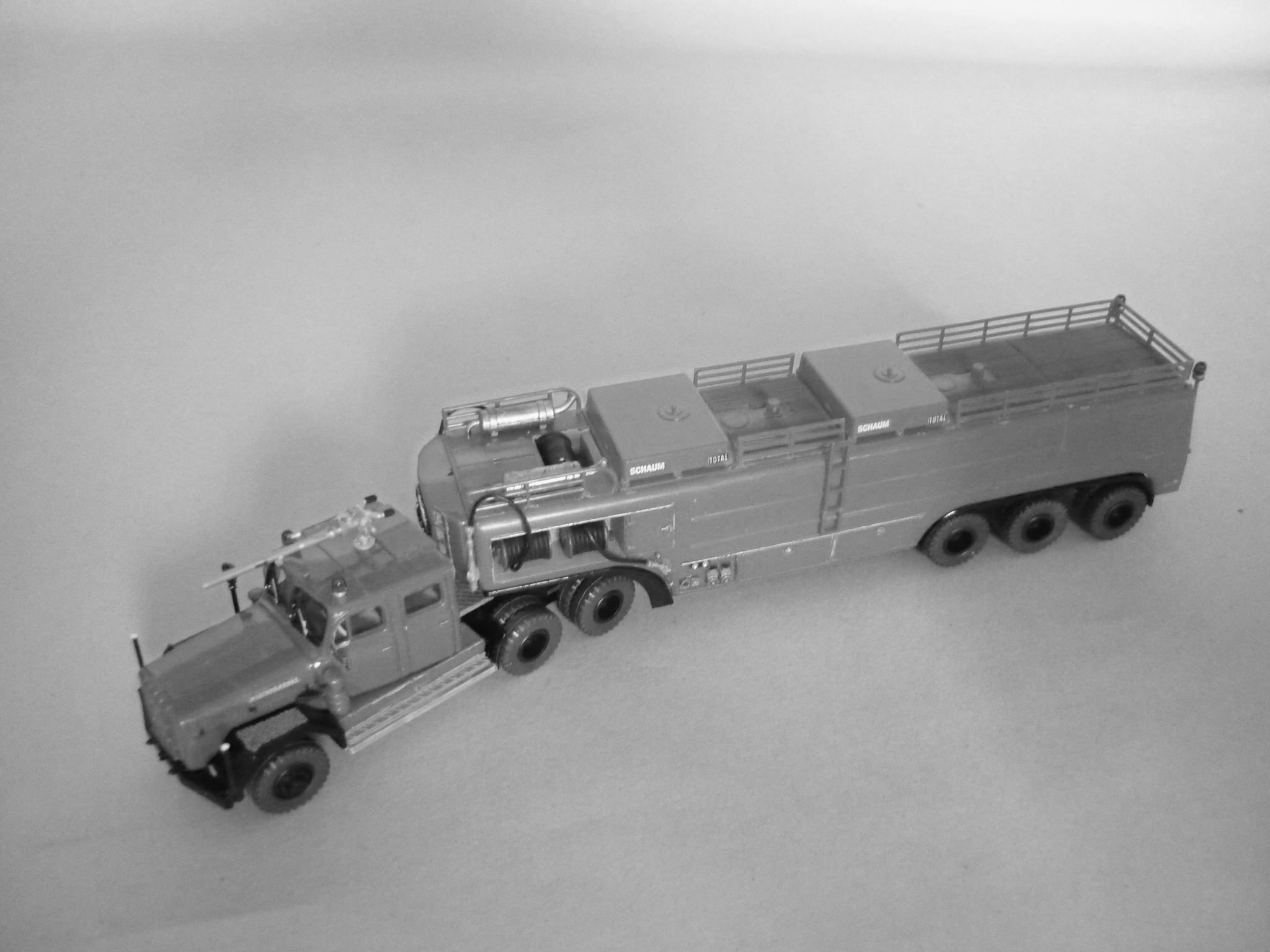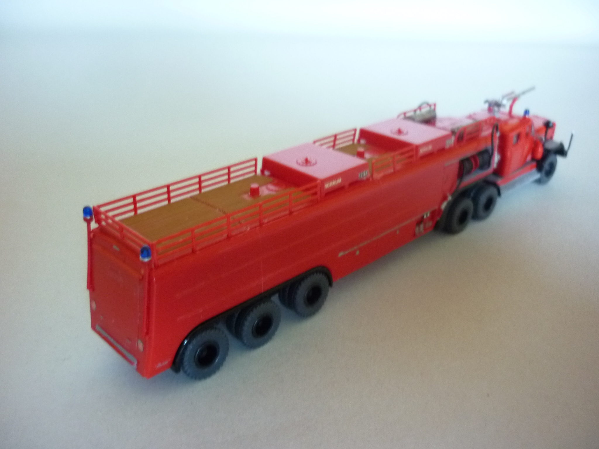 Allerdings frage ich mich: Wie kommt das Wasser bzw. Wasser/Schaum-Gemisch zum Werfer? Die einzige Verbindung, die ich zwischen Zugmaschine und Auflieger sehe, ist die Sattelkupplung. Die Königswelle in der Kupplung wird zwar wegen des zusätzlichen Motors im Auflieger nicht benötigt, aber dort eine ausreichend dimensionierte Rohrleitung unterzubringen, scheint mir nicht möglich zu sein. Sie müsste ja auch noch drehbar und wegen der Verwindungen des Zuges zusätzlich in alle Richtungen kippbar sein. Das wird nix.