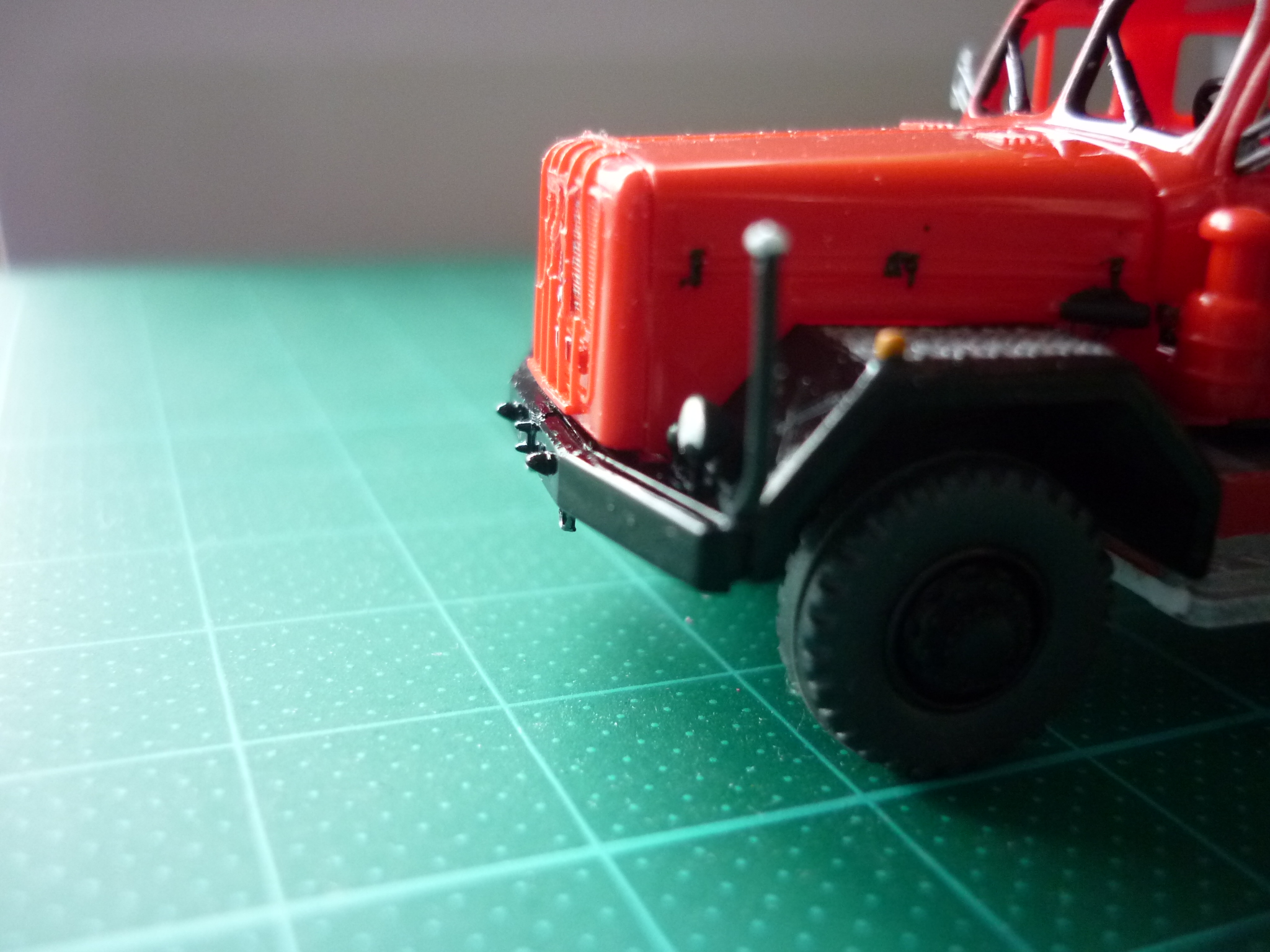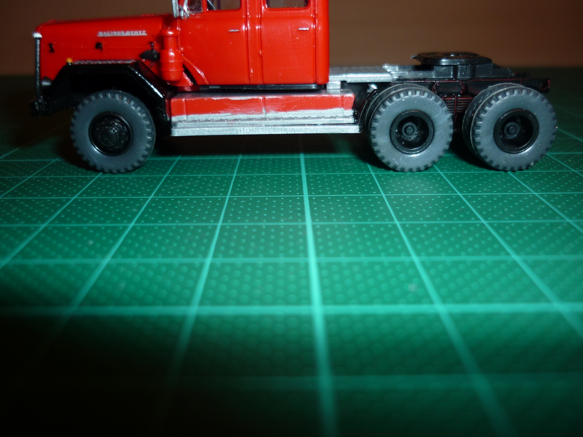 Die Haube stammt vom Preiser KW 16 - war vom Umbau KW 12 übrig, das Fahrgestell ist von Bastian, die Auflieger-Teile stammen von Reinhard Merlau, hier wurden 2 Auflieger feinsäuberlich getrennt und dann wieder zusammengesetzt :wink: