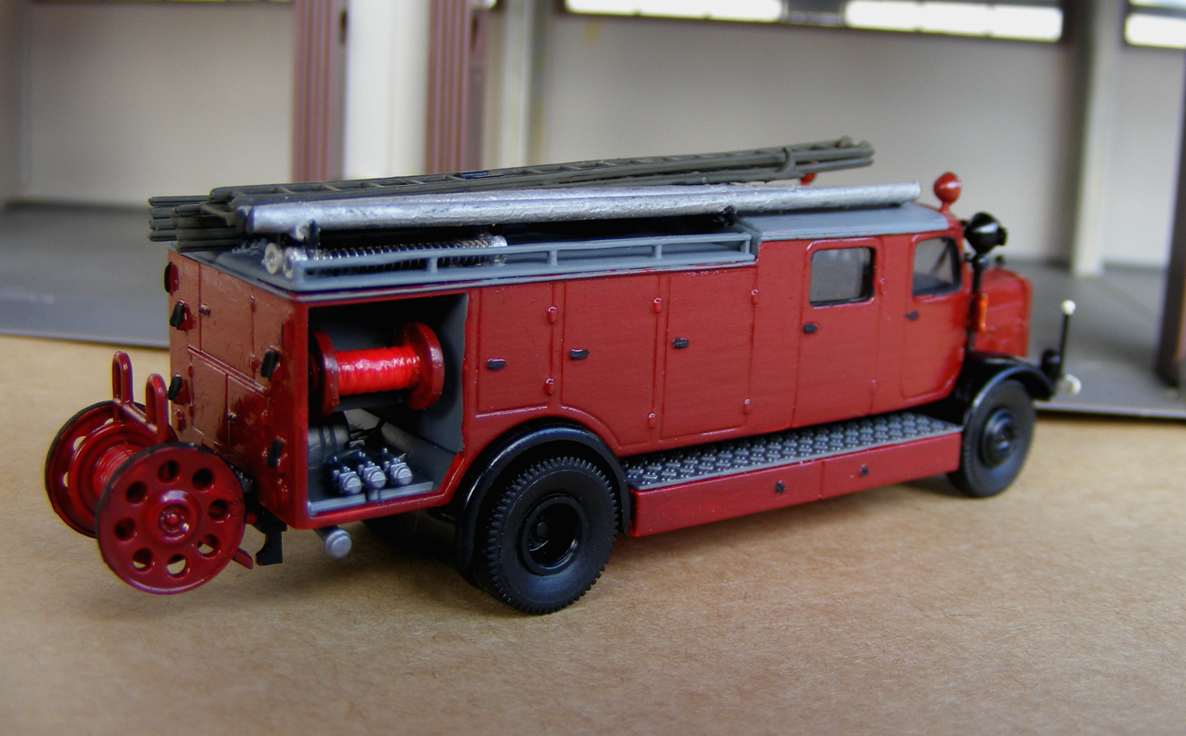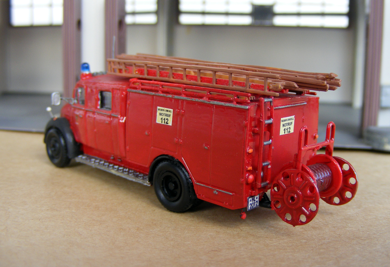 Das Grundmodell lieferte Brekina. Das Rubinrot habe ich mir selber angemischt. Kotflügel und Stoßstange wurden in schwarz abgesetzt. Ich habe die Versíon mit blauen Blinklampen gebaut. Auf dem Dach lagert neben Steck- und Schiebleiter noch zwei Rohre für ein Schaumgießgestänge.