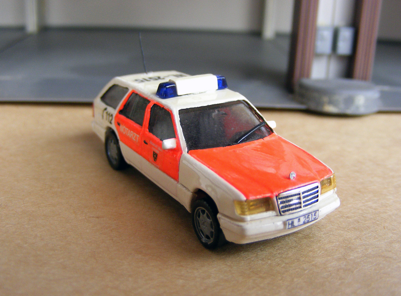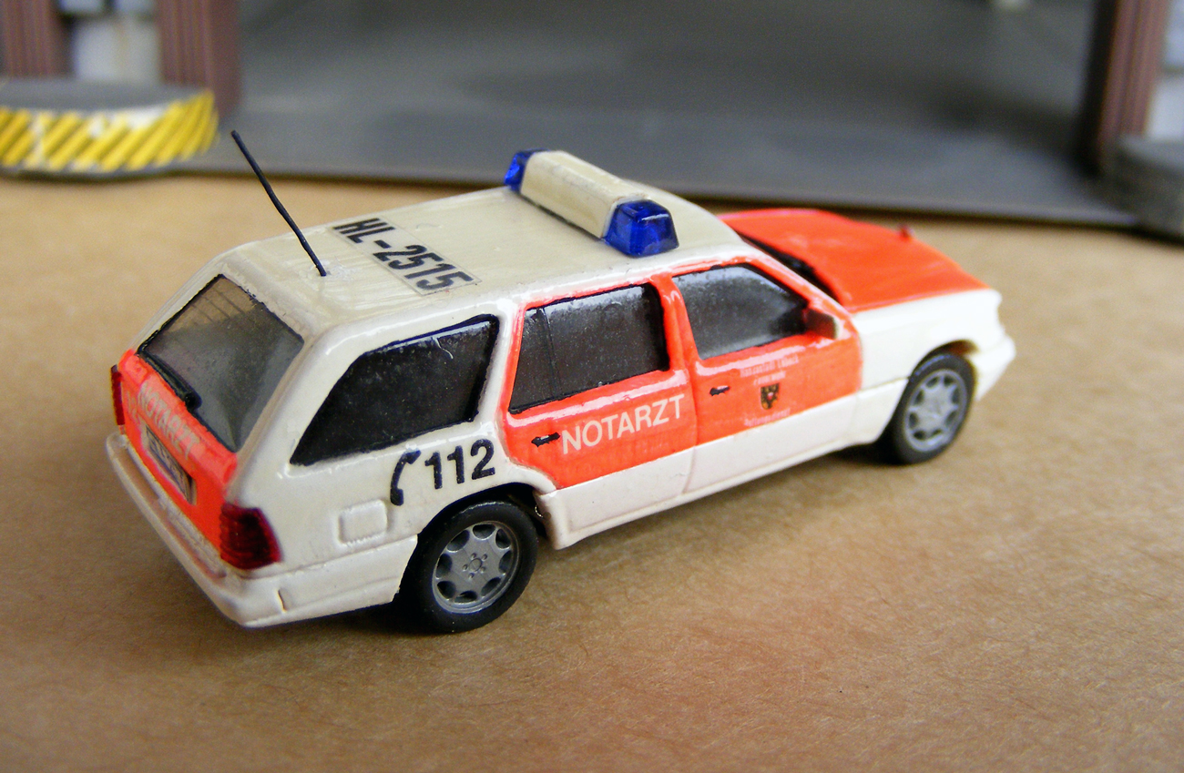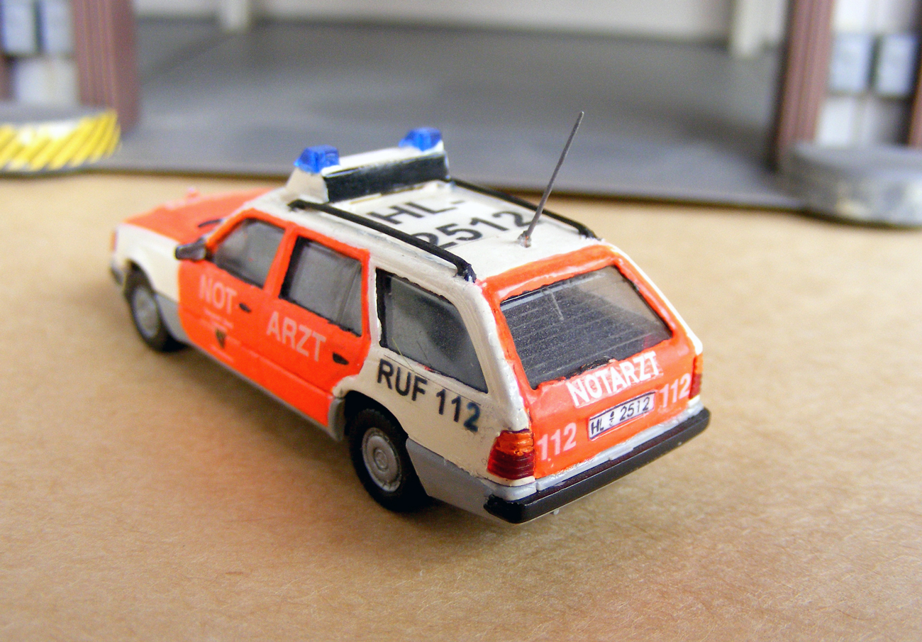 Beide Grundmodelle stammen von Roco. Beim rubinroten Unfallwagen war das Blaulicht mittig angeordnet, beim grauen über dem Platz des Fahrers. Ein paar Kleinteile vervollständigen beide Modelle.