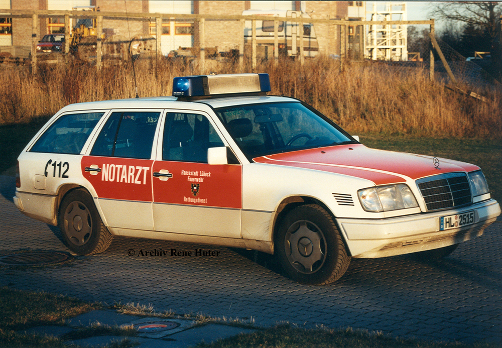 Wir fangen bei den Notarzteinsatzfahrzeugen NEF an. Das Notarztsystem wurde in Lübeck Ende der 70er Jahre in Lübeck eingeführt. Es wurde sich für das Rendevouz Verfahren entschieden, bedeutet Rettungswagen und Notarzt treffen sich gemeinsam am Einsatzort. Anfangs wurde der Notarzt wird einem VW Passat zum Einsatzort gebracht. Im Jahre 1980 wurde ein Mercedes Benz 300 T in Dienst gestellt. Das Fahrzeug wurde an der Uniklinik Lübeck stationiert. Das NEF wurde in RAL 3000 mit weißen Absetzungen lackiert. Leider blieb das Fahrzeug nicht lange im Dienst. Auf einer Einsatzfahrt 1984 verunfallte das NEF schwer, so das es mit Totalschaden ausgesondert werden musste.