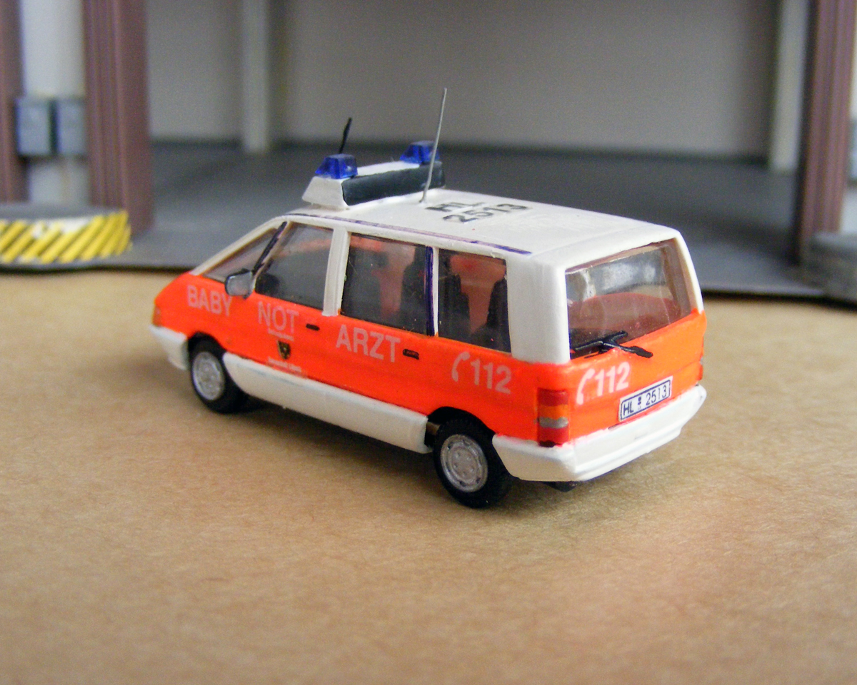 Hier geht es weiter. Als nächstes möchte ich die Baby-Notarztwagen aus Lübeck vorstellen. Das Baby-Notarztsystem wurde 1988 mit Hilfe der Björn-Steiger-Stiftung ins Leben gerufen. Der Baby-NAW ist auf Wache I stationiert. Bei einem Notfall rückt das Fahrzeug entweder direkt zum Einsatzort und ein Kinderarzt wird von der Polizei zum Einsatzort gebracht, oder die Besatzung fährt auf den Weg zum Einsatzort erst zum Krankenhaus und nimmt einen Kinderarzt auf und fährt dann weiter. Als erstes Fahrzeug wurde von der Stiftung ein Baby-NAW auf Renault Espace beschafft. Das Fahrzeug wurde in Tagesleuchtfarbe RAL 3024 und Weiß lackiert. Dieses Fahrzeug blieb bis 1994 im Dienst und wurde von einem VW T4 ersetzt. Das Fahrzeug war in Weiß lackiert und bekam eine leuchtrote Beklebung. Der T4 verrichtete seinen Dienst bis 2007 und wurde dann durch einen VW T5 ersetzt. Der T5 wurde in Feuerrot RAL 3000 und Weiß lackiert.