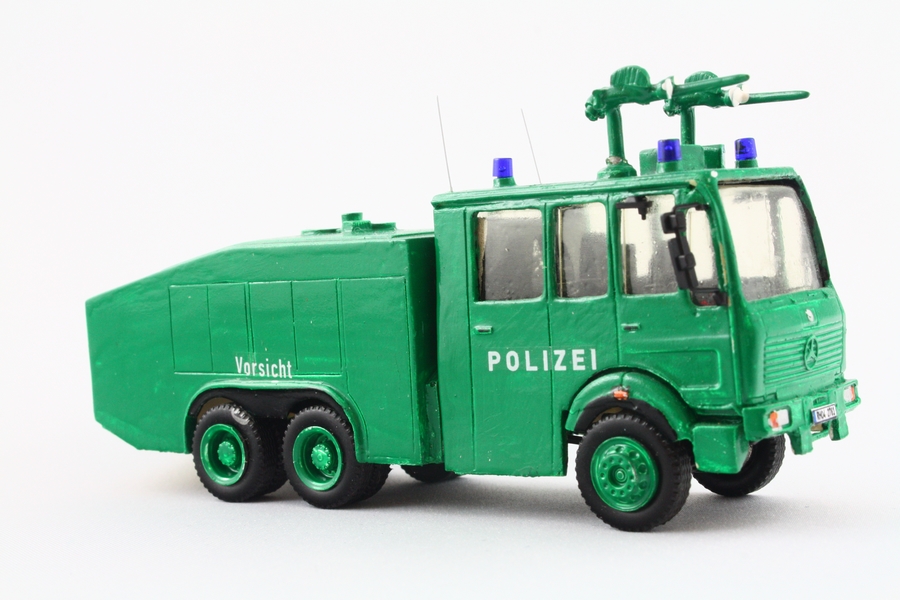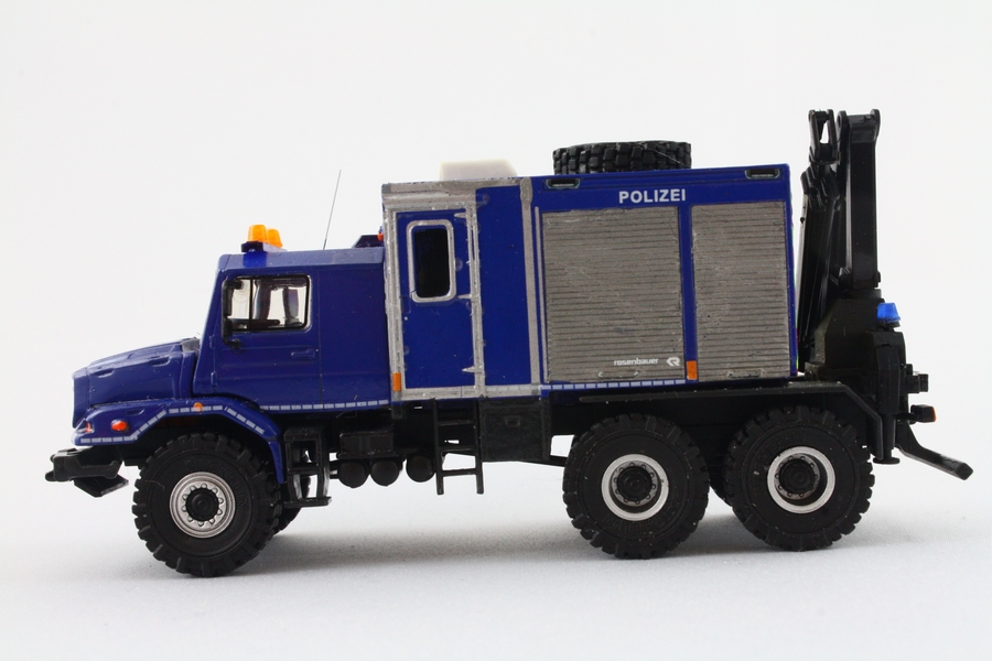 Wie das G-Modell stammt auch dieser von Ebay (war ein Konvolut aus G-Klasse, Unimog, Anhänger und Kleinbagger, alles in THW-Version). Die alten Decals wurden entfernt und die anthrazit-farbene Schicht wurde nebst neuen Decals aufgebracht.