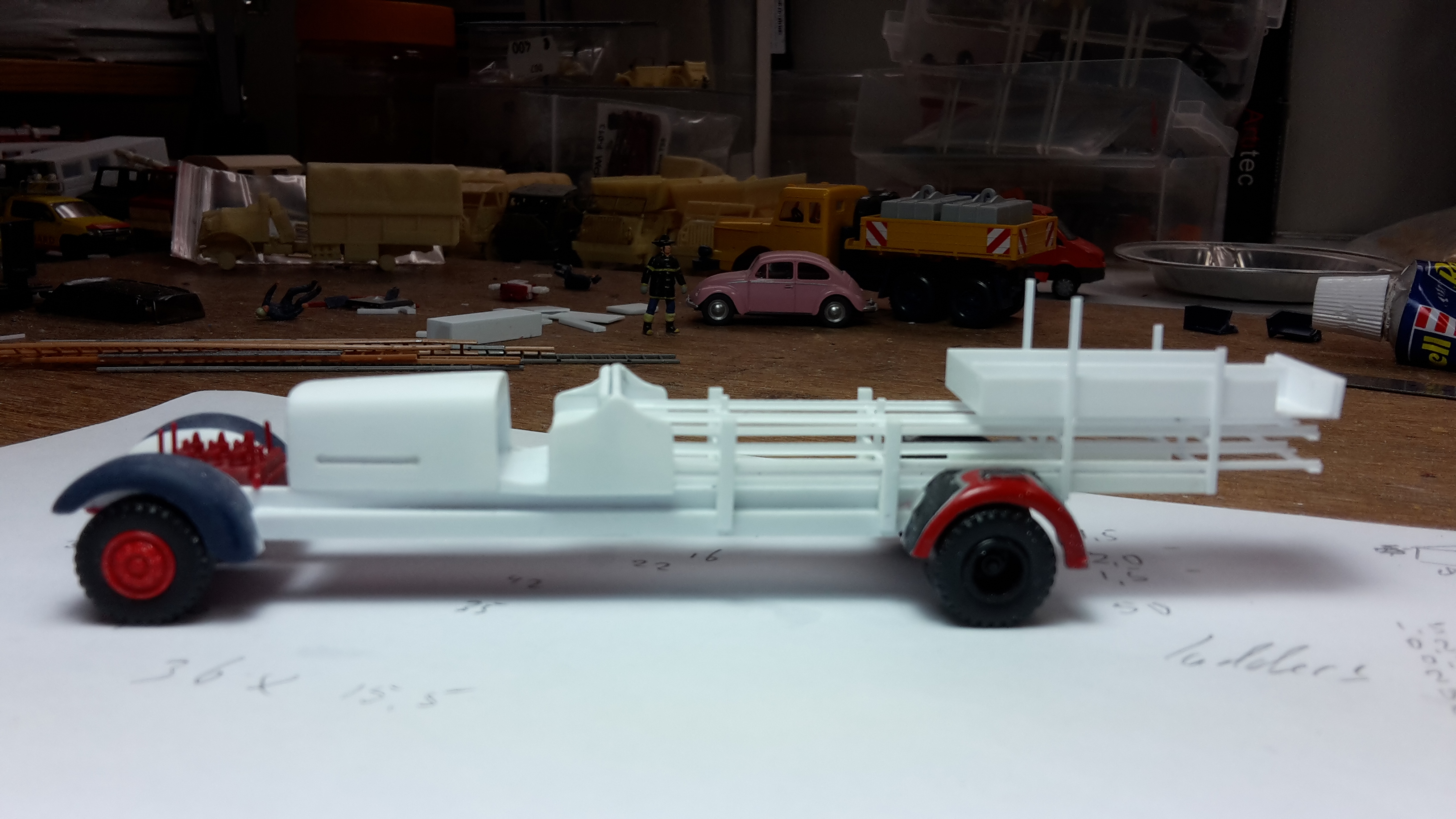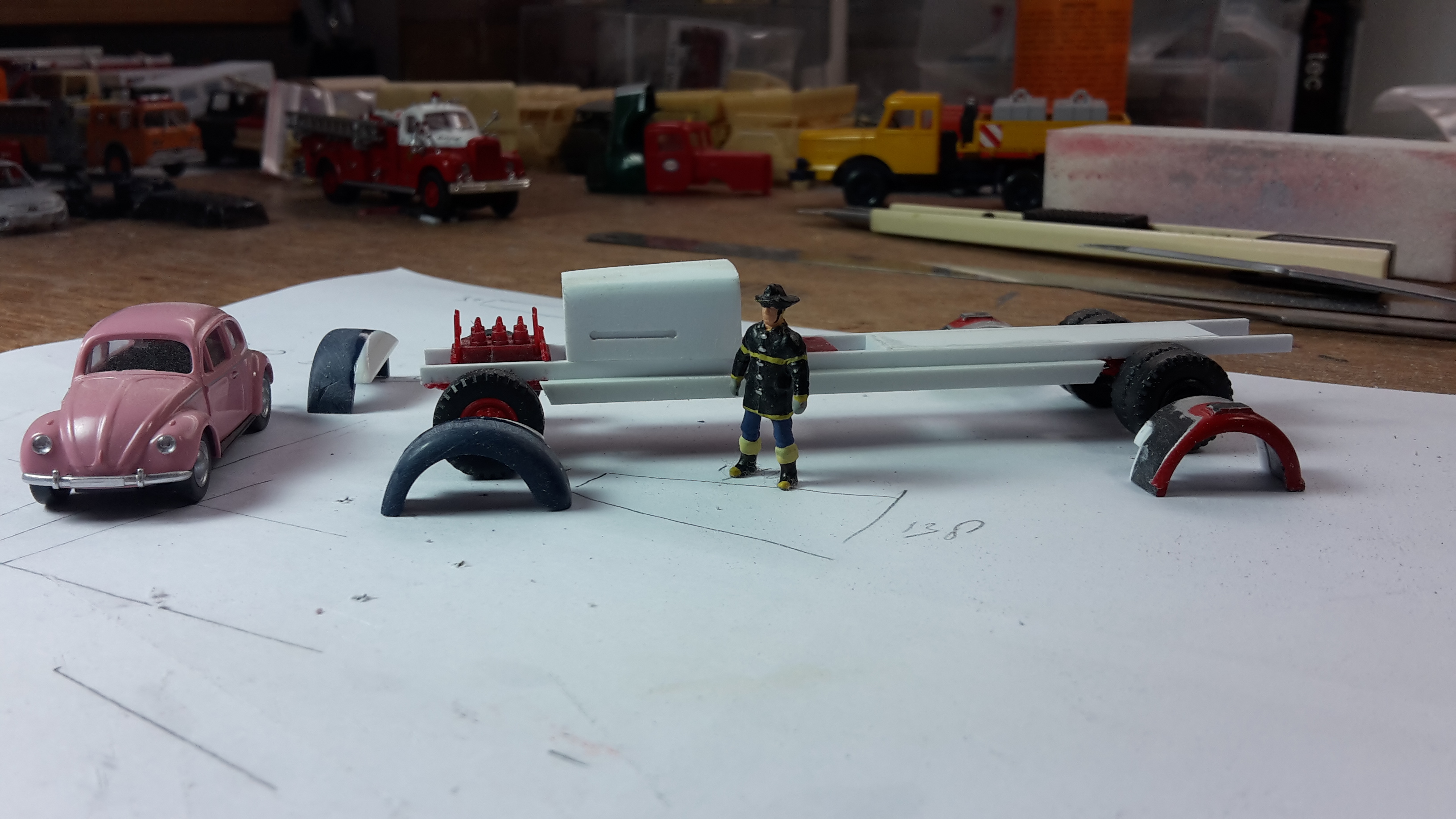 Basis meiner Modell ist den vier Zilinder Ahrens Fox Pump von Jordan. Ich habe davon ein sechs Zilinder Pump gemacht. Den Leiter ist teils von Herpa übernommen und den rest ist eigenbau.