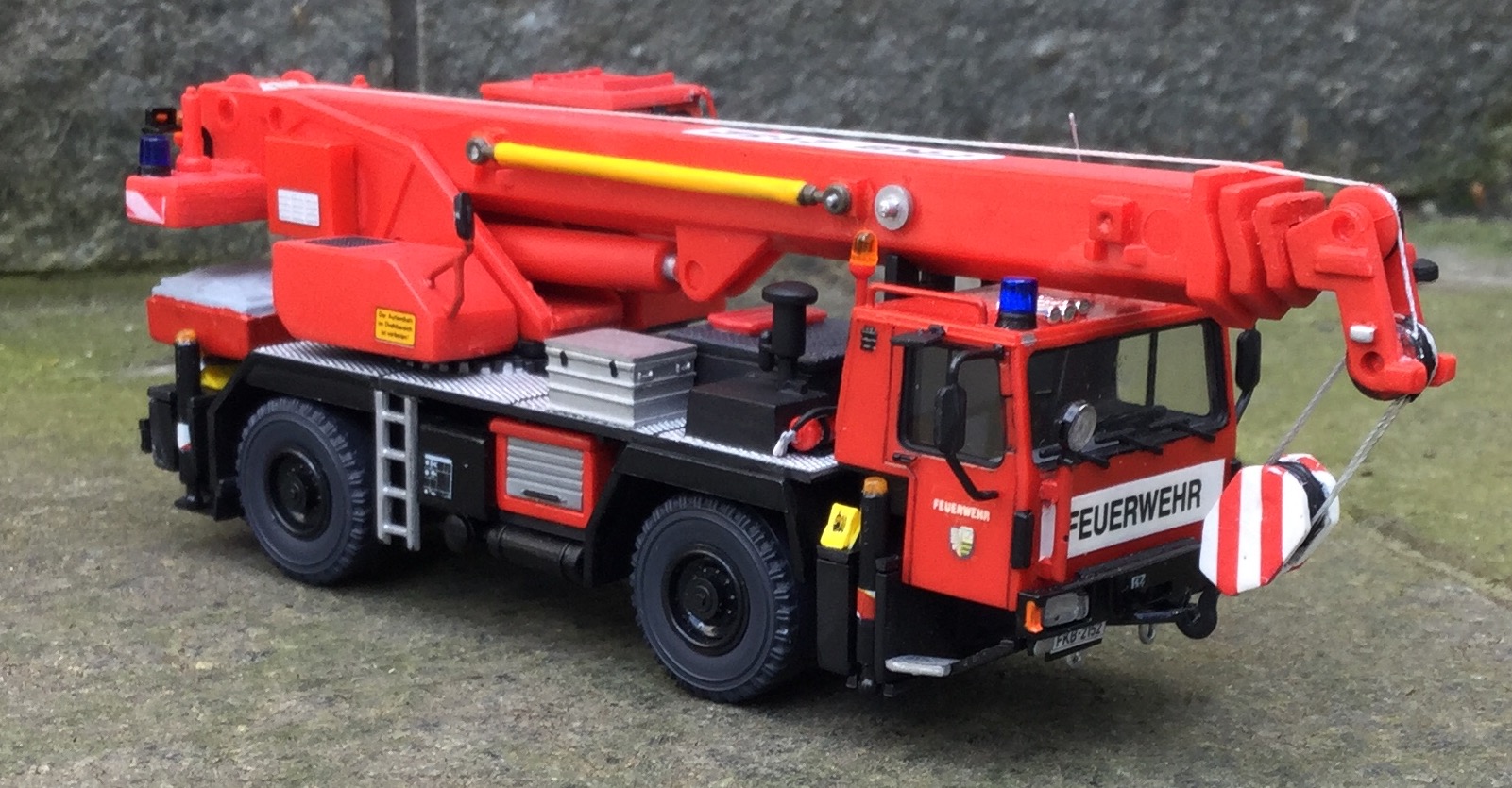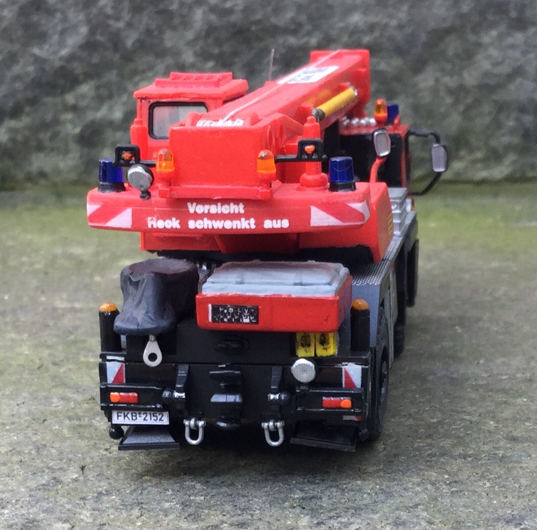 Grundmodell Kibri, hier und da ergänzt mit Kleinteilen. Ein Paar der Kibri Unregelmäßigkeiten habe ich versucht auszumerzen. Die vordere Stoßstange ist zum Beispiel vom Roco MB NG LKW.