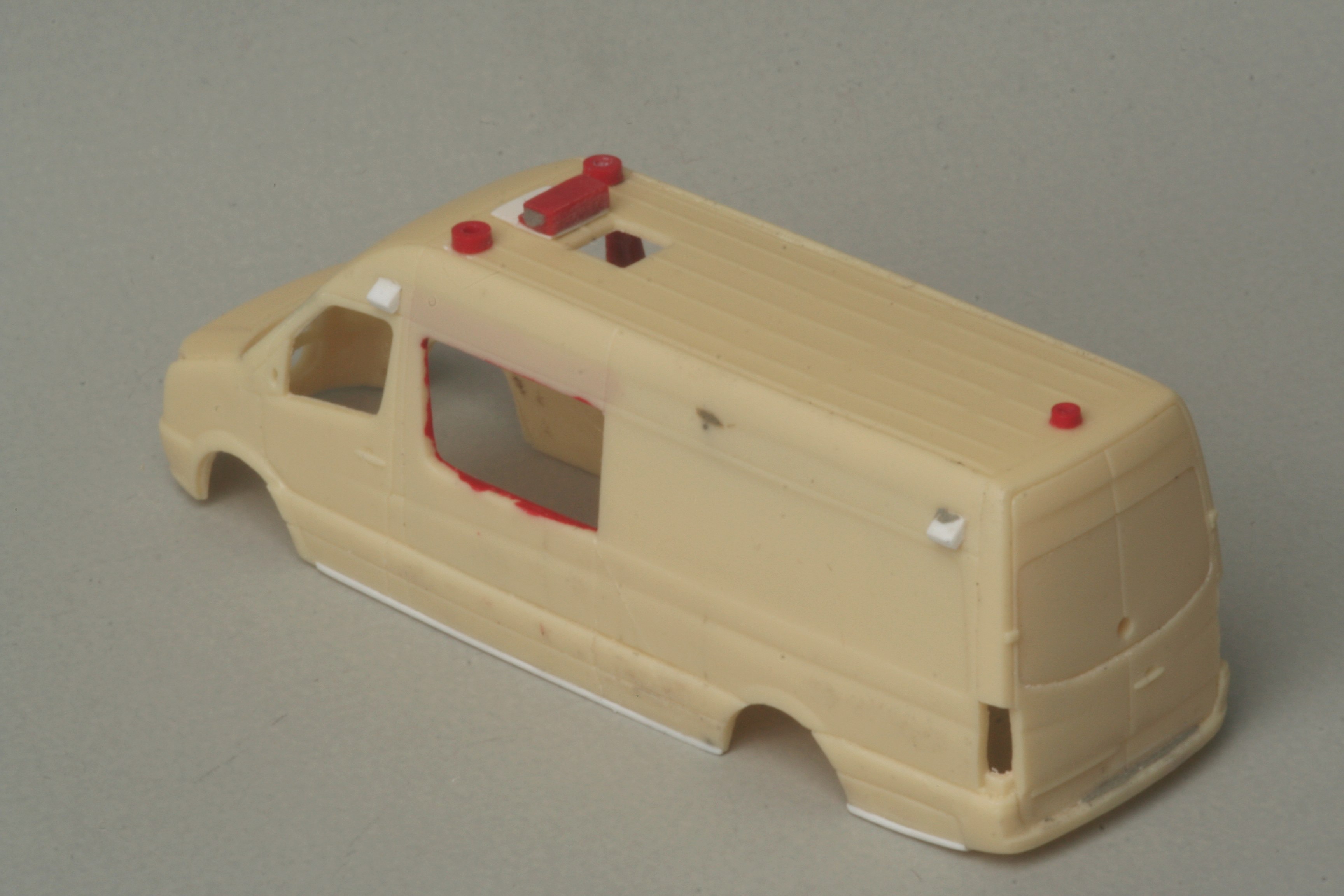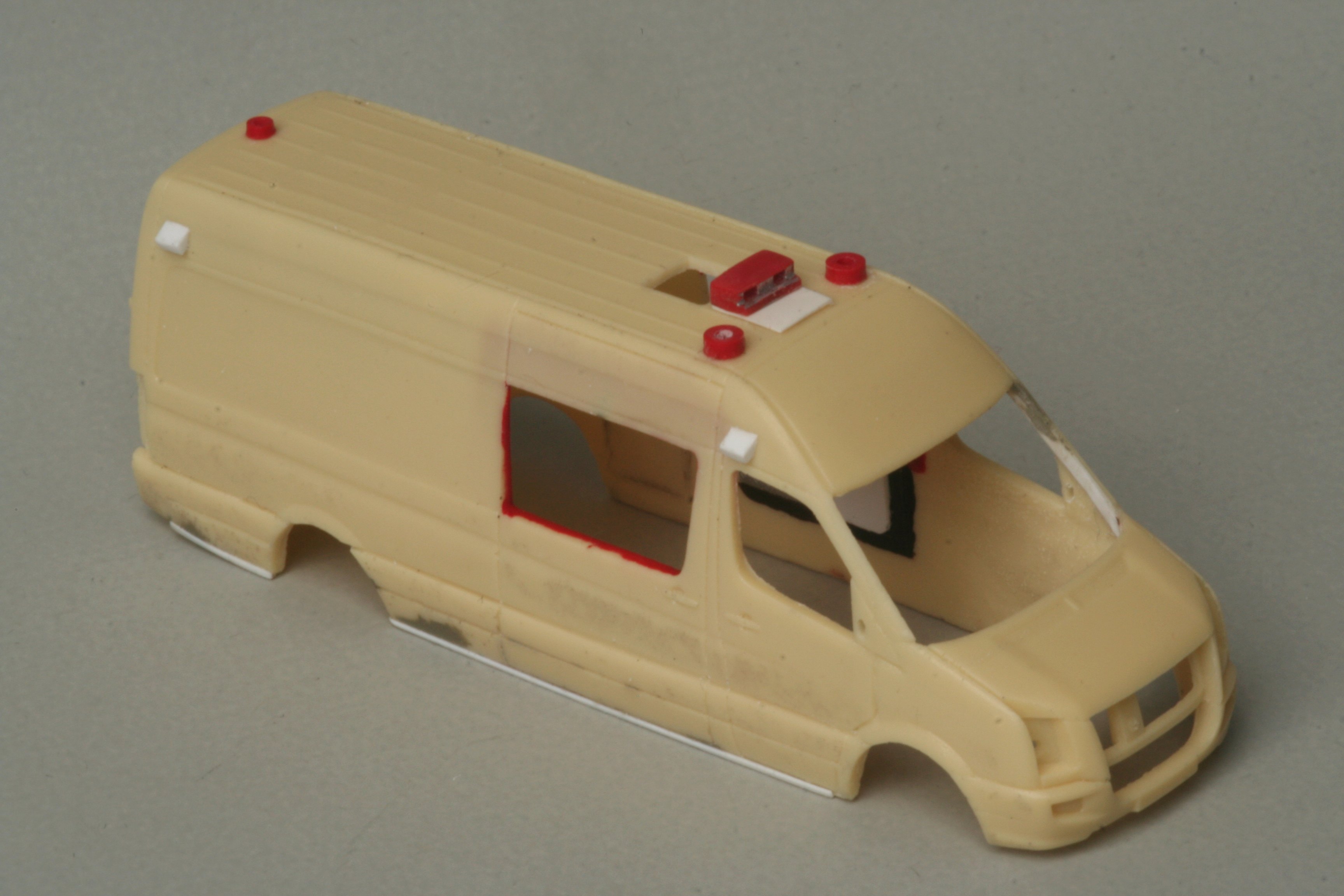 Hiervon wollte ich immer schon ein Modell bauen. Die Schwierigkeit ist nur, dass es den Crafter lang/hoch nicht als Großserienmodell gibt. Zwei Herpa-Modelle(mit dem mittellangen Radstand) lagen schon bei mir bereit und während ich noch nach den günstigsten Stellen für die Sägeschnitte suchte, stieß ich auf ein Kleinserienmodell von msM87. Nach Erwerb dieses Resinmodells habe ich die seitlichen Fenster und das Dachfenster aus dem geschlossenen Kofferaufbau herausgefeilt, sowie die Heckfenster geschlossen. Nach der Versäuberung der Karrosserie kamen Umfeldbeleuchtung, Blaulichtsockel, Fanfarenhalterung und diverse Kleinteile hinzu. Noch vor dem Lackieren sollten einige Innenwandteile fertig werden: Ein Klapptisch und Riffelblechauskleidungen an der Schiebetür. Dann braucht man später die lackierte Karrosserie nicht mehr so oft anfassen. Während der Anpressphase des Riffelblechs mithilfe einer Kreuzpinzette fiel das Modell vom Basteltisch und brach einmal auf der linken Seite durch. Also wieder kleben und langwierig verschleifen :evil: . Im linken Bild aus der Rohbauphase ist noch die Verstärkungsplatte zu sehen, die ich zwischen hinterem Radausschnitt und Seitenfenster geklebt habe, da das Kleben der Stoßkanten alleine nicht genügend Stabilität gebracht hätte.