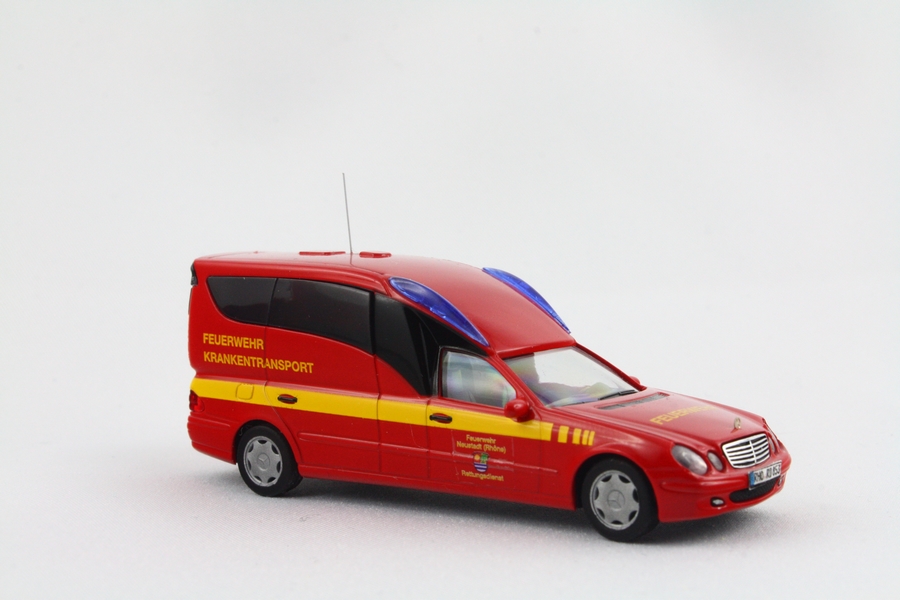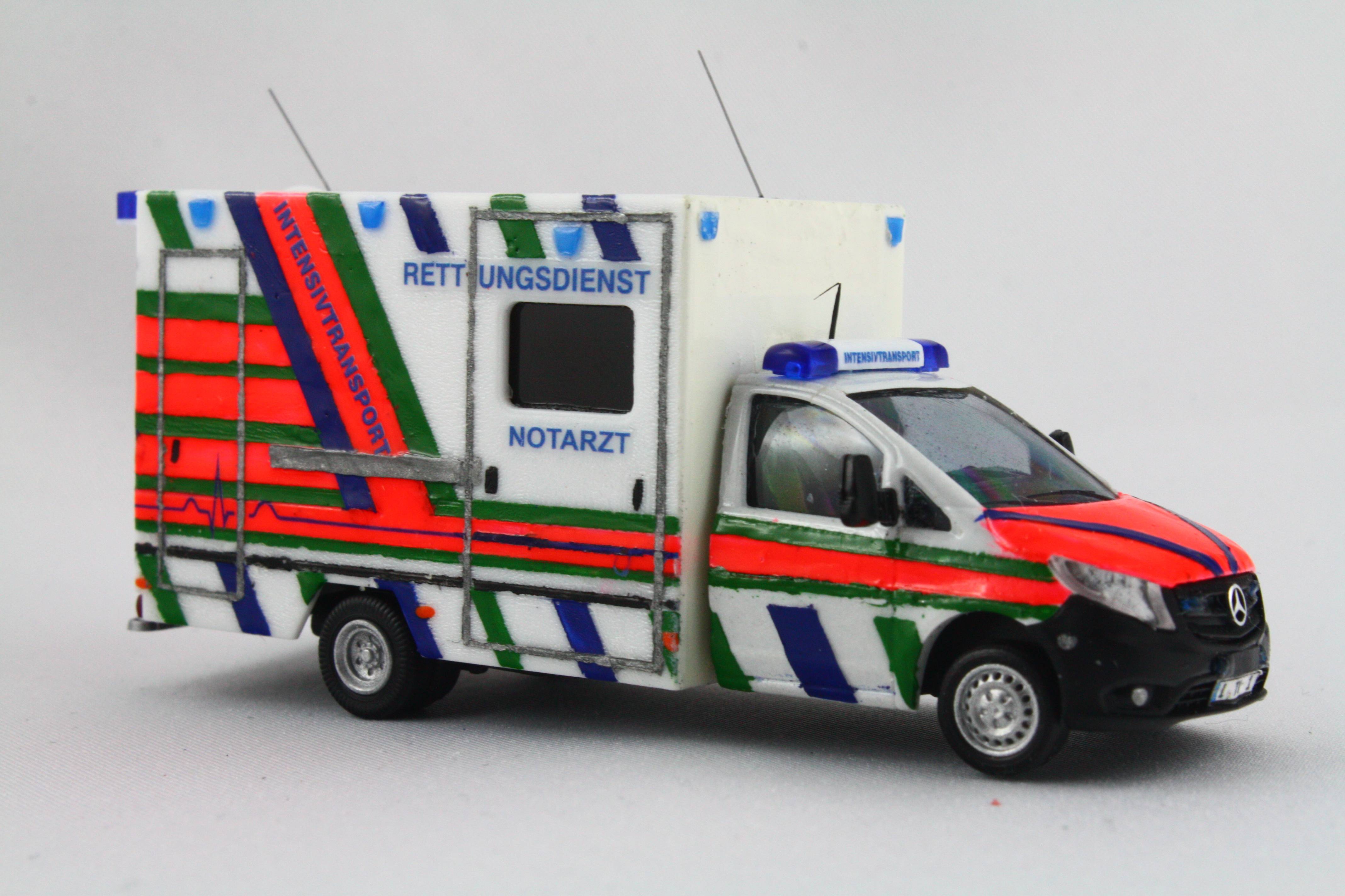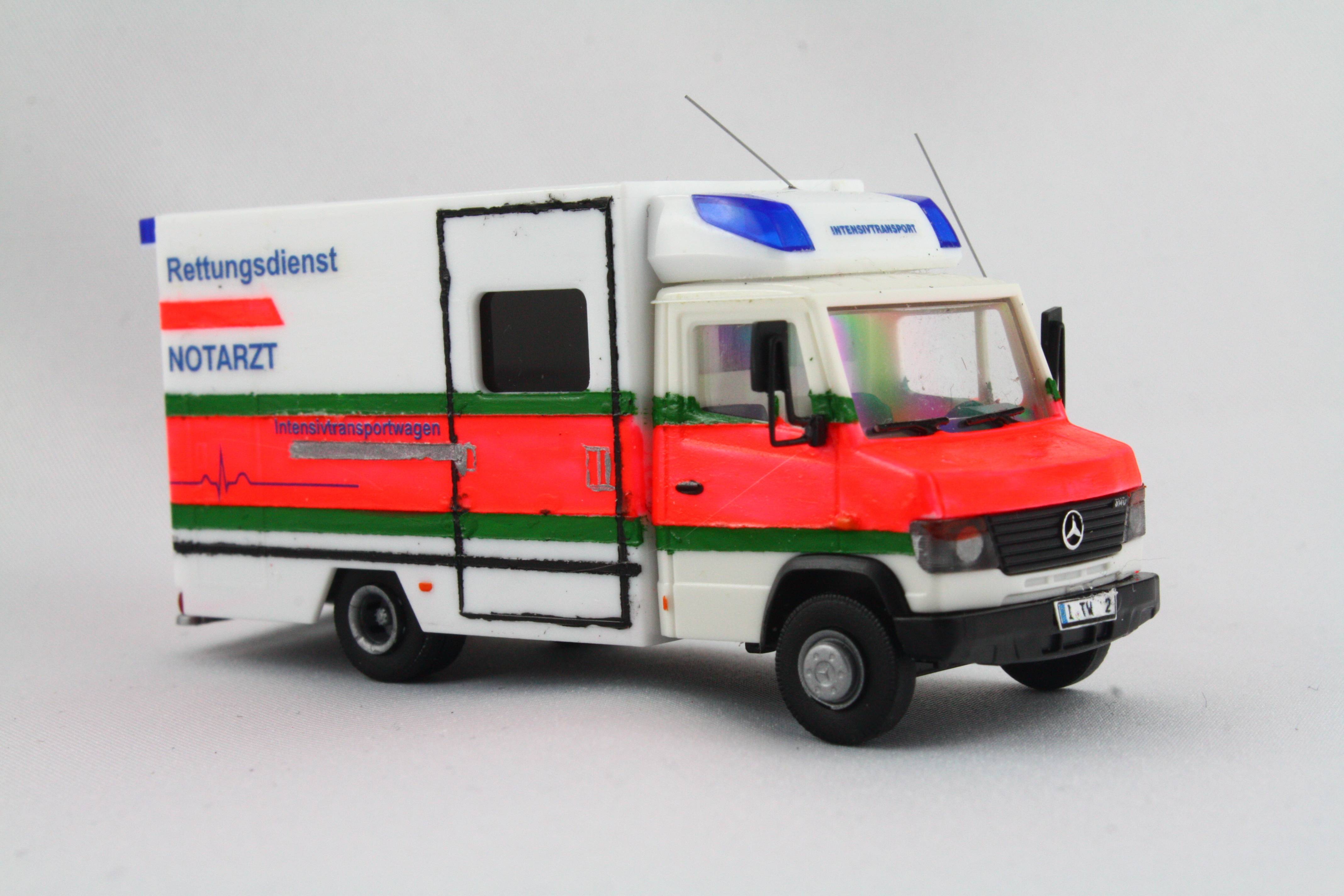 Das Modell entstand aus einer Busch V-Klasse und den RTW-Aufbau von Herpa. Sicherlich nicht ganz real, aufgrund des Gesamtgewichtes, aber ich fand einfach kein vernünftiges Fahrgestell. Und die V-Klasse sieht in meinen Augen richtig gut aus, sodass ich beide zusammenfügte. Das Design habe ich ähnlicher Form mal auf einem RTW gesehen, diese aber abgewandelt/erweitert.