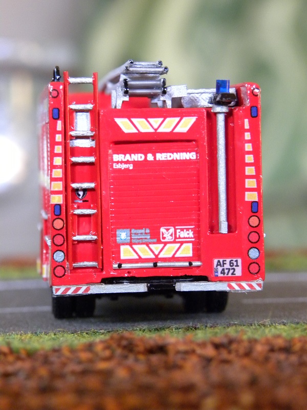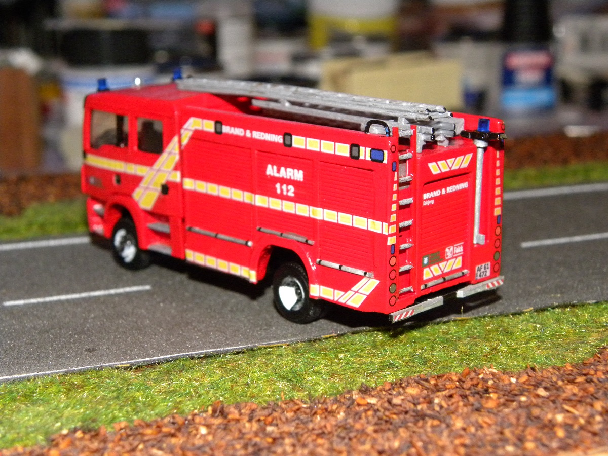 Einen MAN TGM TLF aus Esbjerg möchte ich hier vorstellen. Das Modell wurde auf einen Drehleiter Fahrgestell gebaut, und mit einen Fahrhaus von Scale87.com versehen. Der Kasten ist von TBM und wurde mit Lichtmast, teilweise aus Rietze Teile, und Leiterpaket versehen. Die Decals sind von Decalprint hergestellt. Das Vorbild fährt nicht länger in dieser Ausführung, sondern beim Grossfeuerwehr Sydvestjysk Brandvæsen.