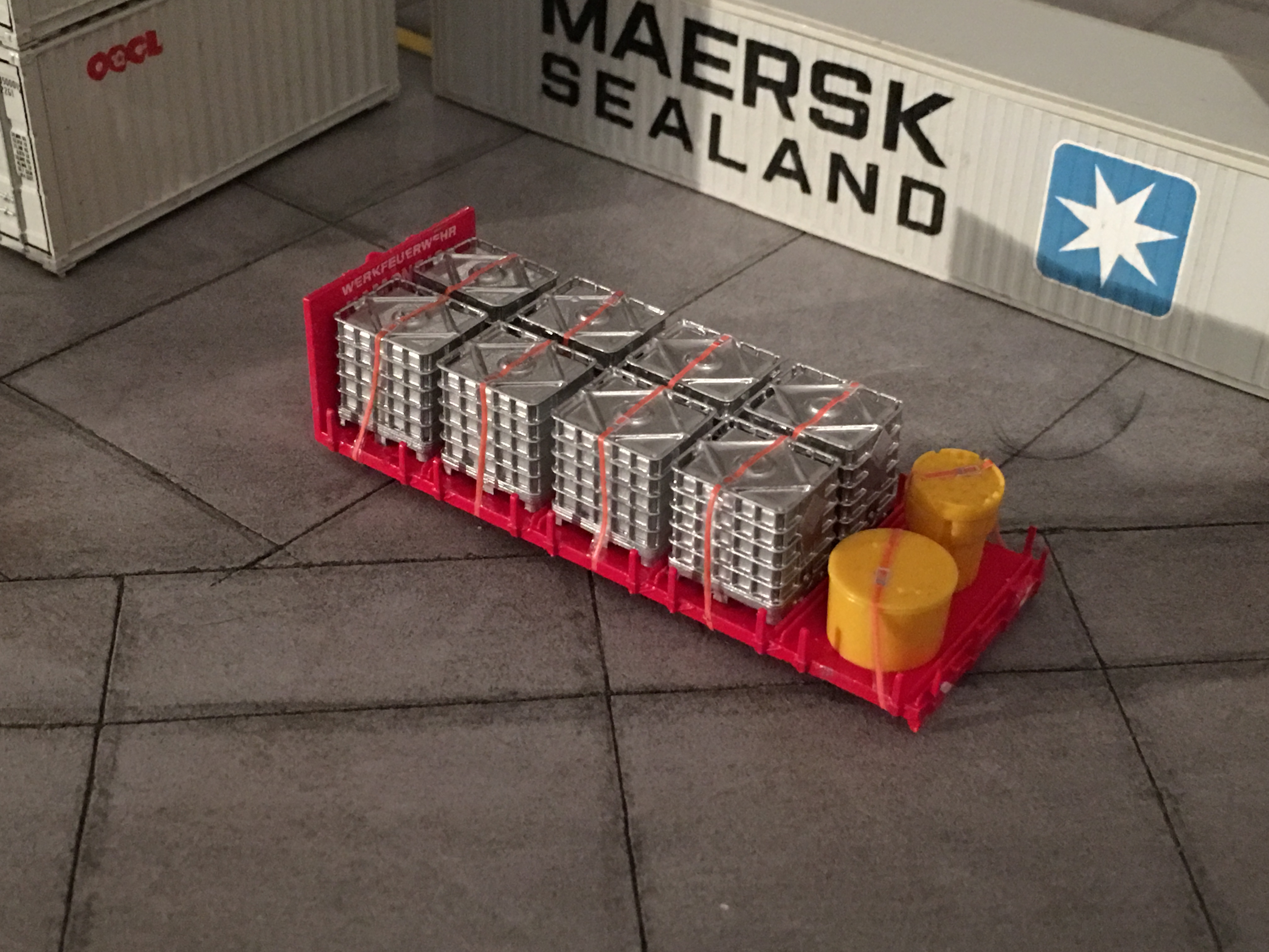 Der andere AB ist der AB-G-IBC zum aufnehmen von Gefahrgutstoffen, Vorbild ebenso FFM, er wurde wie das Vorbild mit Überfass und Wanne von Preiser ergänzt. Da die IBC's aus VA sind wurden sie hier einteilig gedruckt und lackiert. Decals wie beim anderen AB aus der Bastelkiste entnommen.
