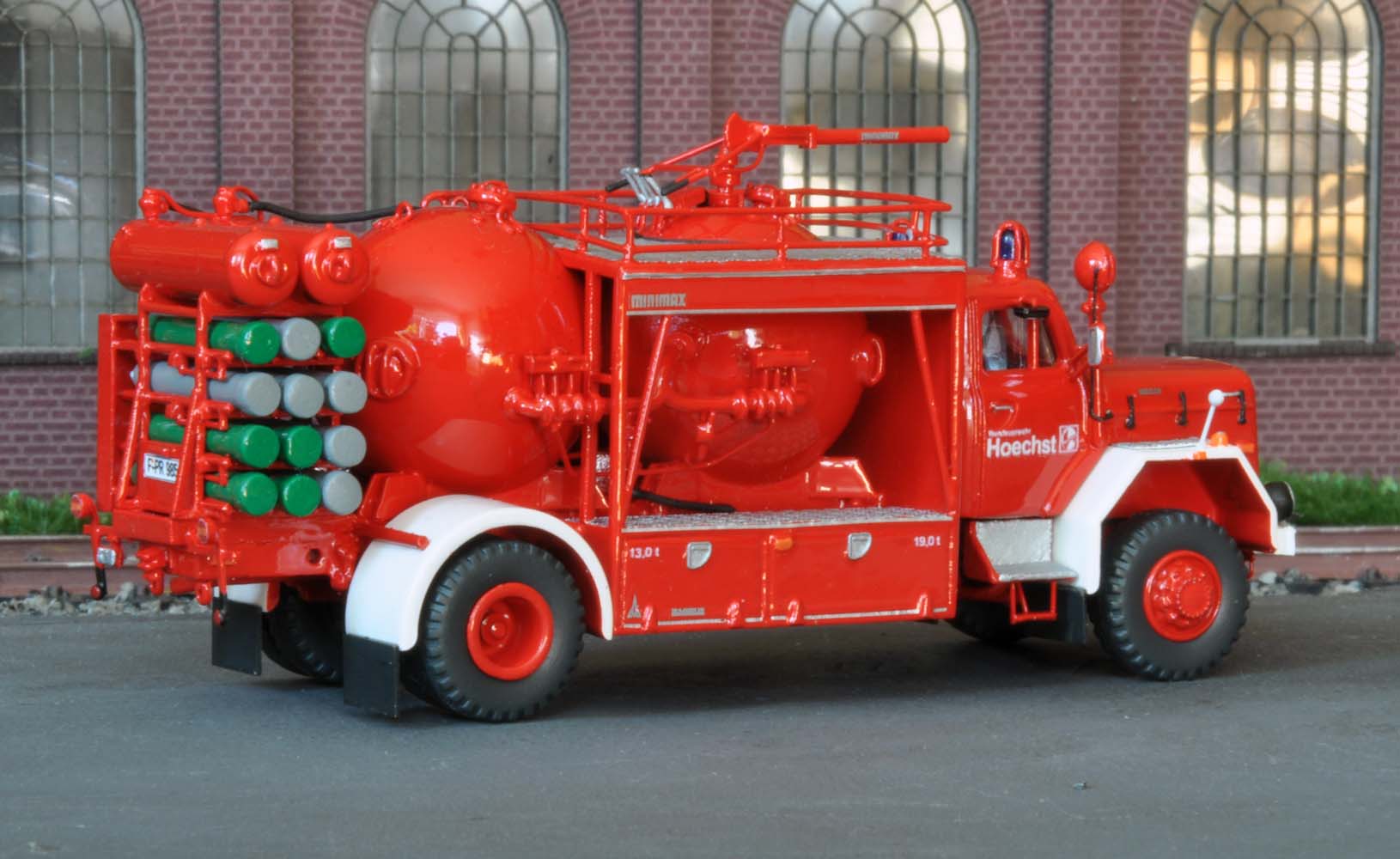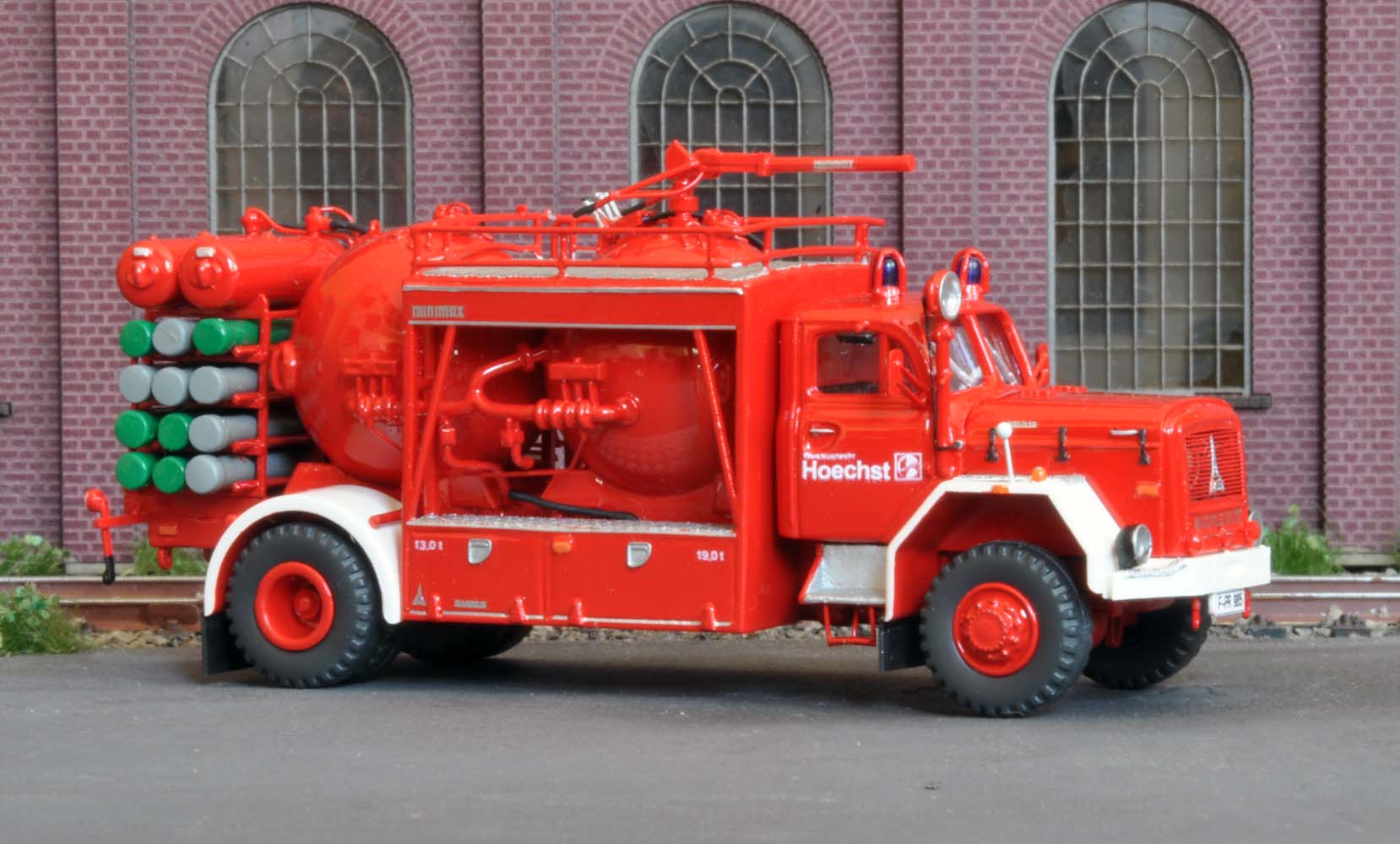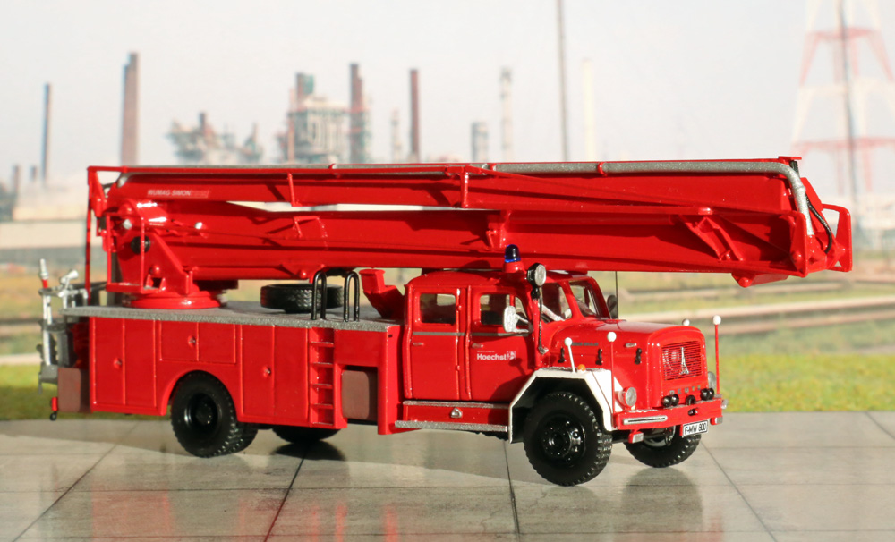 Auch der historische Fuhrpark meiner Hoechst-WF wächst langsam weiter. Nach FLF, SW und zuletzt der ersten GMB steht nun auch die alte DL 30 der WF in meinem verkleinerten Fuhrpark. Wie bei der zuvor vorgestellten Mannesmann-DL wurde die Eckhauber Staffelkabine durch eine Rundhauber-Truppkabine ersetzt und das Podium entsprechend geändert. Nur der Radstand konnte hier beibehalten werden. Dazu kommen eine Menge Kleinteile und eine selbstgebaute Vorbaupumpe auf Preiser-Basis. Der Rest wie schon bei den zuvor beschriebenen Rundhaubern.