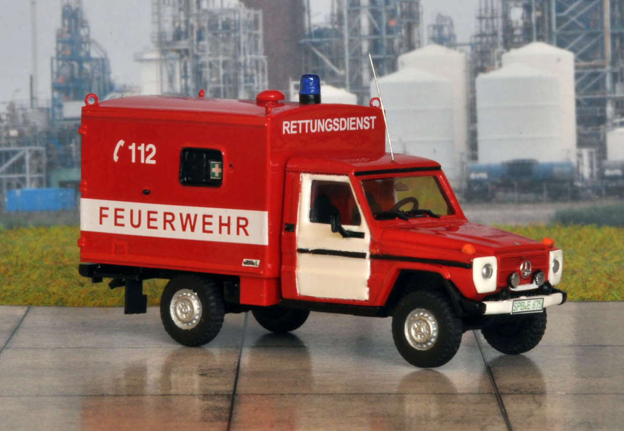 Neben den anderen G’s habe ich die Serie der Koffer-G’s komplett gemacht und noch den alten RTW der WF Laubag Schwarze Pumpe(heute LEAG) gebaut. Auch dieser basiert auf einem Herpa-VLF mit selbst gebauten Koffer. Die Fenster stammen von irgendeinem einem alten Rettungsdienst-Fahrzeug und fanden sich in der berühmten Bastelkiste.