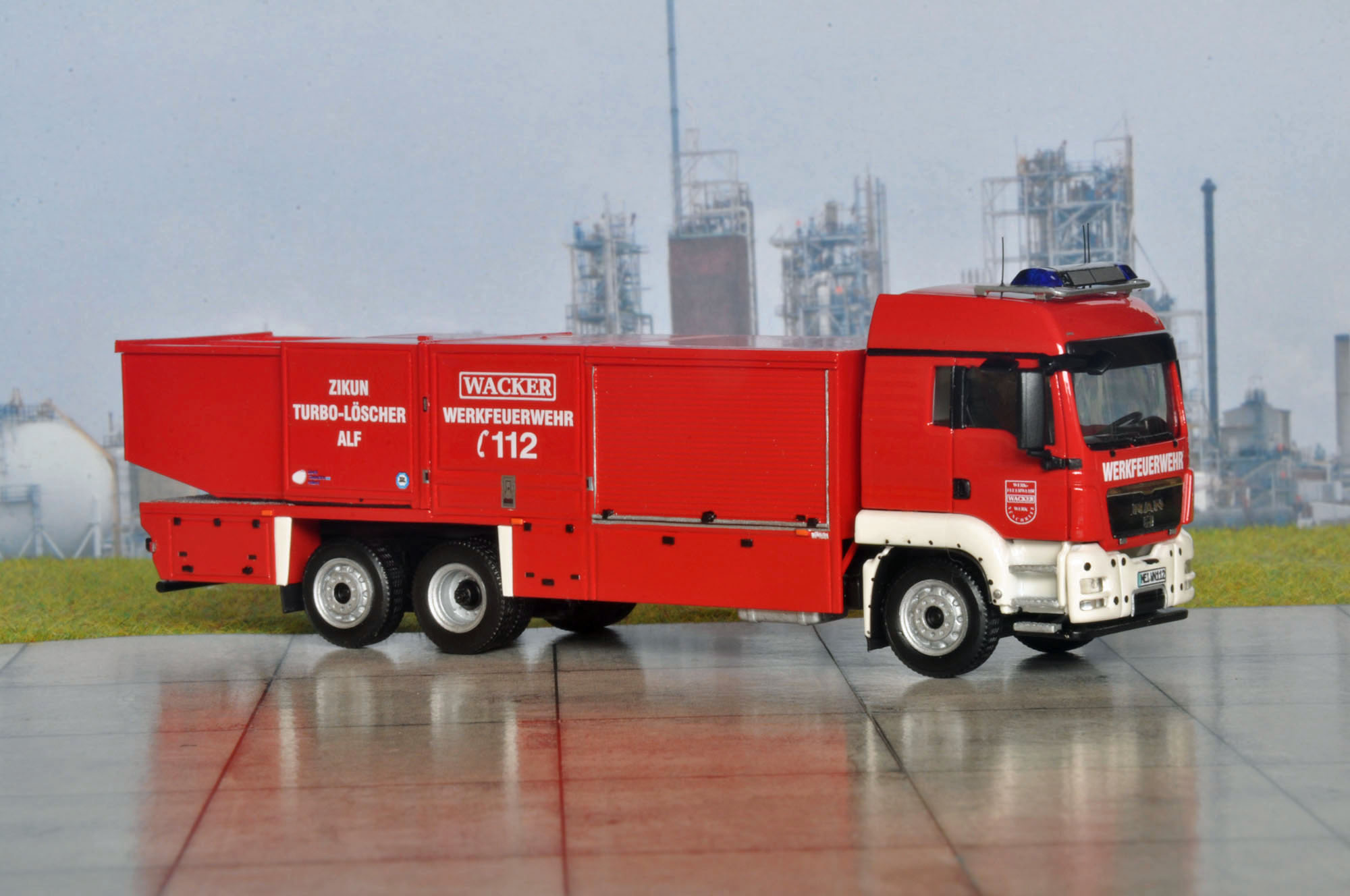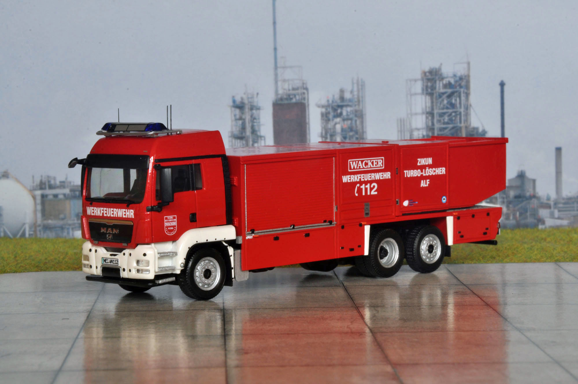 Basis ist ein Herpa-TGA. Da es die lange Kabine nur mit geschlossenen Trittstufen gibt, musste ich diese Verschlüsse entfernen und mir Platten neue Stufen bauen. Ich hätte natürlich auch mit einem anderen Kotflügel kombinieren können, wollte aber keinen weiteren mehr opfern. Und so schwierig war dieser Umbau auch nicht. In die Rückseite der Kabine kam wieder ein Fenster. Ab dem BASF Antwerpen-Turbolöscher wurde das Bedienfeld im Innenraum der Kabine geändert was ich auch, leider auch hier kaum noch sichtbar, nachvollzogen habe.