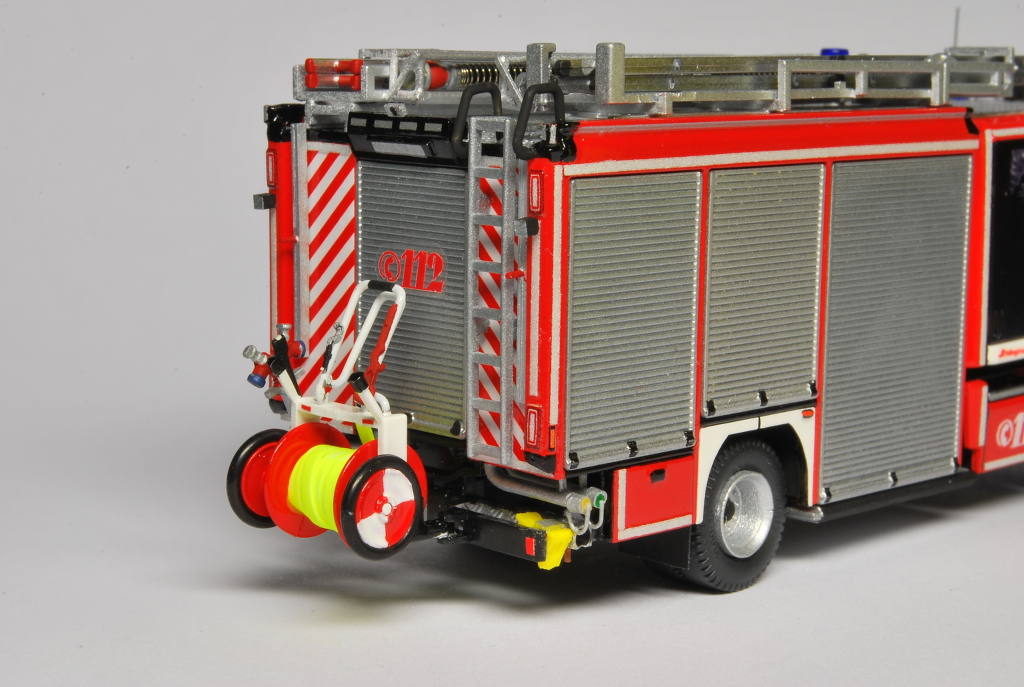 - Leiterlagerungen baulich verändert und mit Saugschlauchlagerungen und Einreißhaken versehen. (Saugschläuche von Herpa, Saugkorb vermutlich von Roco, Schlauchlagerung Eigenbau aus Kunststoffprofilen und Relingteilen, Einreißhaken aus der Bastelkiste)