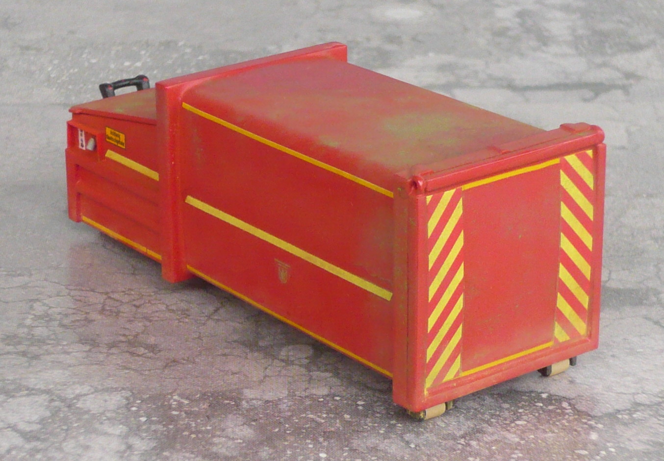 Der Selbstpresscontainer von Herpa wurde in mattem Rot (Tamiya XF-7) und mattem Schwarz von Humbrol mit dem Pinsel lackiert. Zuvor erhielten die seitens von Herpa angedeuteten Schalter und Taster beidseits einen Schutzrahmen aus Evergreen-Profilen (0,25 x 1,00 mm). Ergänzt wurde in diesen Rahmen auf der linken Seite eine Steckdose und ein 3D-Druck-Decal mit Drucktastern inkl. Notaus-Taste. Auf der rechten Seite hingegen wurde lediglich ein Notaus-Taster angebracht.
