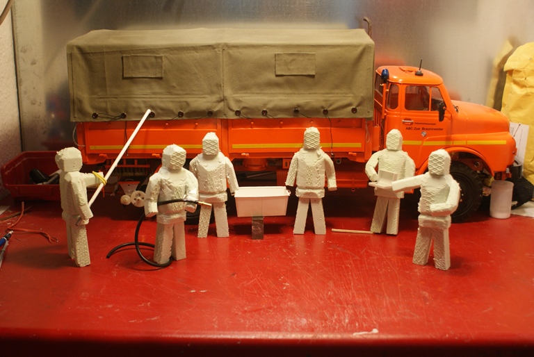 Ich bleib aber weiter dran.. Schließlich habe ich noch 8 modellierte Köpfe hier rumliegen, die noch verarbeitet werden müssen. Dann allerdings nicht mit ABC- Schutzanzug sondernmit Feuerschutzanzug und Helm. Und es gibt immer noch dem Traum von den sich ferngesteuerten bewegten Figuren.