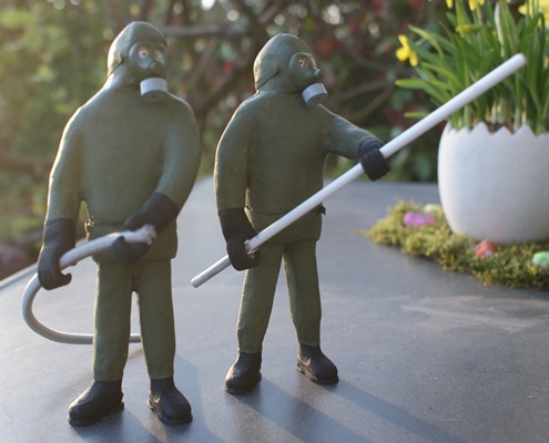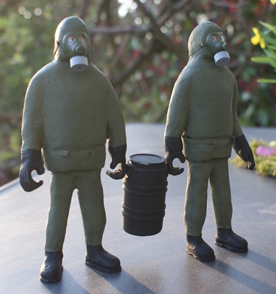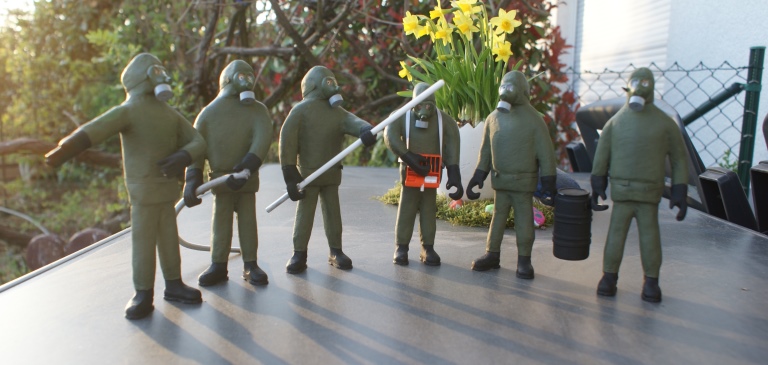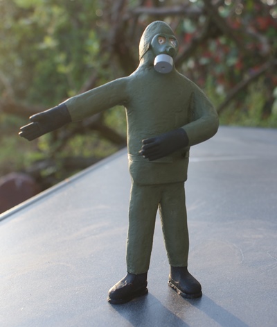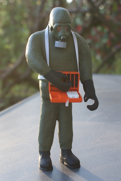 Hallo Ralf, das schlimmste an den großen Figuren ist die Herstellung der Bekleidung. Ich mache diese ja nicht aus Stoff sondern mittels Papiertaschentüchern die dann mit einer Holzleim/ Wassermischung eingepinselt werden. Leider verhält sich das Papier beim nass werden nicht immer ganz optimal. Es gibt immer zu viele Falten. Besonders bei den Schutzanzügen wird es sicherlich einige Schleiferei oder sogar Schnitzerei geben bis das halbwegs nach etwas ordentlichem aussieht. Das Schlimmste am Figurenbau sind aber Hände und Köpfe. Beides wird aus FIMO Modelliermasse hergestellt. Das Problem bei den Händen ist die Stabilität und das man für jede Figur spezielle Hände herstellen muss. Bei den Köpfen ist das Aussehen immer kritisch, was aber hier entfällt weil alle Figuren Atemschutzmasken aufhaben.