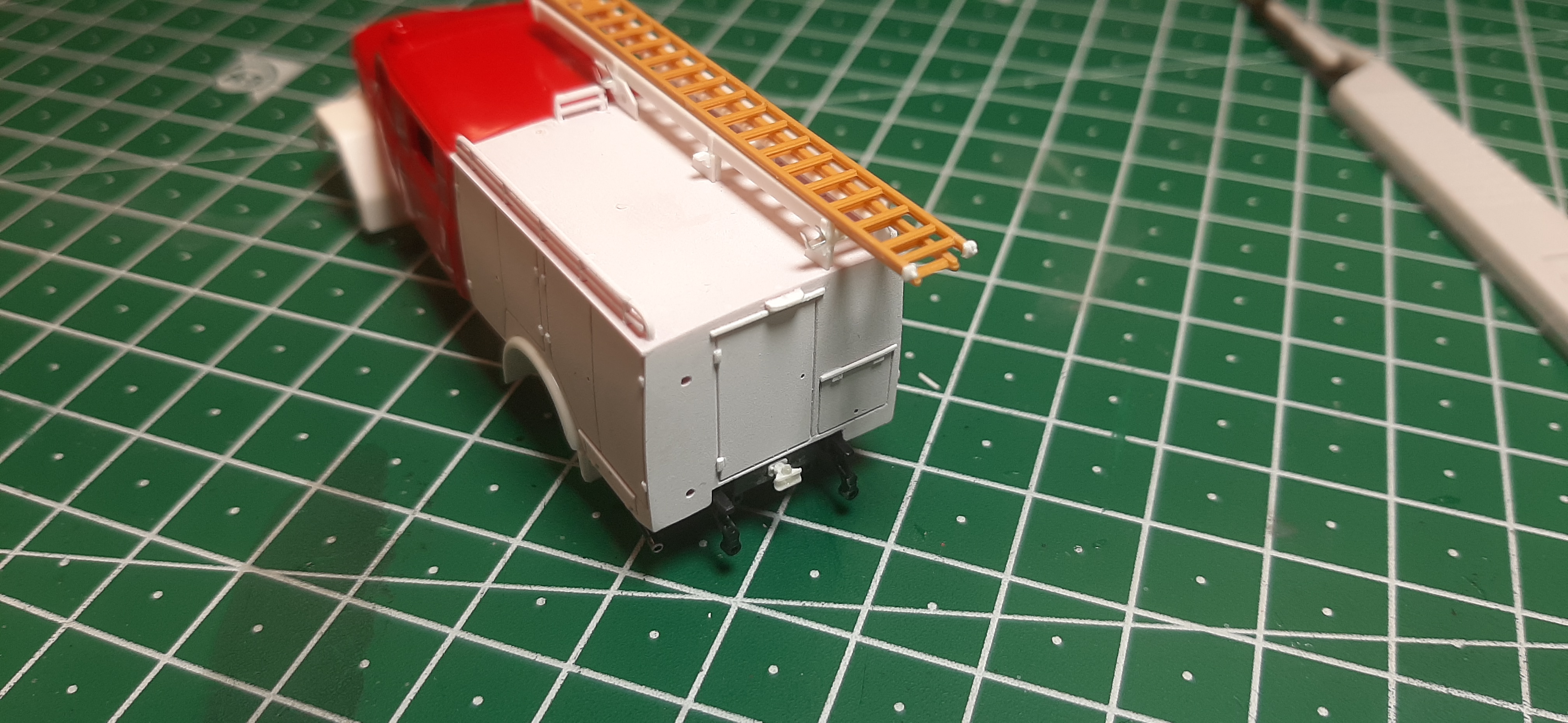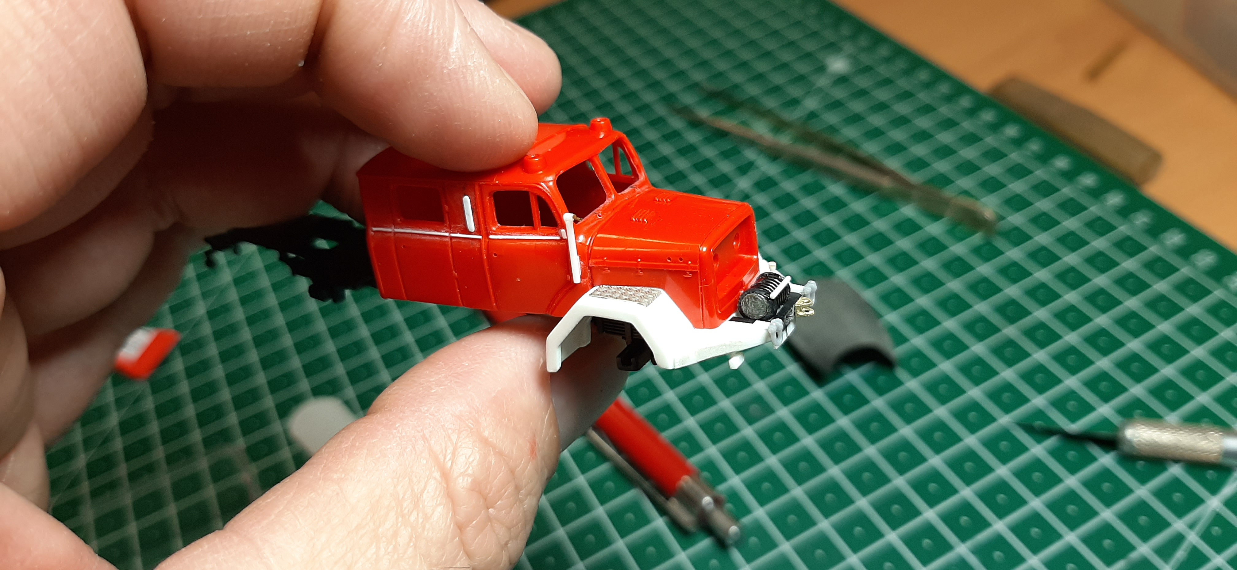 das Modell wird ja richtig schick. Besonders gefallen mir die Leiterauflagen und die Front mit der Seilwinde. Du hast dir die Mühe gemacht und extra Zierleisten unter den Fenstern angebracht. Willst du die später silbern lackieren oder Streifendecals aufbringen?