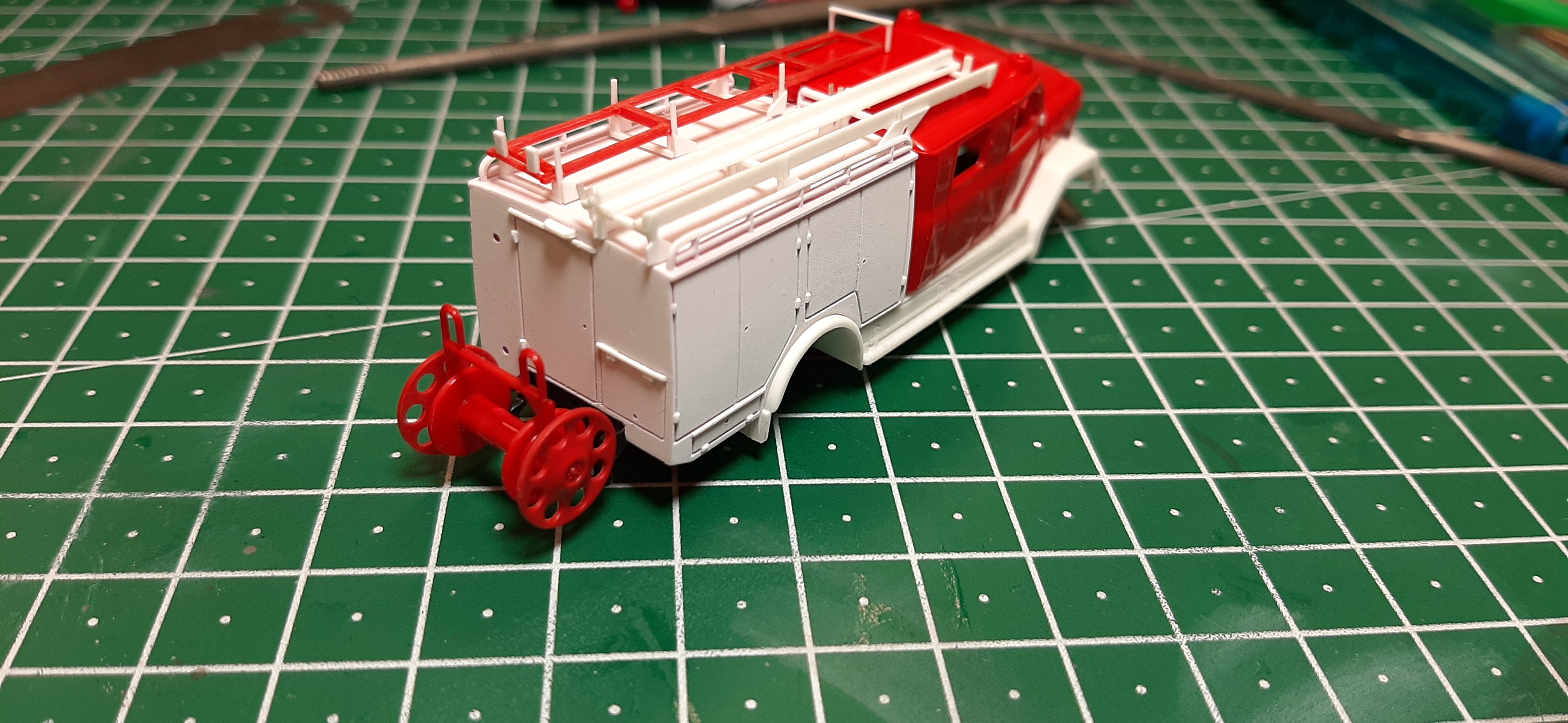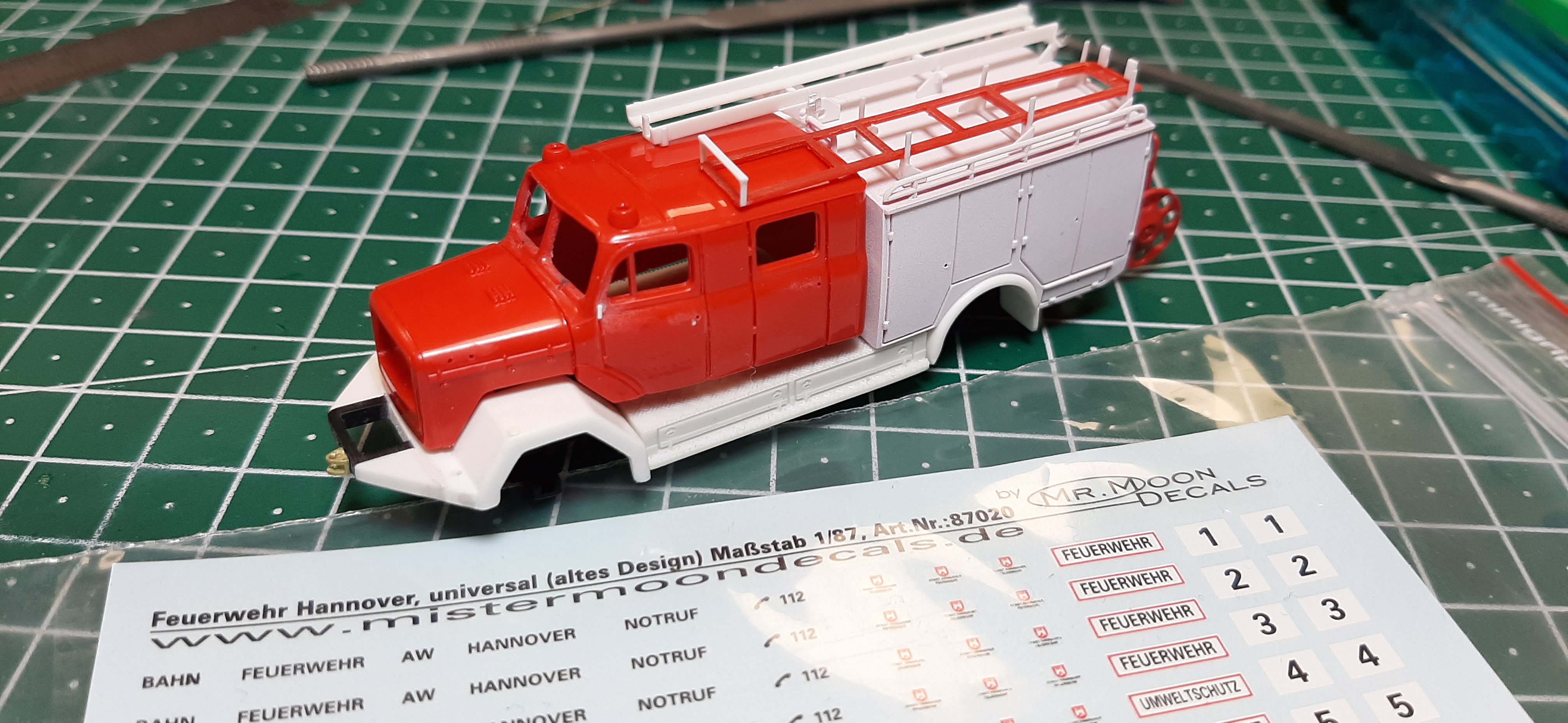 Lange habe ich mit dem LF 16 LP der Bahnfeuerwehr des AW Hannover auf Magirus Eckhauber geliebäugelt, für das Lars Müller aussagekräftige Vorbildfotos beisteuerte . Vor einiger Zeit habe ich dann mit einigen Pausen angefangen, das Fahrzeug in´s Modell umzusetzen, dessen Basis der recht schöne Preiser-Bausatz ist. Als erstes gibt´s heute mal ein paar Bilder aus der Rohbauphase zu sehen. Grundlegende Änderungen sind am Aufbau erfolgt, hier musste die Heckpartie mit der anderen Klappenaufteilung neu gestaltet werden. Die Leiterhalterungen habe ich aus den beiliegenden Teilen sowie aus Profilen (ich verwende lieber Plastruct als das Immergrüne...) komplett neu gebaut. Die Stoßstange mit der Winde entstand ebenfalls im Eigenbau. An Zubehörteilen finden sich Teile von Weinert, gedrucktes von Markus Hawener und Remember Mr. Moon. Der Decalsatz stammt noch aus der alten Mr-Moon-Fertigung. Ansonsten wie immer reichlich Details, die eine fertig machen.