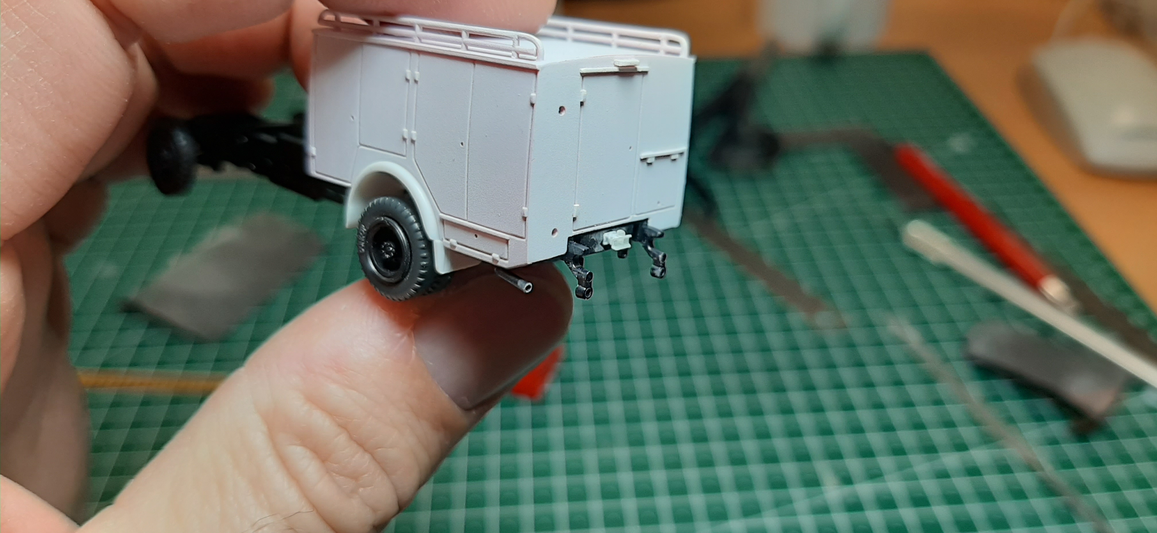 lange habe ich wenig von mir hören bzw. sehen lassen. Hierfür gibt es diverse Gründe. Die Lust am Modellbau war in den letzten Jahren eher mäßig und wenn, dann hab ich eher was aus der nicht roten Fraktion auf die Modellräder gestellt. Nun aber geht ein lang ersehntes Modellprojekt in die "schöne" Phase, soll heißen, es steht gerade auf dem Lackiertisch und bekommt Farbe. Wie immer habe ich vorher alle Teile vorgefertigt, bevor ich dann alles zusammen lackiere. Dann muss man nicht ständig die Airbrush sauber machen usw.