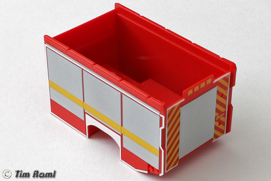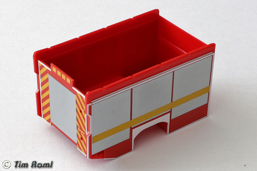 Wie befürchtet ist es ein einziger Klumpen. Sowohl Rollos als auch Radlauf sind fest eingegossen und nur "geprägt" und anschließend bedruckt. Die obere Aufbaukante ist recht schön, wie man den Rest verbessern könnte bin ich mir noch nicht sicher. Der Lichtmast stellt ein aktuelles LED-Modul dar, ist aber nicht wie beim Prototyp 3D. DIe Leiterhalterungen sind die bekannten Modelle, die Aufstiegsleiter am Heck ist neu. Das Dacj ist neu und besitzt Abstandshalter zum Erhöhen der Leitern.