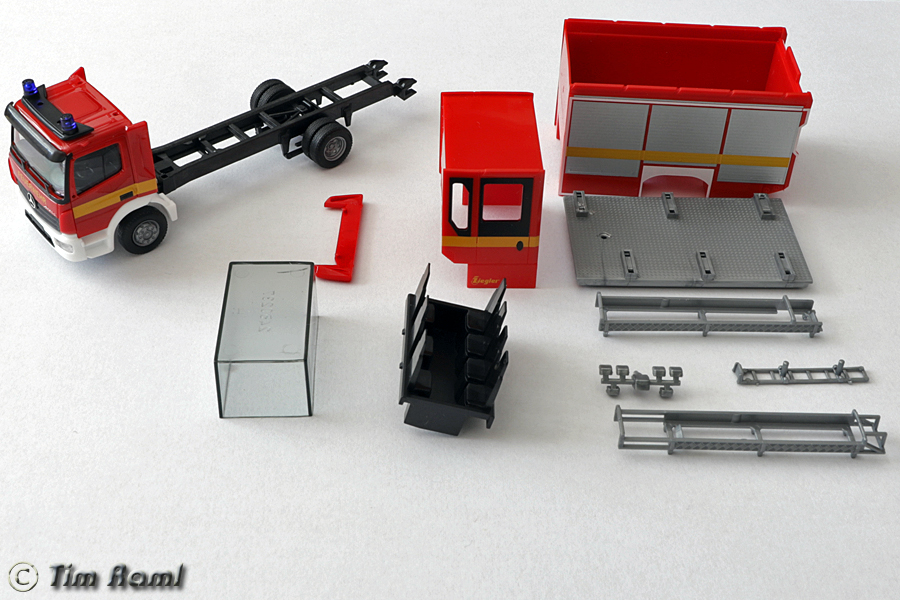 Der Alkoven von der Atego-Kabine zur Z-Cab ist angegossen. Die obere Abdeckung ist ein einzelnes Teil. Dadurch wäre es möglich darauf auch eine Abdeckung mit integrierten Blaulichtern zu setzen...so rein theoretisch.