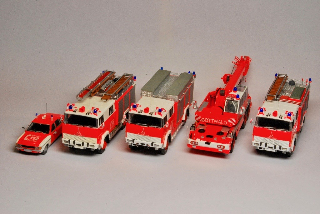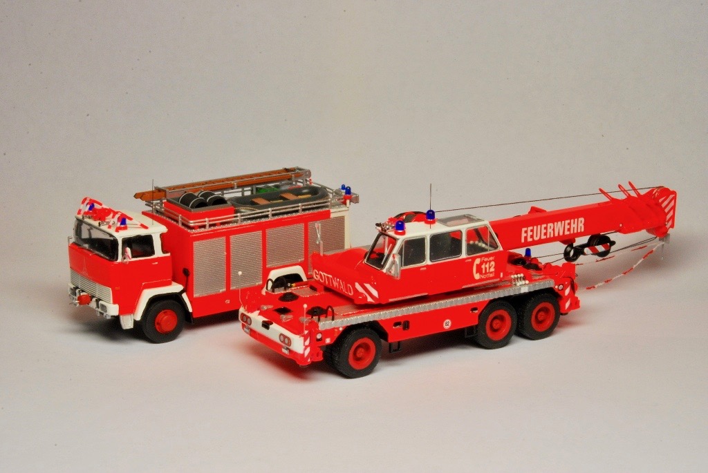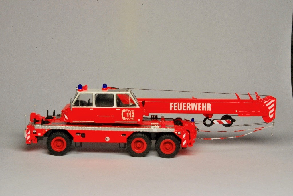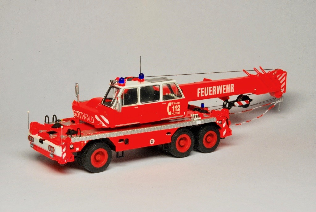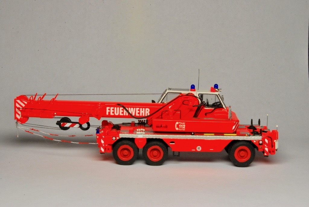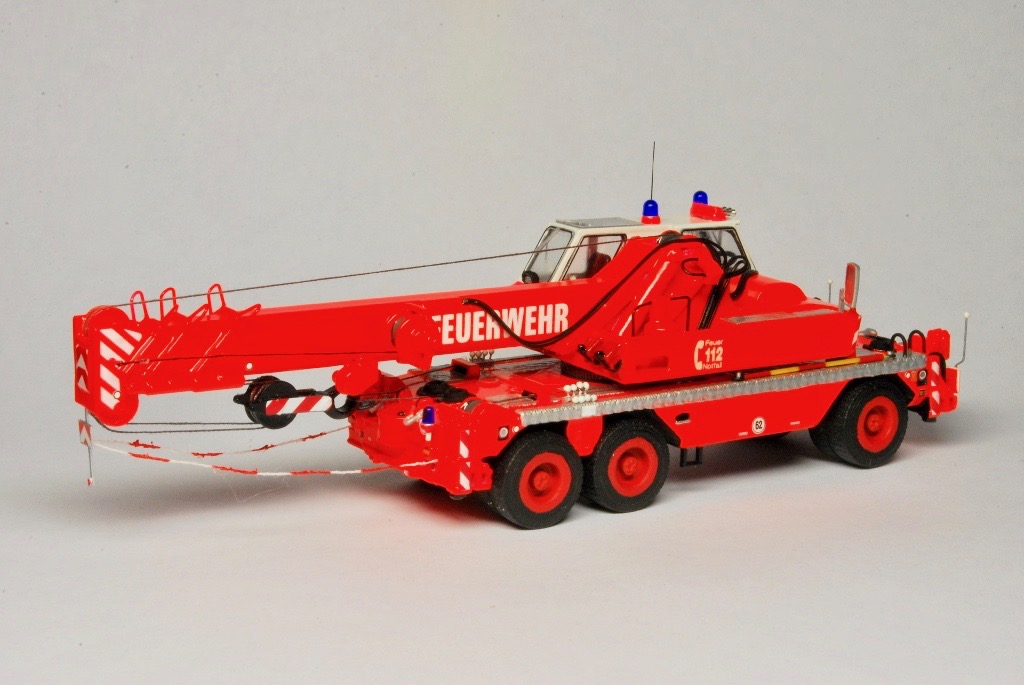 Bei dem Grundmodell handelt es sich um ein 3D Druck Modell von Markus Hawener, das lediglich aus dem Unterwagen, dem Oberwagen, der Kabine, der Kranflasche und sechs Rädern besteht. Neben einzelnen Teilen aus der Bastelkiste (Peilstangen, Sitze, Lenkrad, Blaulichter, Spiegel usw.), kam auch ein Decalsatz von Markus Sterken zum Einsatz. Der Satz beinhaltete unter anderem die Warnschraffuren, die Frontscheinwerfer, Typenschilder, die Fenster sowie die Rückleuchten.