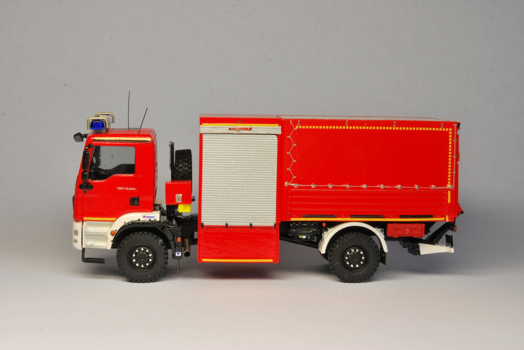 Der Bausatz des Modells stammt von Allgäu-Modellbau und wurde weitestgehend aus der Schachtel gebaut. Die Decals sind von MBSK, genau wie die Kraftstoffkanister unter der Ladefläche auf der Beifahrerseite. Der Blaulichtbalken kommt von Rietze.