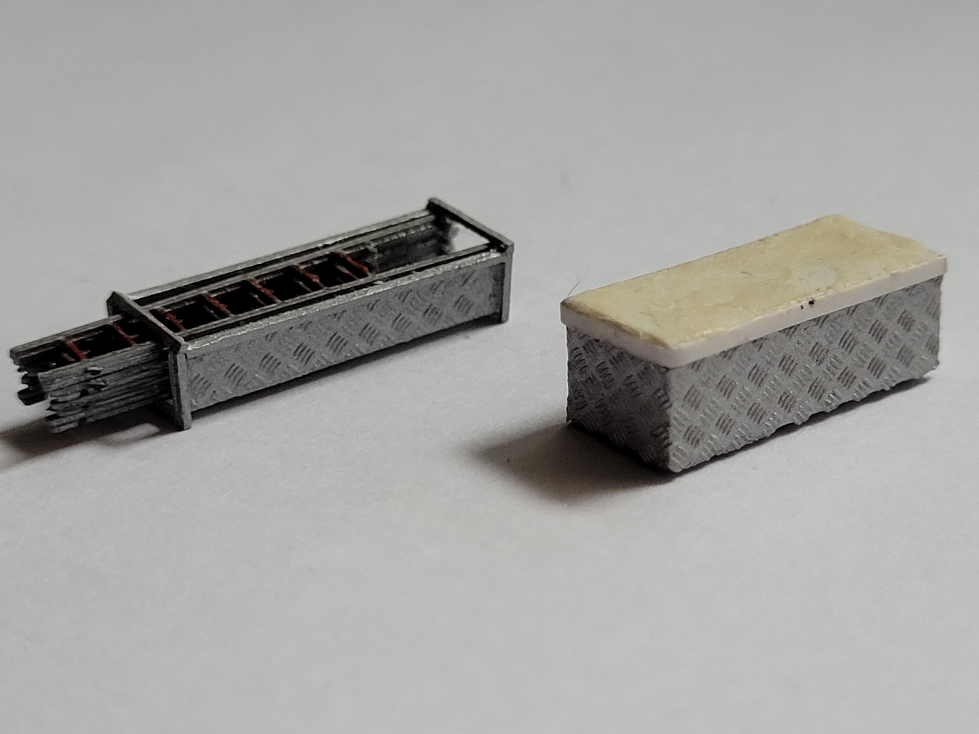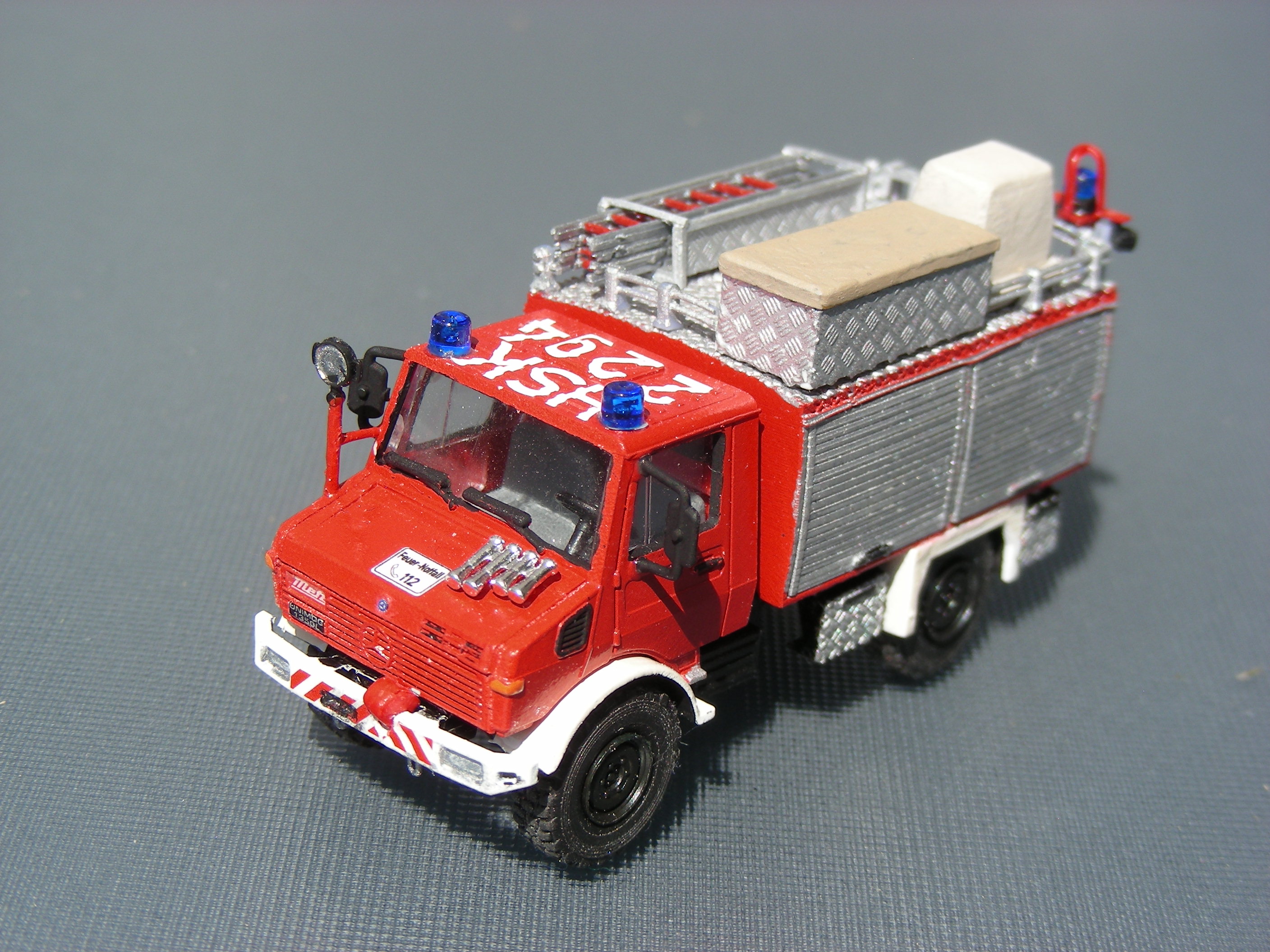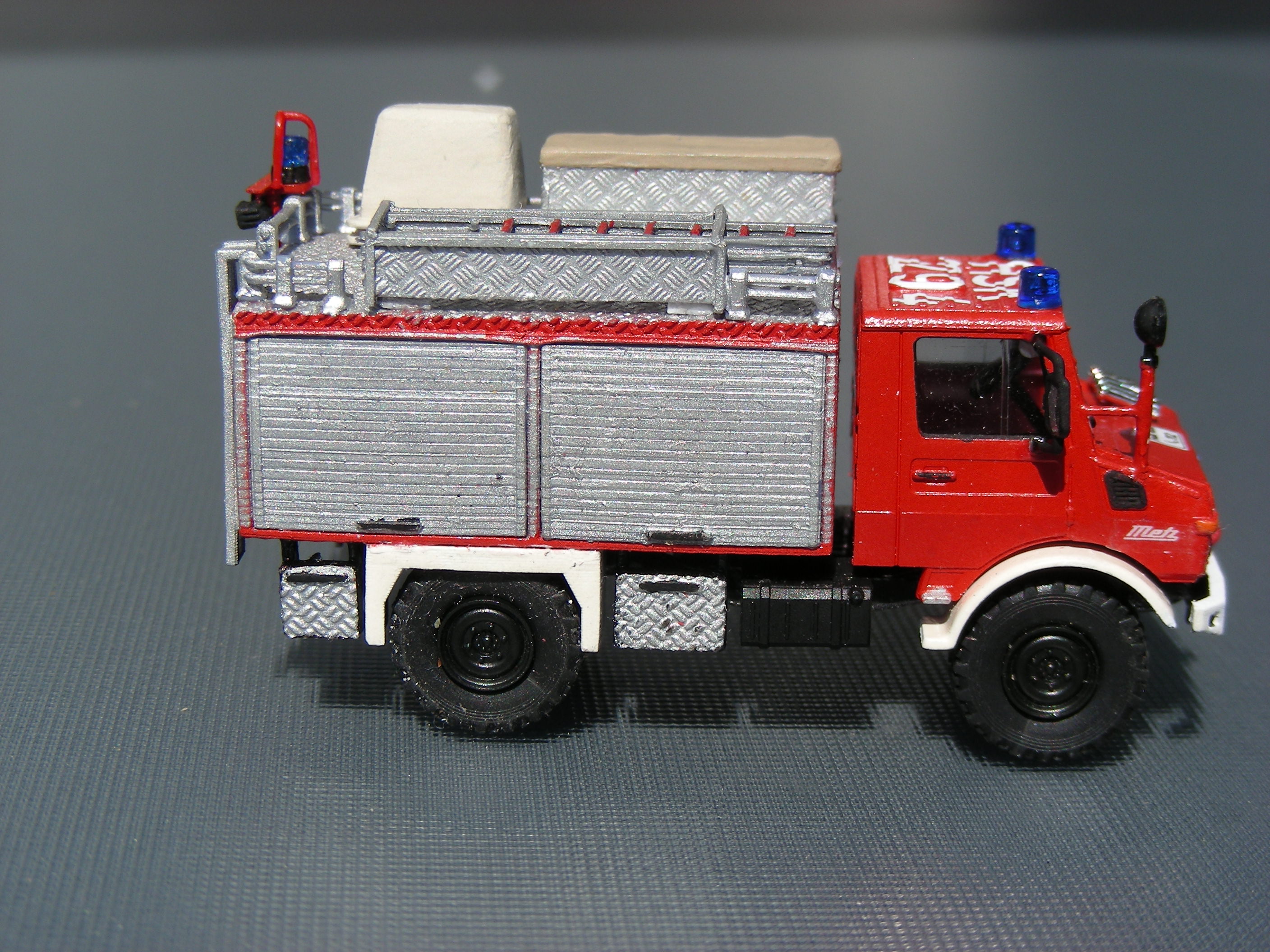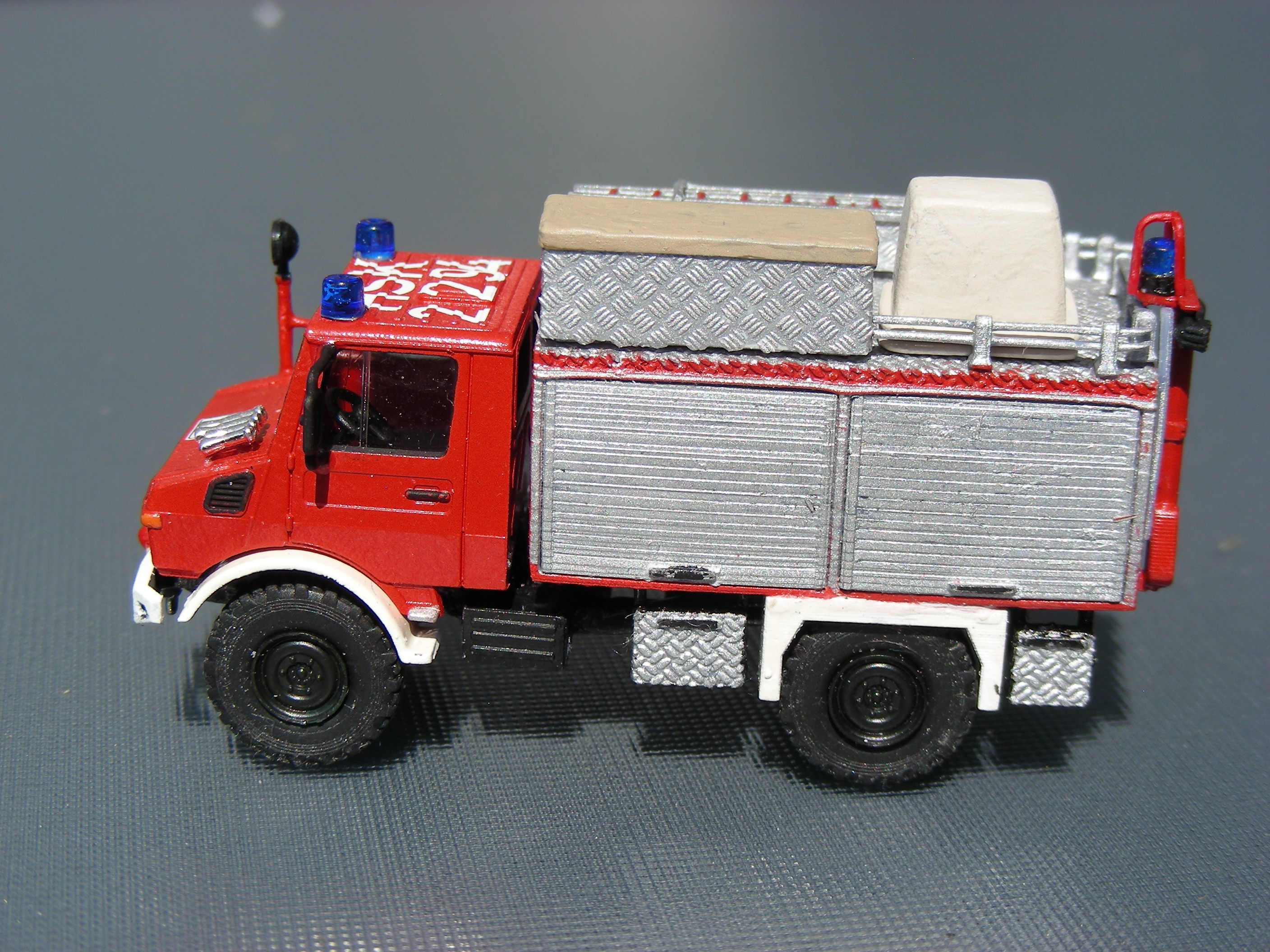 Basis war ein Roco Unimog aus dem Teilevorrat. Den Aufbau und die Anbauteile unterhalb der Dachkante habe ich komplett original übernommen und verbaut. Die Dachbeladung musste natürlich dem Winterberger Vorbild angepasst werden. Die Reling habe ich aber aus Stücken aus dem Umbausatz zusammengesetzt. Die Leiterhalterung und der Dachkasten sind aus Evergreen, welches mit dem 3D-Decal Riffelblech von Markus Hawener "beplankt" wurde - das Baubild habe ich seinerzeit schon mal als Testbild gepostet: