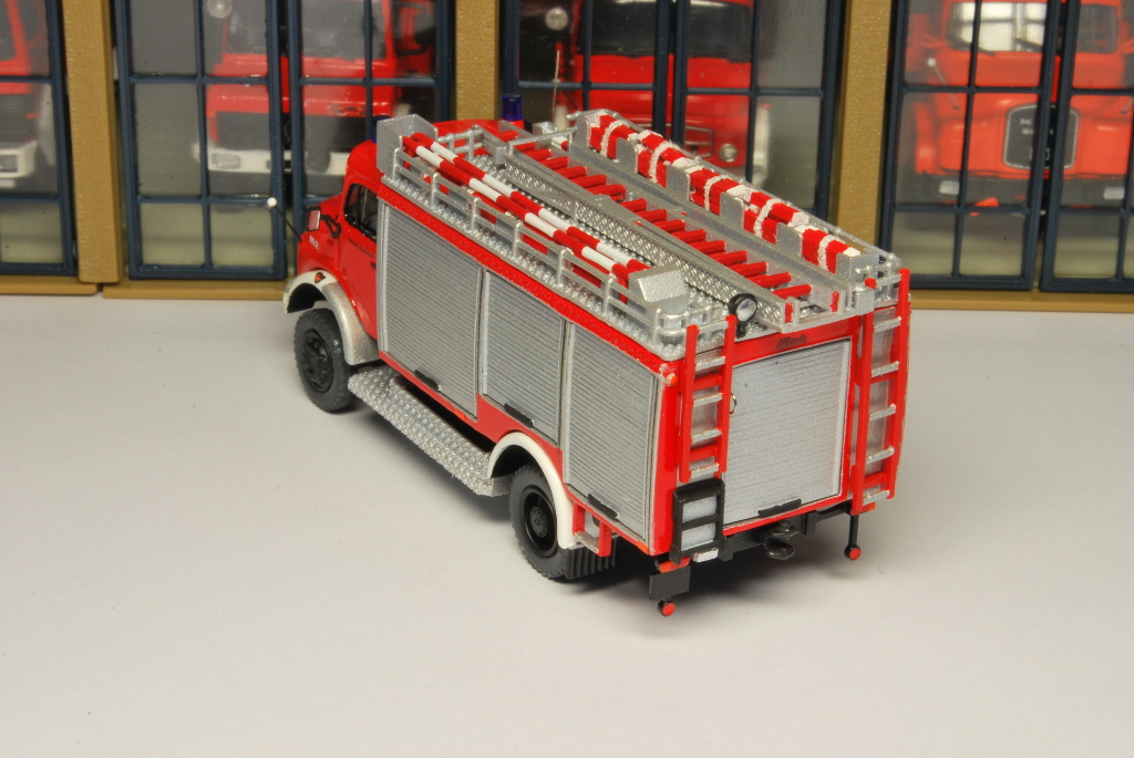 Hierbei handelt es sich um einen 3d-Druck-Bausatz von Stephan Volpers-Riedel. Der Satz beinhaltet das Fahrgestell, das Trittbrett, den Aufbau, die Kotflügel, einzelne Jalousien, die Aufstiegsleitern, eine Dachplatte, die Steckleiter samt Lagerung sowie die Schlauchüberführung samt Gestänge. Ansonsten braucht es dann noch eine Kurzhauber-Truppkabine und Räder von Preiser, ein paar Kleinteile aus der Bastelkiste sowie Schlauchbrücken. Letzteres habe ich selbst aus Profilen erstellt.