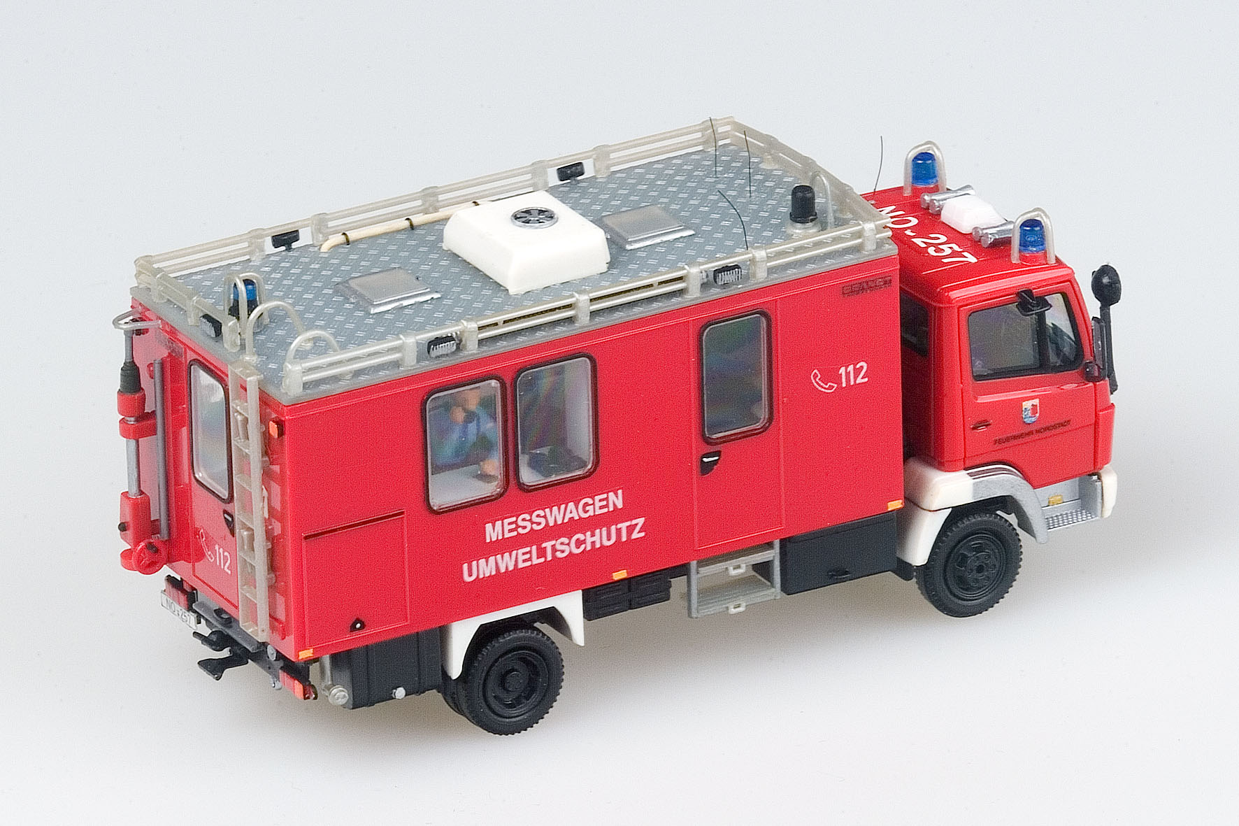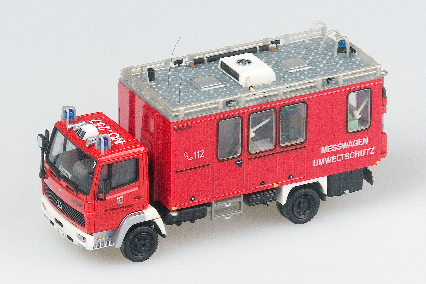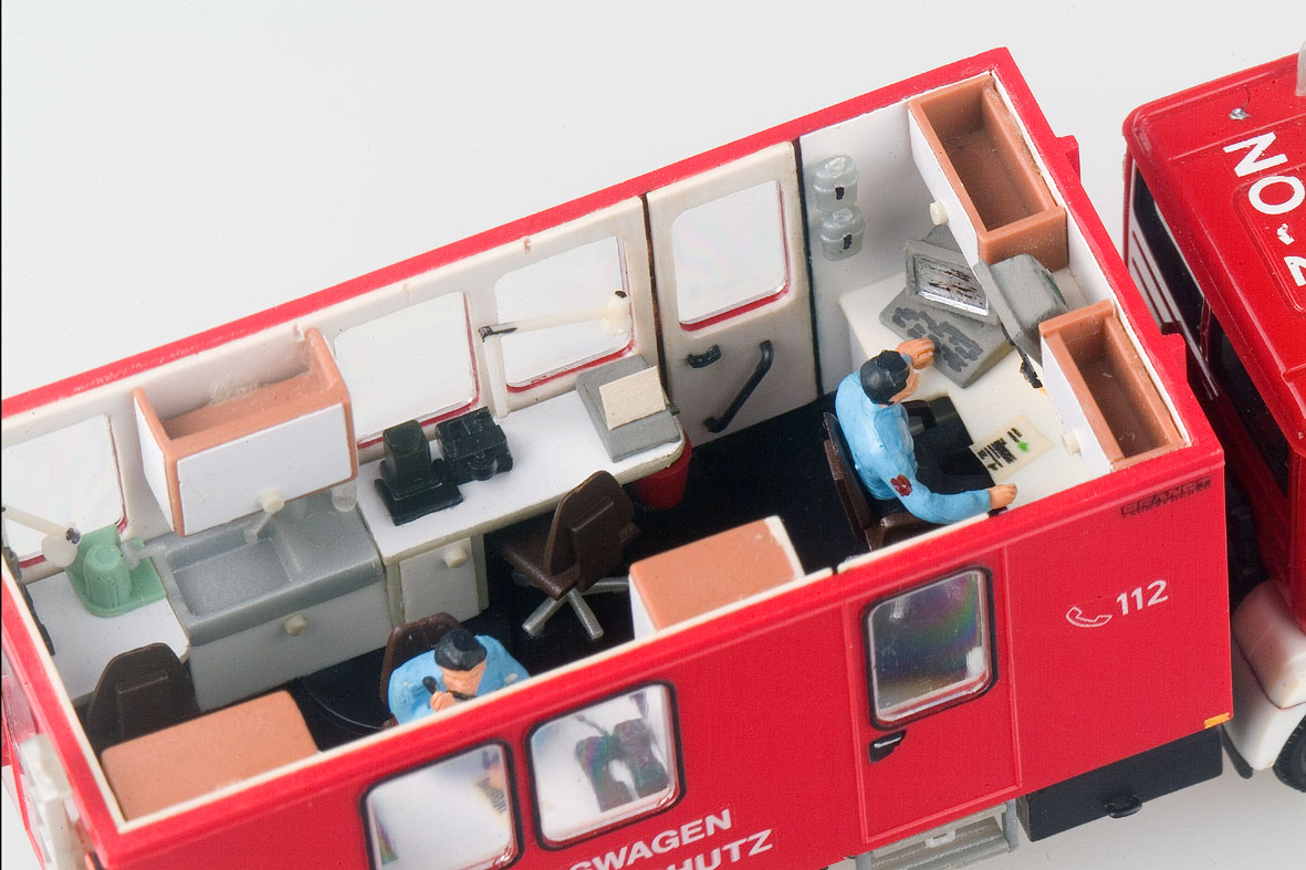 Fahrgestell und Aufbauboden sind dem Einsatzzweck entsprechend ausgerüstet: Staukästen, zwei Batteriefächer, Frisch- und Abwassertank, Kraftstofftank und ein Unterfahrschutz mit Rückleuchten ergänzen das filigrane Herpa-Chassis. Die glatte Dachfläche des Wiking-Koffers musste einer Riffelblechplatte vom Preiser-Wechsellader Platz machen. In das neue Dach wurden zwei quadratische Öffnungen gefräst und die transparenten Luken des Wiking-Wohnmobils „Sven Hedin“ eingesetzt. Erstmals bei einem Fahrzeug der Feuerwehr Nordstadt ist eine aus fünf Roco-Scheinwerfern bestehende Umfeldbeleuchtung in die Dachreling integriert worden. Messköpfe auf dem Dach und am „Schnüffelmast“, eine Preiser-Klimaanlage, mehrere Funkantennen und ein Abgasschlauch vervollständigen das Äußere des GW-Analyse.