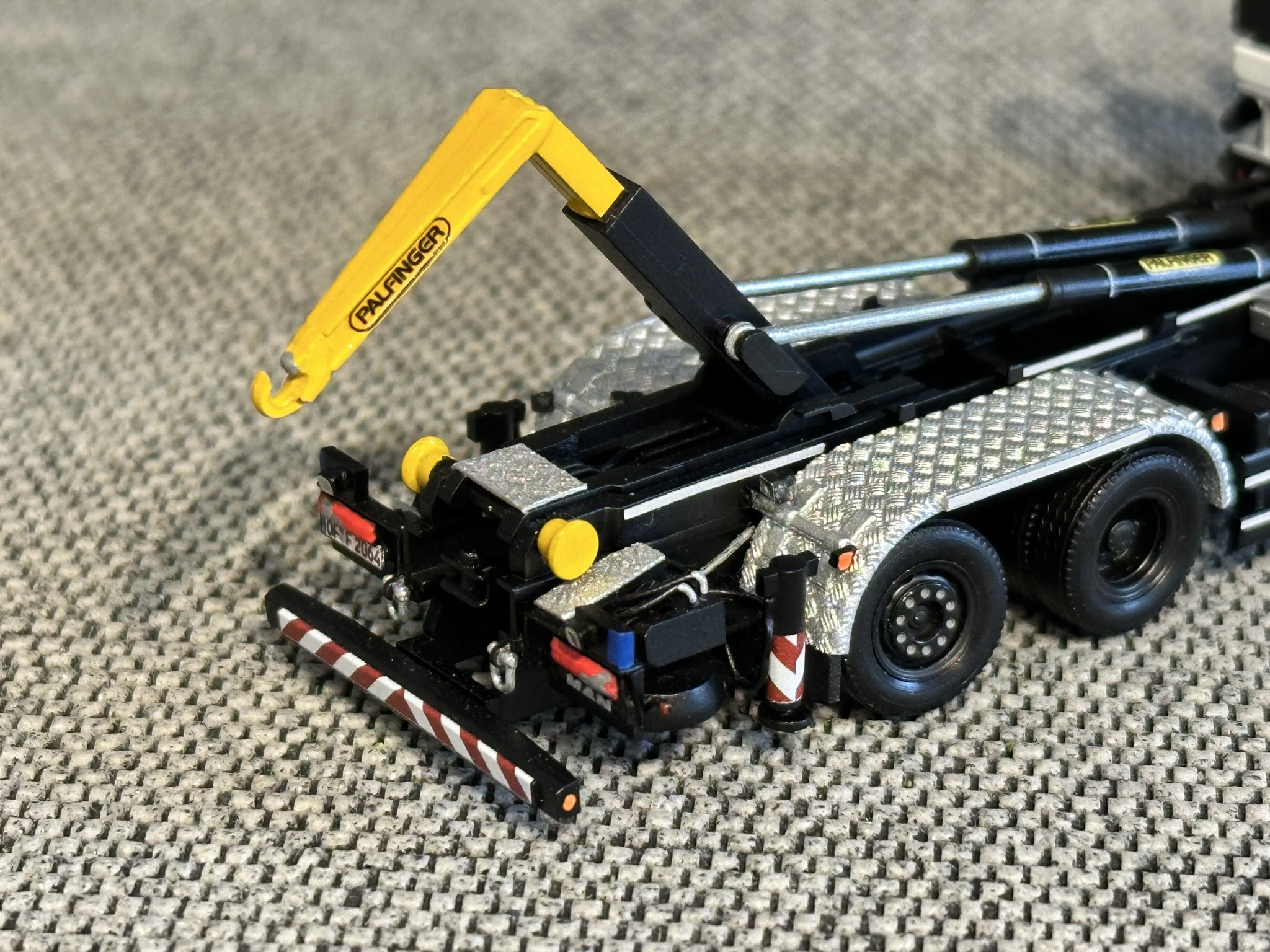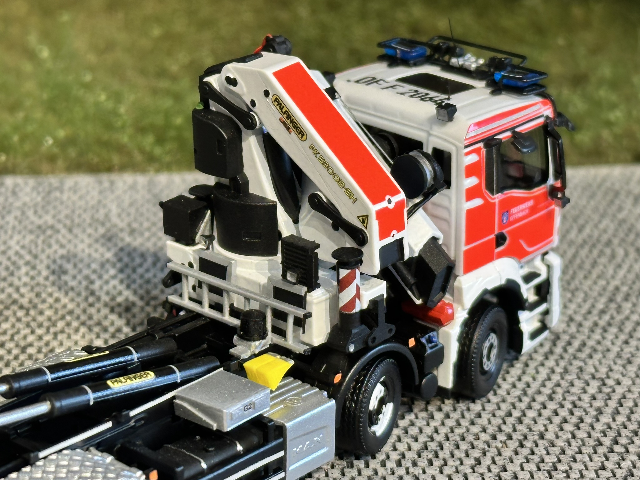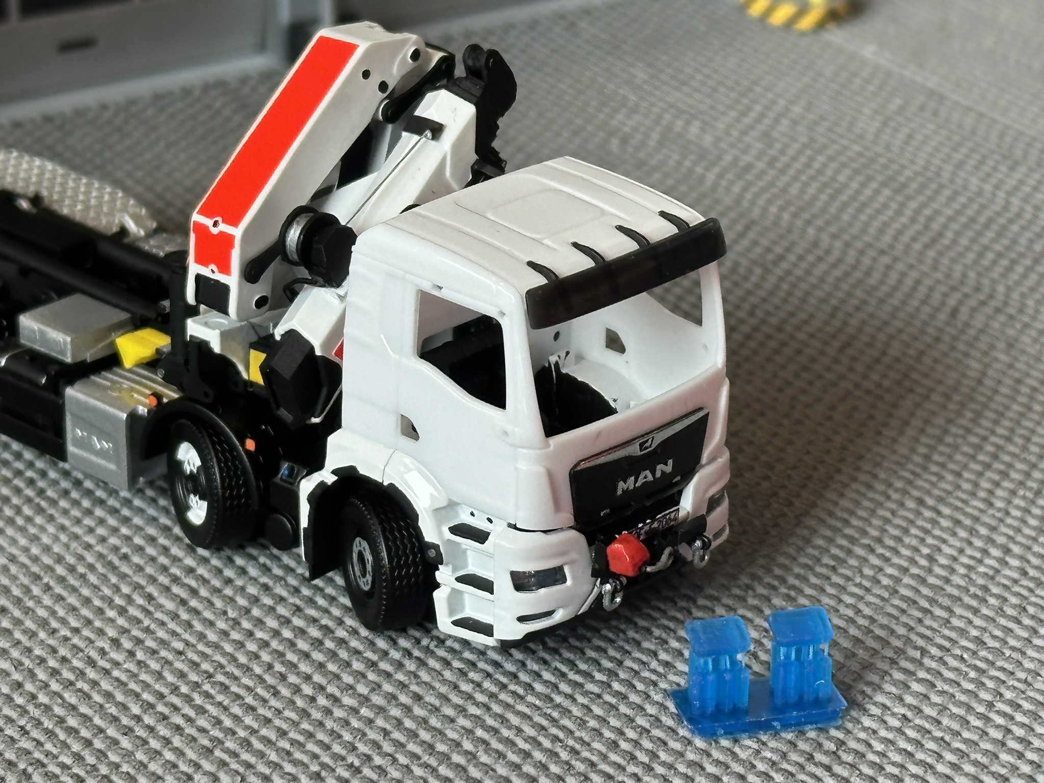 Das Modell basiert auf zwei Fahrgestellen aus dem Hause Herpa Miniaturmodelle GmbH. Diese wurden geteilt und mit angepasstem Radstand wieder zusammengesetzt. Die Kabine des MAN TGS sowie die Bereifung stammen ebenfalls von Herpa. Der Palfinger Ladekran stammt von Elbe-Modell (EM178) und ist ein unbeweglicher 3D-Druck Bausatz. Weiterhin wurde das Modell durch die markanten Riffelblechkotflügel an den Hinterachsen von MMH-modellbau ausgestattet. Staukästen und Anbautanks lieferte DS-Design. Viele Details wie die Seilwindentrommel mit Seilführung, die Unterlegplatten für die Abstützung, die Abstützung selbst wurden aus Evergreen-Profilen erstellt. Eine besondere Herausforderung waren die Astabweiser auf der Kabine. Da es hierfür keinerlei Bauteile aus der Großserie gibt, wurde dieser aus Messingprofilen selbst gebaut. Die Blaulichtbalkenmodule (Hänsch DBS 850) wurden für uns von Flavio Huneke als 3D-Teil gezeichnet und in blauem (transparenten) Resin gedruckt. Anschließend wurden die Einzelteile lackiert und zusammengebaut. Die Decals am Modell wurden selbst gezeichnet und anschließend der Druck in Auftrag gegeben. Nach der Lieferung und der Anbringung der Decals wurde das Modell schließlich komplettiert und die letzten Details angebracht.