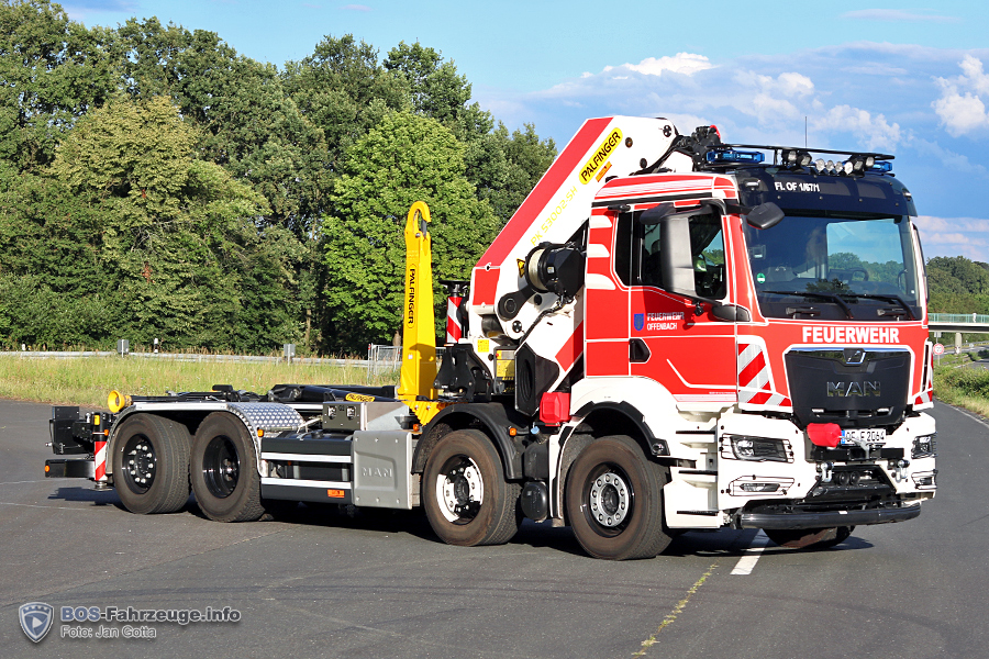 Als Nachfolger für den 1989 gebauten KRUPP-Feuerwehrkran (FwK 30) beschaffte die Feuerwehr Offenbach am Main ein Wechselladerfahrzeug mit Ladekran. Das Fahrzeug basiert auf einem MAN TGS 35.430 8x2-6 BL Fahrgestell und wurde von der Firma BAITZ Fahrzeugbau GmbH aus Obertshausen mit einer Palfinger PH T20 SLD 5 Wechselladeeinrichtung sowie einem Palfinger PK 53002 SH-E Ladekran ausgestattet. Dieser Ladekran hat bei 4 Meter Ausladung ein Hubkraft von 10.400 kg. Selbst im voll ausgezogenen Zustand kann der Kran bei 16 Meter Ausladung immer noch eine Last von 2.450 kg anheben. Nach dem Einbau des Ladekrans, erfolgte der Einbau einer Seilwinde bei Rotzler vom Typ Rotzler Treibmatic TR 080/7. Die Seilwinde verfügt über eine Seillänge von 90 Metern und hat eine Zugkraft von 80 kN. Der feuerwehrtechnische Auf- und Ausbau erfolgte dann in Boppard (Rheinland-Pfalz) durch die Firma BOS Systemtechnik GmbH. Hier erhielt das WLF-Kran seine Sondersignalanlage aus dem Hause Hänsch inkl. Astabweiser, die Funktechnik sowie Staukästen und Halterungen zur Unterbringung des mitgeführten Materials. Ende Mai 2024 wurde das Fahrzeug schließlich abgenommen und nach Offenbach überführt. Nach einer ausführlichen Einweisung, dem Kranschein und der Schulung der Maschinisten am Fahrzeug durch die Firma Ladekran Untermain, konnte das Fahrzeug schließlich im September in Dienst gestellt werden. Seither ist das Fahrzeug fester Bestandteil des Unfallzuges der Feuerwehr Offenbach am Main.