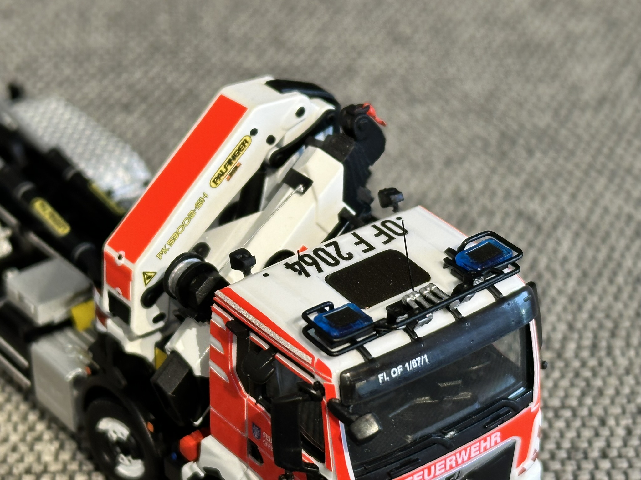 Das Modell basiert auf zwei Fahrgestellen aus dem Hause Herpa Miniaturmodelle GmbH. Diese wurden geteilt und mit angepasstem Radstand wieder zusammengesetzt. Die Kabine des MAN TGS sowie die Bereifung stammen ebenfalls von Herpa. Der Palfinger Ladekran stammt von Elbe-Modell (EM178) und ist ein unbeweglicher 3D-Druck Bausatz. Weiterhin wurde das Modell durch die markanten Riffelblechkotflügel an den Hinterachsen von MMH-modellbau ausgestattet. Staukästen und Anbautanks lieferte DS-Design. Viele Details wie die Seilwindentrommel mit Seilführung, die Unterlegplatten für die Abstützung, die Abstützung selbst wurden aus Evergreen-Profilen erstellt. Eine besondere Herausforderung waren die Astabweiser auf der Kabine. Da es hierfür keinerlei Bauteile aus der Großserie gibt, wurde dieser aus Messingprofilen selbst gebaut. Die Blaulichtbalkenmodule (Hänsch DBS 850) wurden für uns von Flavio Huneke als 3D-Teil gezeichnet und in blauem (transparenten) Resin gedruckt. Anschließend wurden die Einzelteile lackiert und zusammengebaut. Die Decals am Modell wurden selbst gezeichnet und anschließend der Druck in Auftrag gegeben. Nach der Lieferung und der Anbringung der Decals wurde das Modell schließlich komplettiert und die letzten Details angebracht.