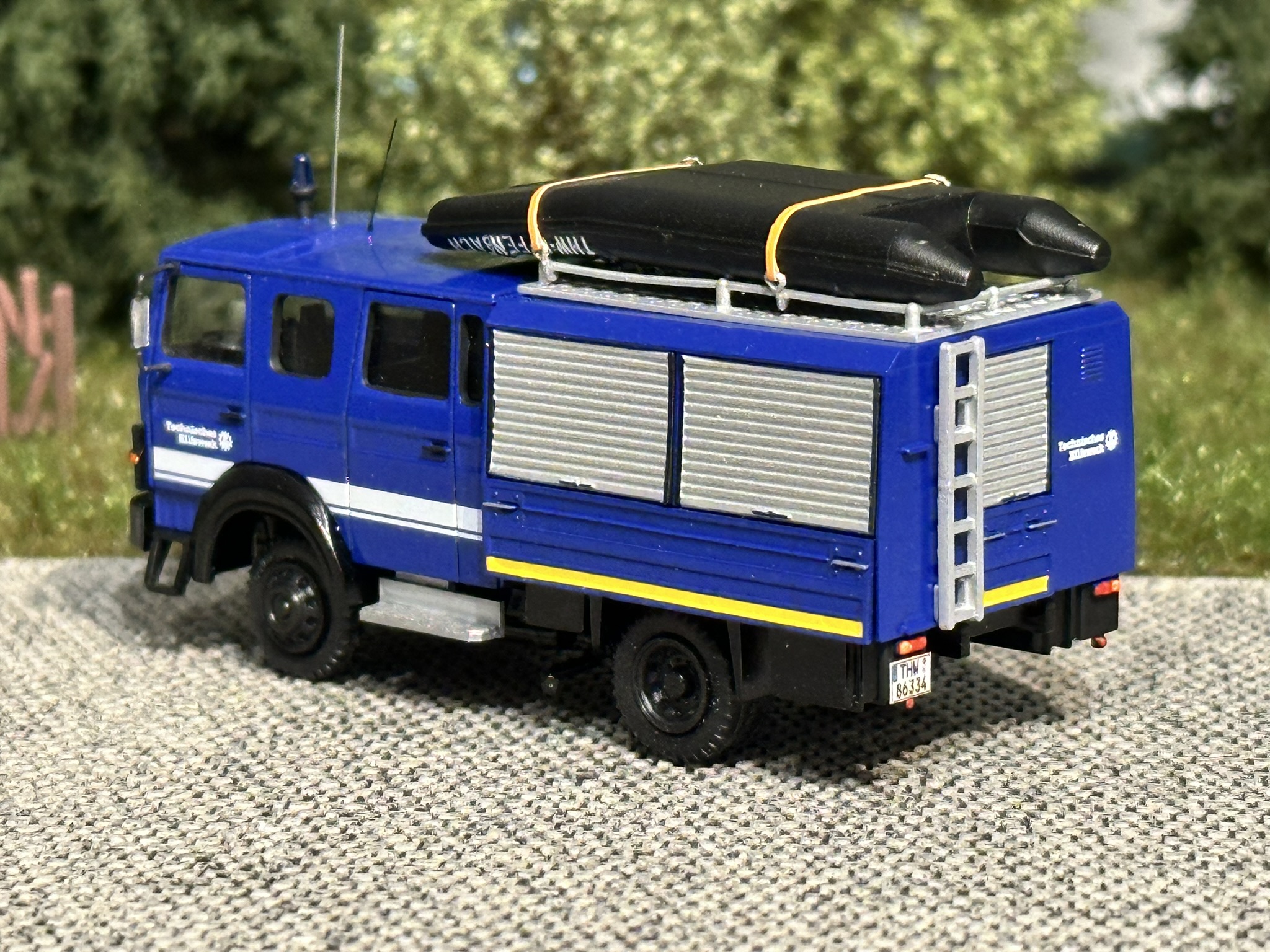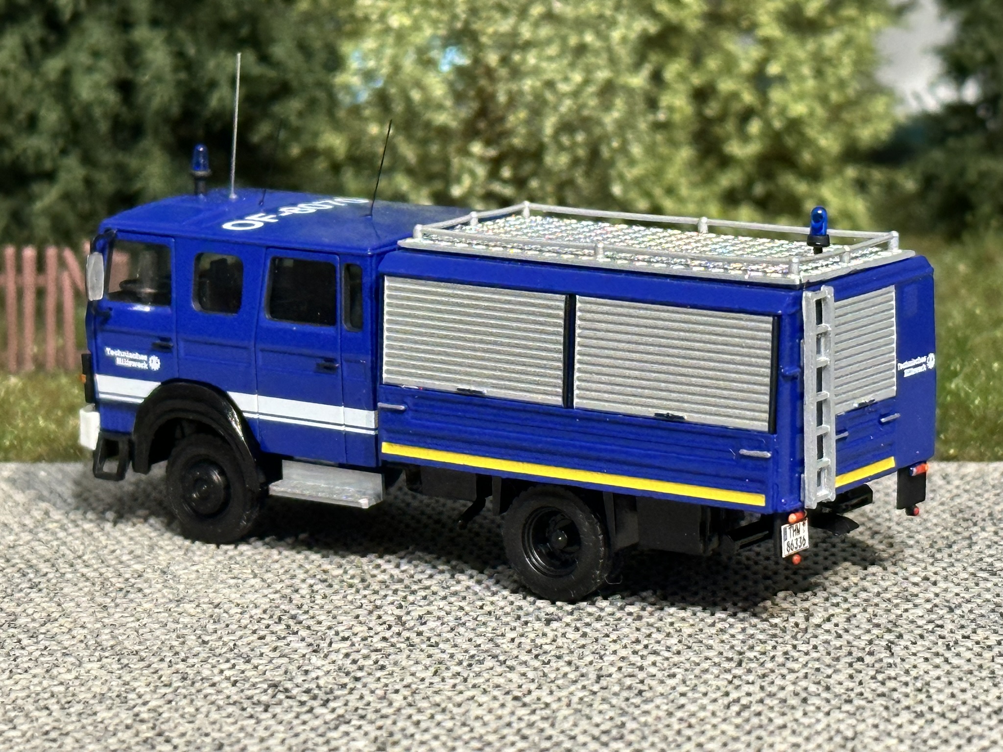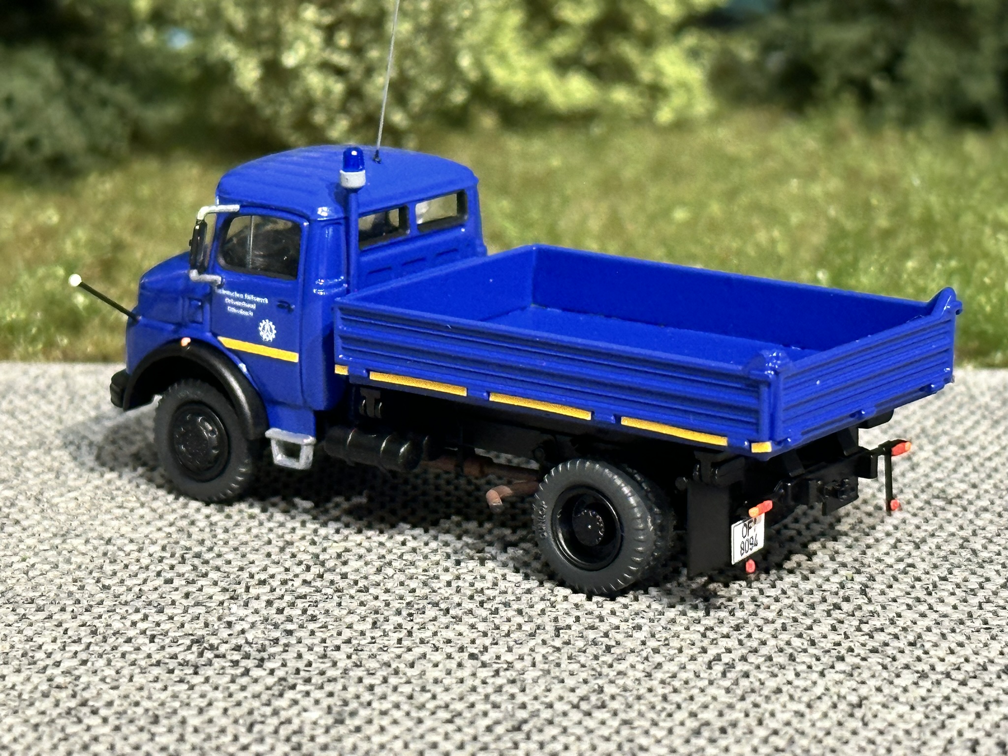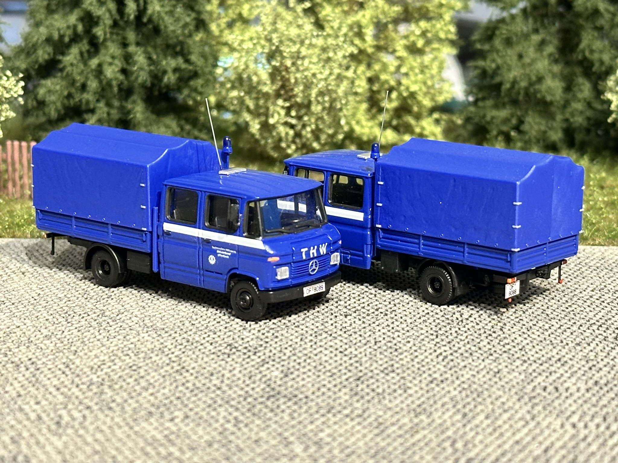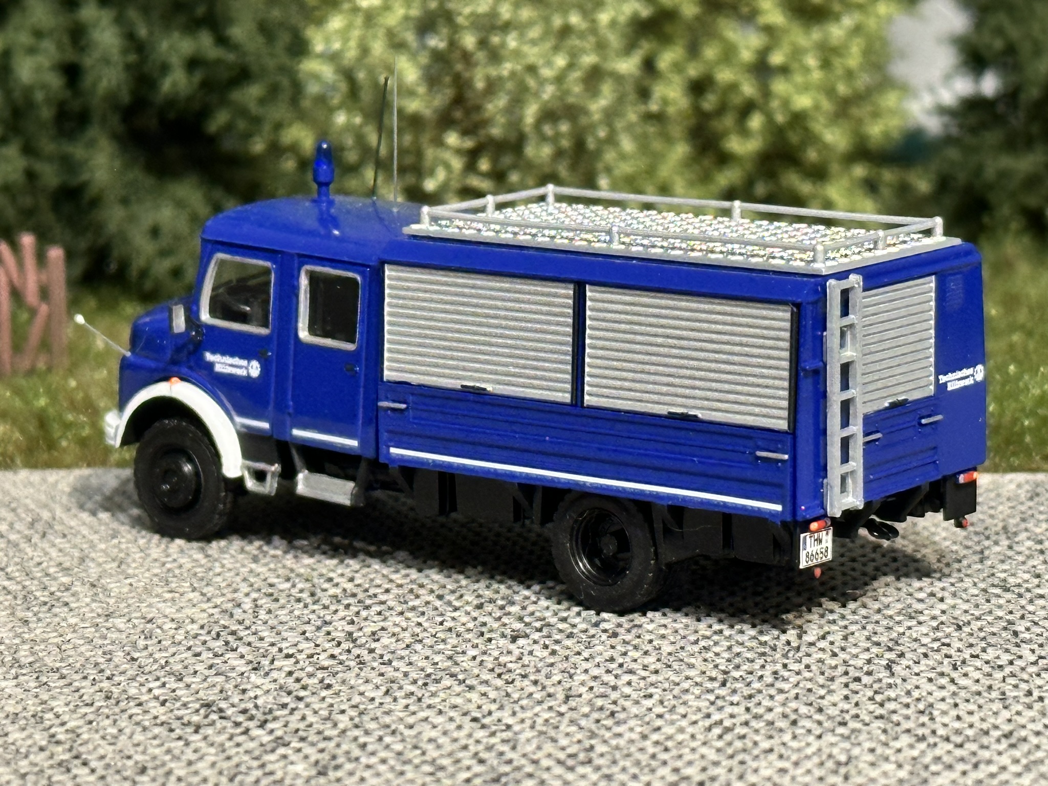 Zum Modell: Es handelt sich hier, wie erwartet um die Preiser Modelle. Die Blaulichtsockel auf dem Kabinendach wurden verschliffen, eine neue Stange für die Blaulichter an der Kabinenrückwand angebracht. Am Heck wurde der Unterfahrschutz entfernt, die Scheinwerferhalterung nach oben versetzt, Halter für die Reflektoren und das Kennzeichen angebracht und eine Anhängerkupplung von MMH verbaut.